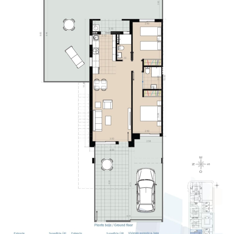 Additionally, the ground-floor bungalows and solariums feature hot and cold water showers, while all homes benefit from an energy-efficient aerothermal system for hot water.