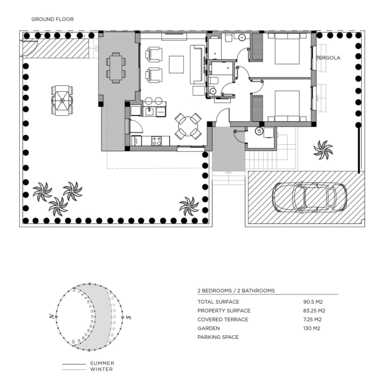 Modern townhouses build over 2 floors and has 3 bedrooms, 2 bathrooms, open plan kitchen and the lounge area, fitted wardrobes, terraces, private garden and solarium.