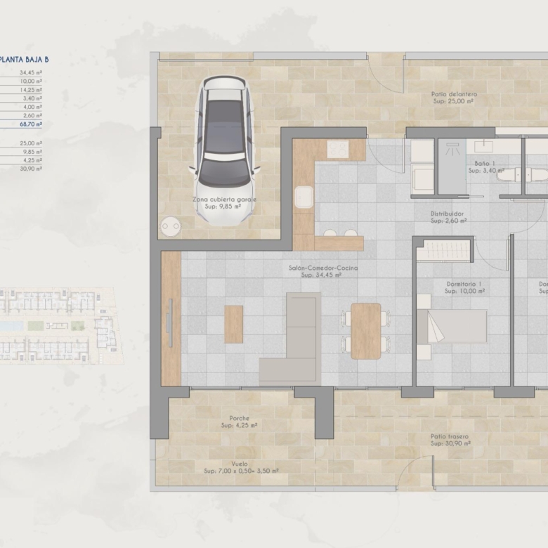 Discover a new residential complex in Torre-Pacheco, offering 24 stylish bungalows with 2 or 3 bedrooms. Choose between ground-floor homes with spacious terraces or first-floor units boasting private terraces and solariums. Each solarium includes a pergola, a barbecue area, and reinforced roofing, perfect for installing a jacuzzi. All homes come with a designated parking space and fully installed air conditioning, ensuring comfort year-round.