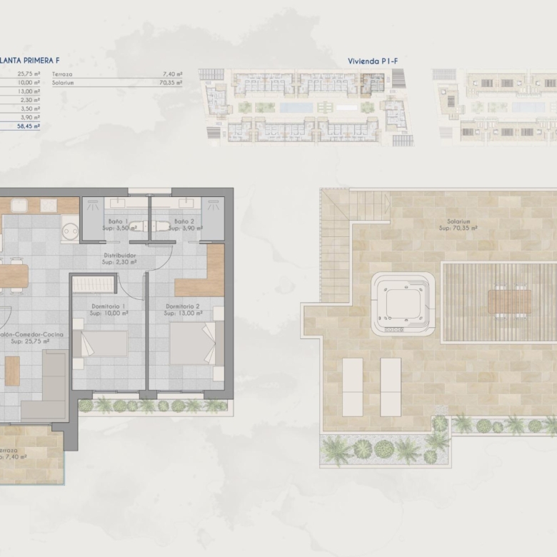 Discover a new residential complex in Torre-Pacheco, offering 24 stylish bungalows with 2 or 3 bedrooms. Choose between ground-floor homes with spacious terraces or first-floor units boasting private terraces and solariums. Each solarium includes a pergola, a barbecue area, and reinforced roofing, perfect for installing a jacuzzi. All homes come with a designated parking space and fully installed air conditioning, ensuring comfort year-round.