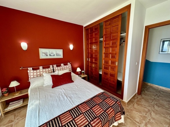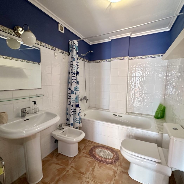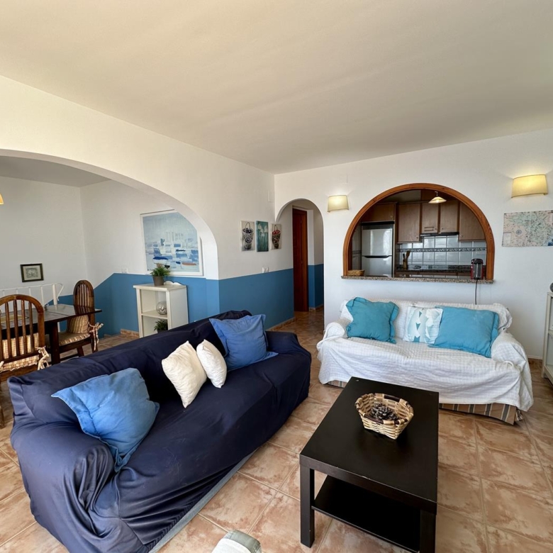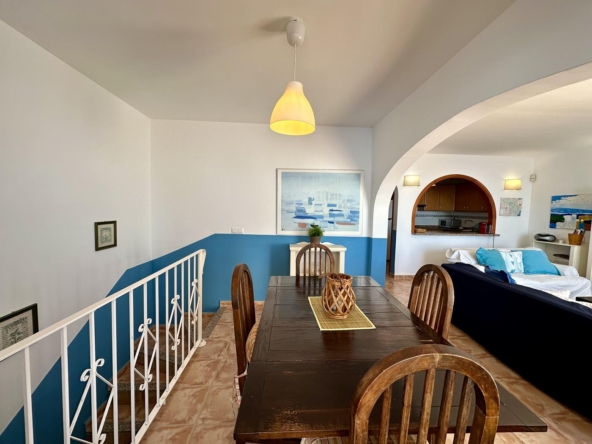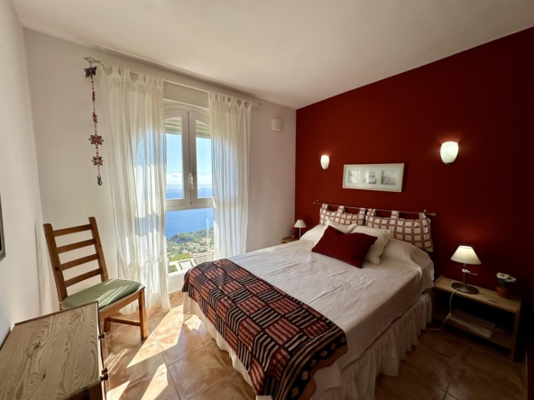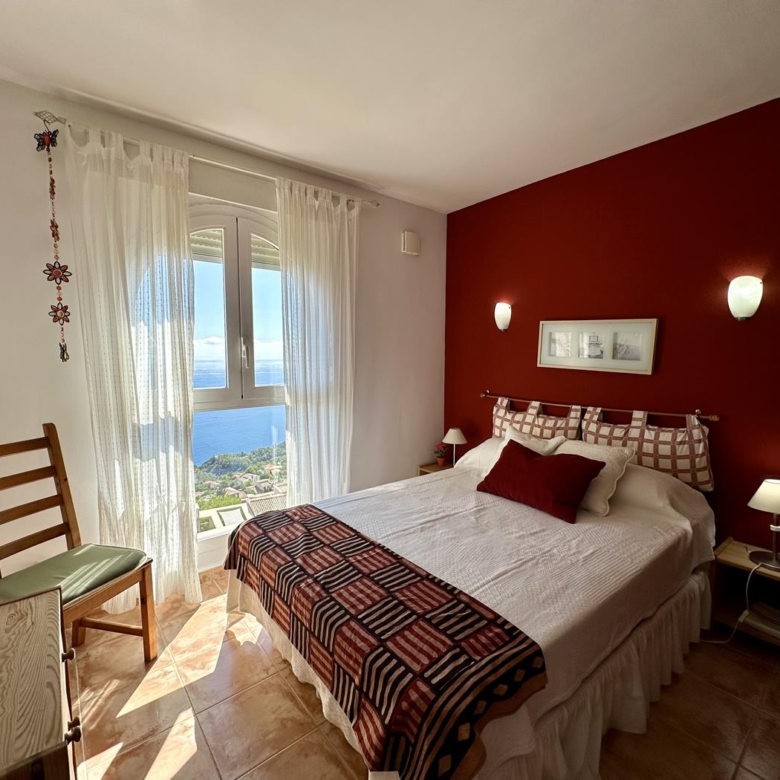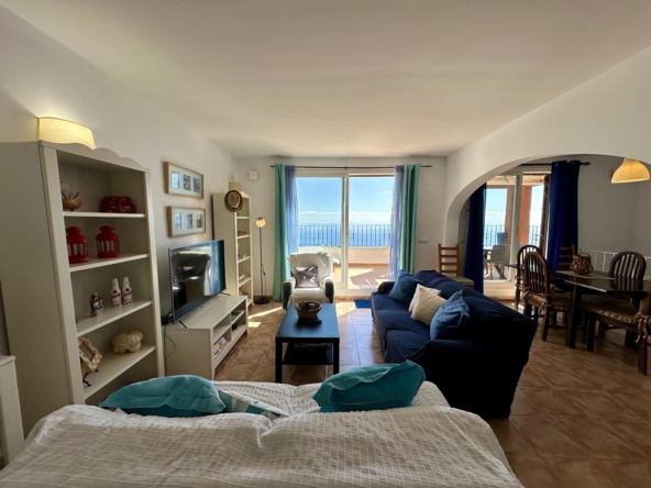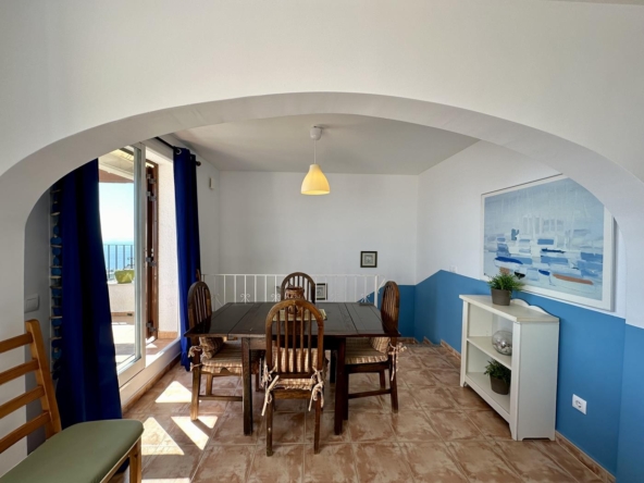 On the main floor (66 m²) we find the living / dining room with TV, bedroom with double bed and fitted wardrobes, open kitchen, a bathroom with bathtub and terrace of 20 m² with panoramic sea views, pergola and awning.