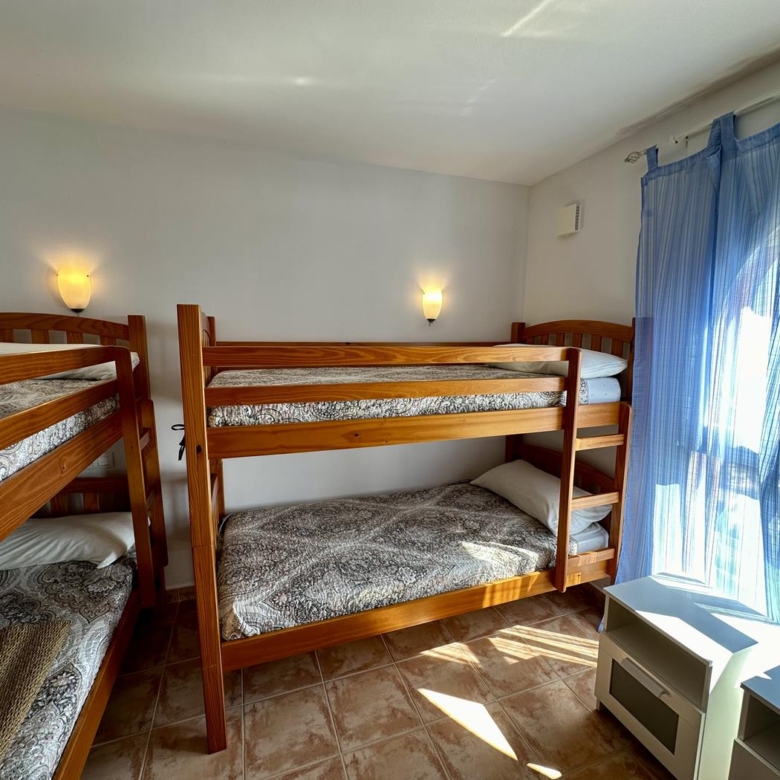 On the ground floor (39 m²) you have a bedroom with double bed and fitted wardrobes, a bedroom with 2 bunk beds with fitted wardrobes, and a bathroom with bathtub.