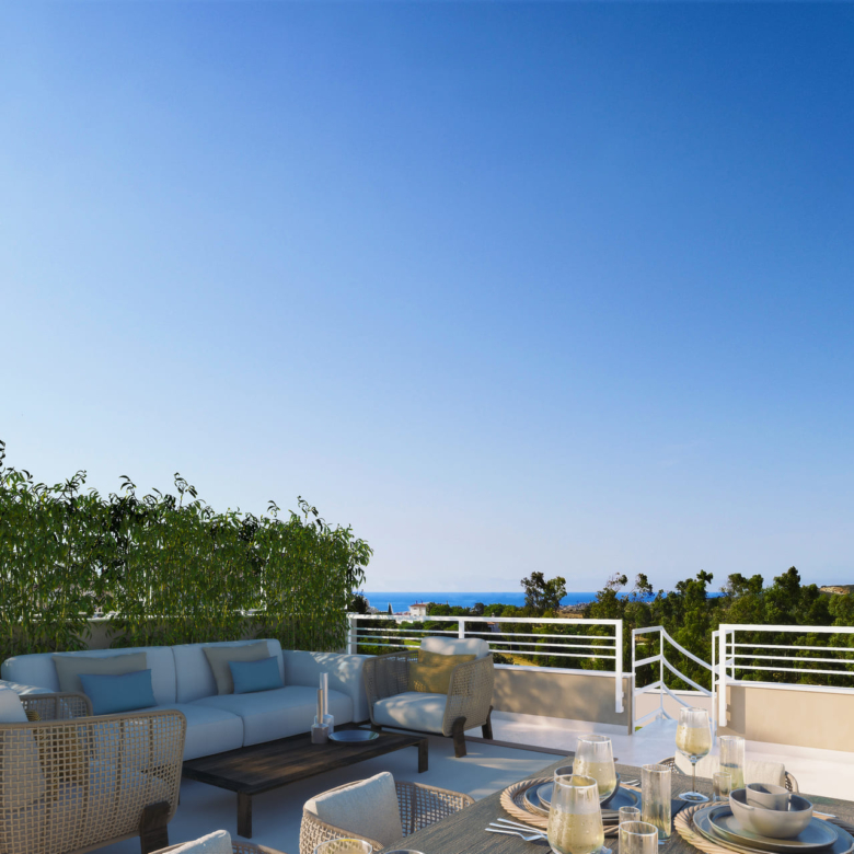 The exteriors of this residential in Estepona have been designed to offer an exceptional living environment. The properties feature terraces that allow you to enjoy panoramic views and the Mediterranean climate all year round. Additionally, the proximity to the sea, just 4 km, offers the possibility to enjoy coastal walks and water activities. The proximity to the golf course, just 20 meters, provides unparalleled access for golf enthusiasts, allowing them to enjoy this sport in a natural and exclusive setting.