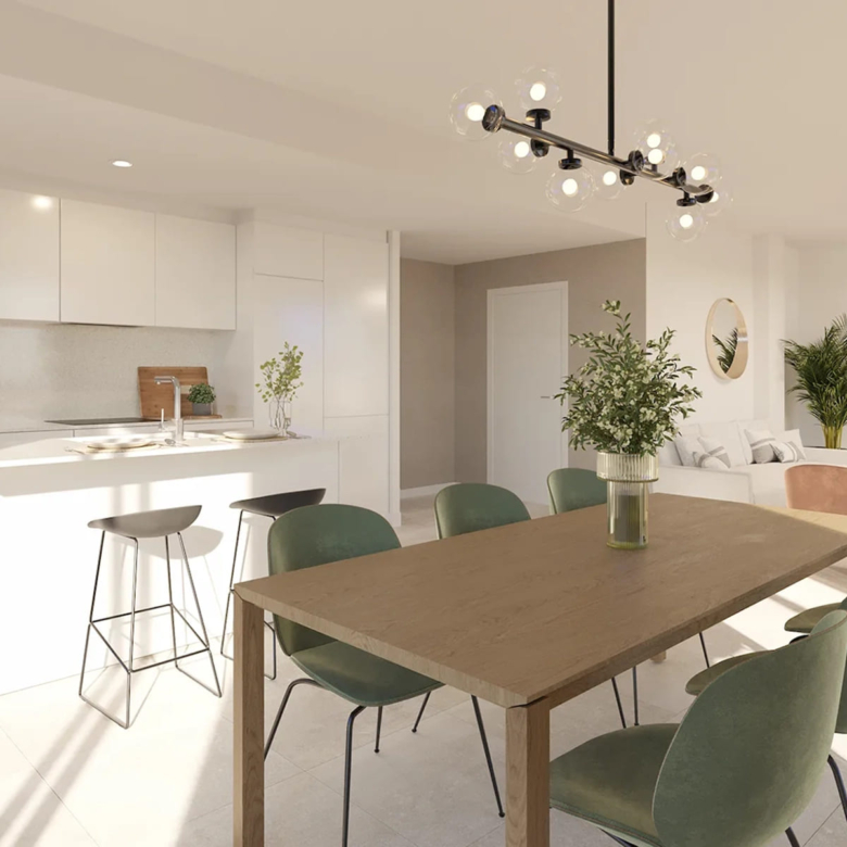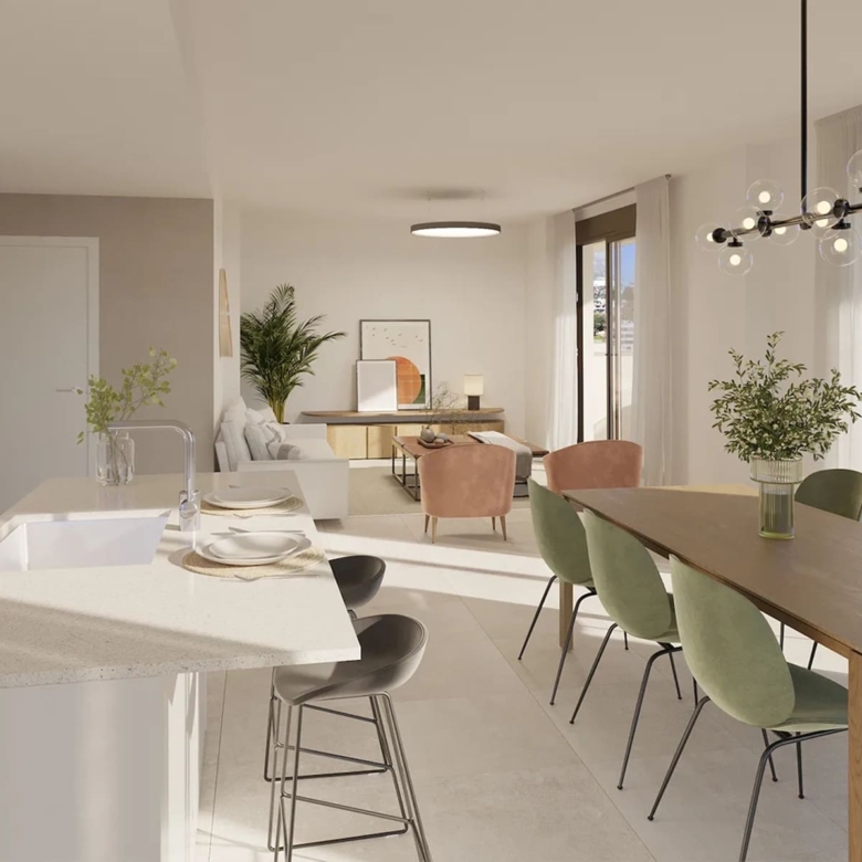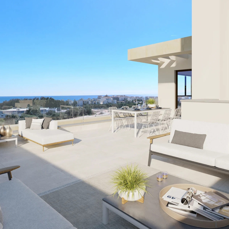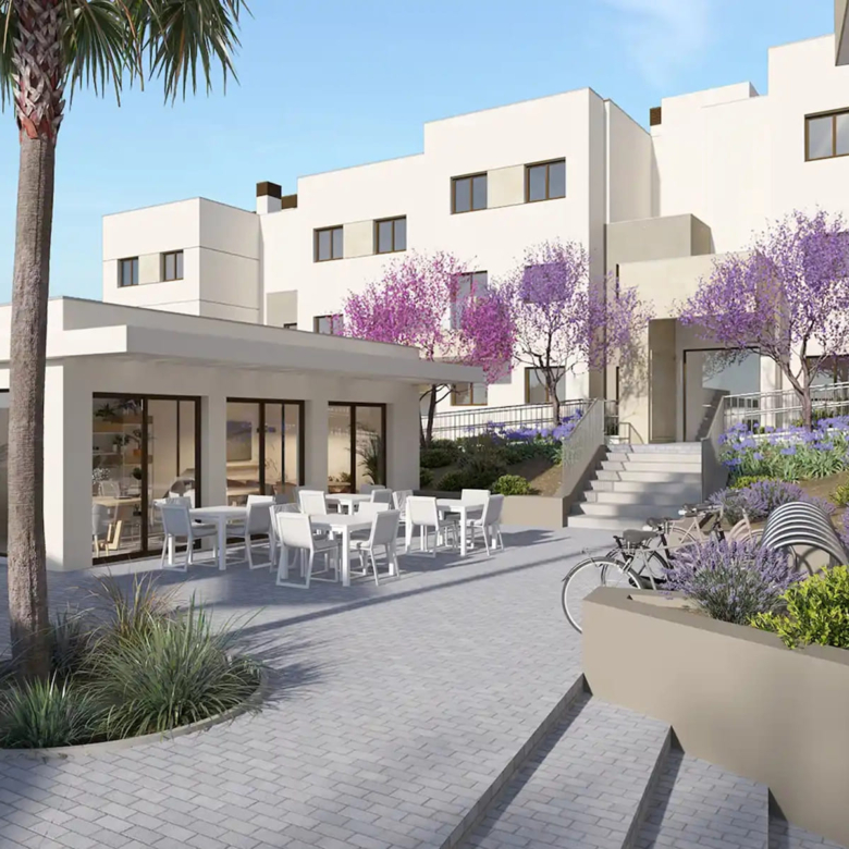 The exteriors of this residential in Estepona are designed to make the most of the natural surroundings and the region’s privileged climate. Ground-floor homes feature private gardens, ideal for enjoying outdoor moments in an intimate and welcoming setting. Additionally, all properties have terraces that offer additional space for leisure and relaxation, allowing for the enjoyment of views and the Mediterranean climate. The penthouses, on the other hand, include private solariums, perfect for sunbathing with total privacy. The proximity to the sea, just 1 km away, adds invaluable value to the living experience here, allowing for coastal walks and water activities.