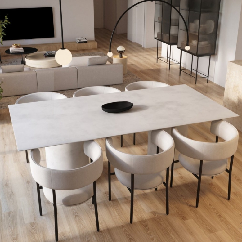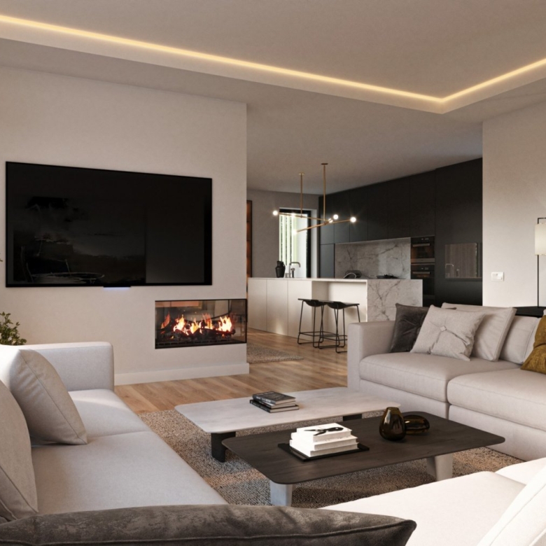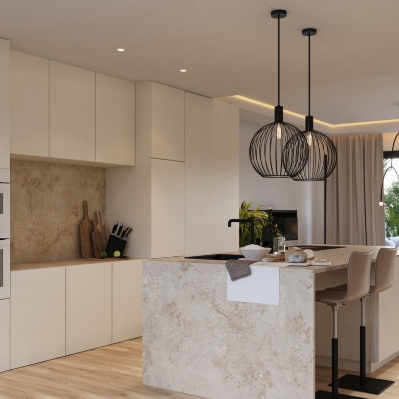 The open kitchen, dining area and living room benefits from the natural light from the big windows to the terraces overlooking the communal area and the green surroundings.