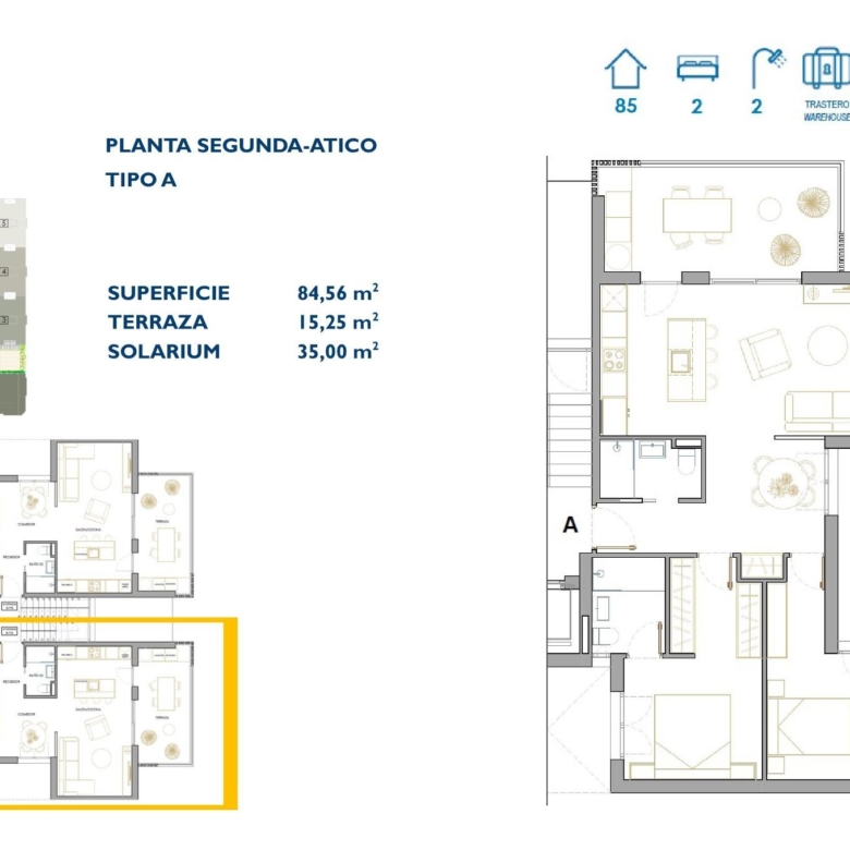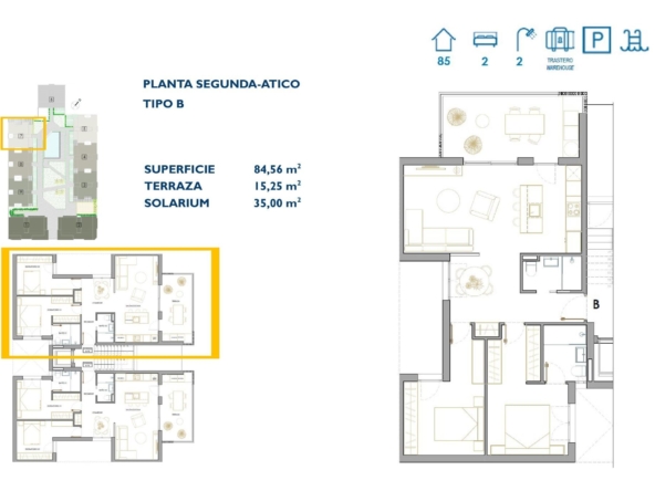 Apartments and penthouses with 2 and 3 bedrooms, 2 bathrooms, with open plan kitchen with living area, large terraces, fitted wardrobes, fully equipped bathrooms, terraces.