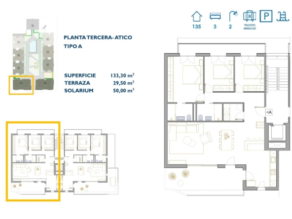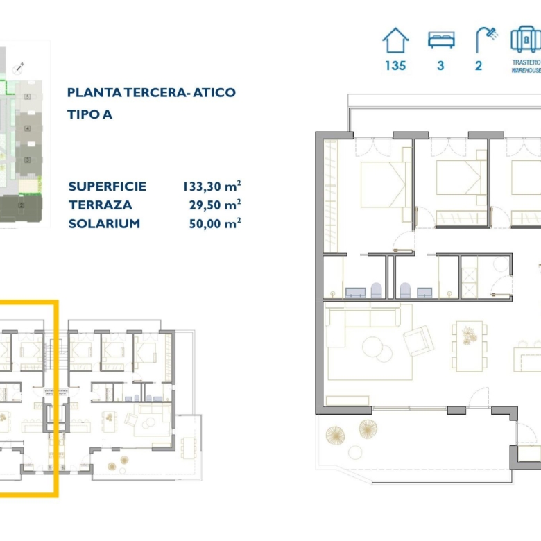 Apartments and penthouses with 2 and 3 bedrooms, 2 bathrooms, with open plan kitchen with living area, large terraces, fitted wardrobes, fully equipped bathrooms, terraces.