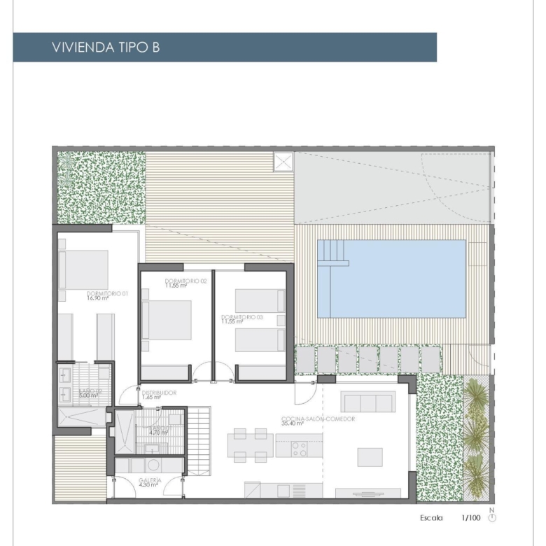 Modern properties with 3 bedrooms and 2 bathrooms, open plan kitchen with living area, fitted wardrobes, terrace, private garden and underground parking in the basement.
