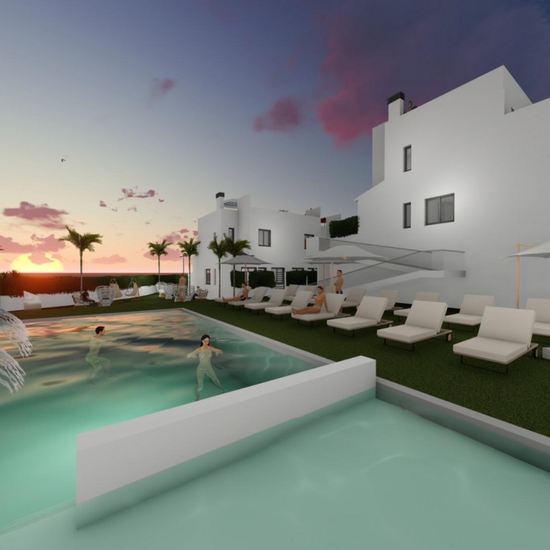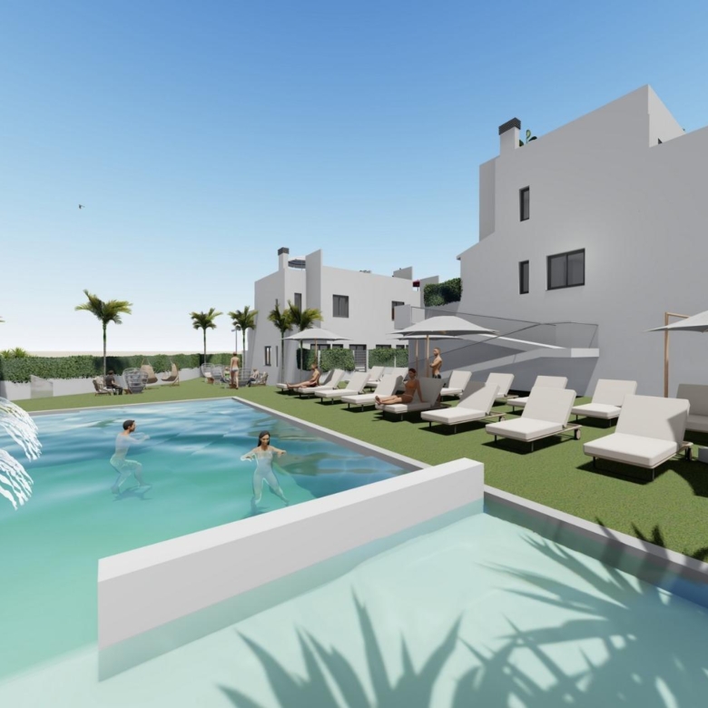 Discover a new residential development of 44 modern townhouses in Cox, Alicante. These homes are available in 2- and 3-bedroom layouts, each featuring a private solarium, terraces, patios, and private parking. The community offers access to shared areas, including a communal swimming pool, creating an ideal environment for relaxation.