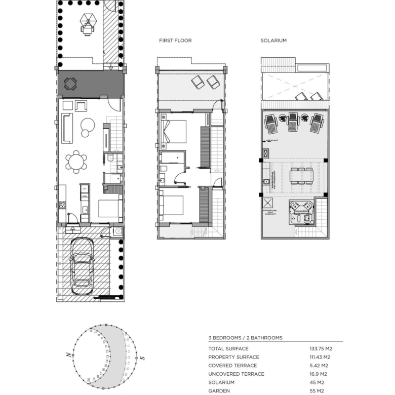 Modern townhouses build over 2 floors and has 3 bedrooms, 2 bathrooms, open plan kitchen and the lounge area, fitted wardrobes, terraces, private garden and solarium.
