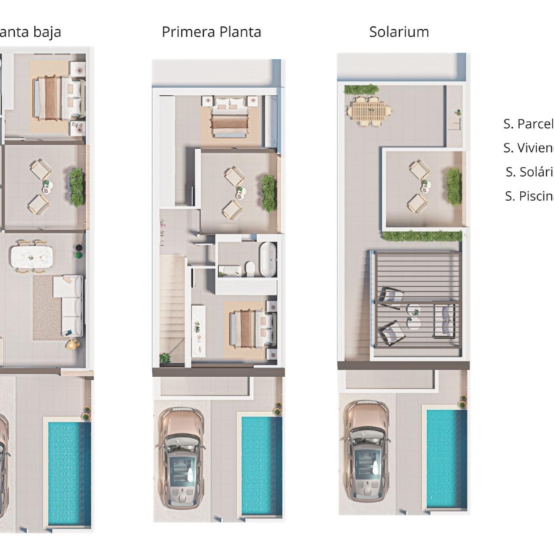 Each townhouse boasts three bedrooms, two bathrooms, a private swimming pool, a spacious terrace, an interior patio, a rooftop solarium, and private parking. The properties are equipped with modern kitchens and bathrooms, pre-installed air conditioning, and high-quality finishes. Additional highlights include: