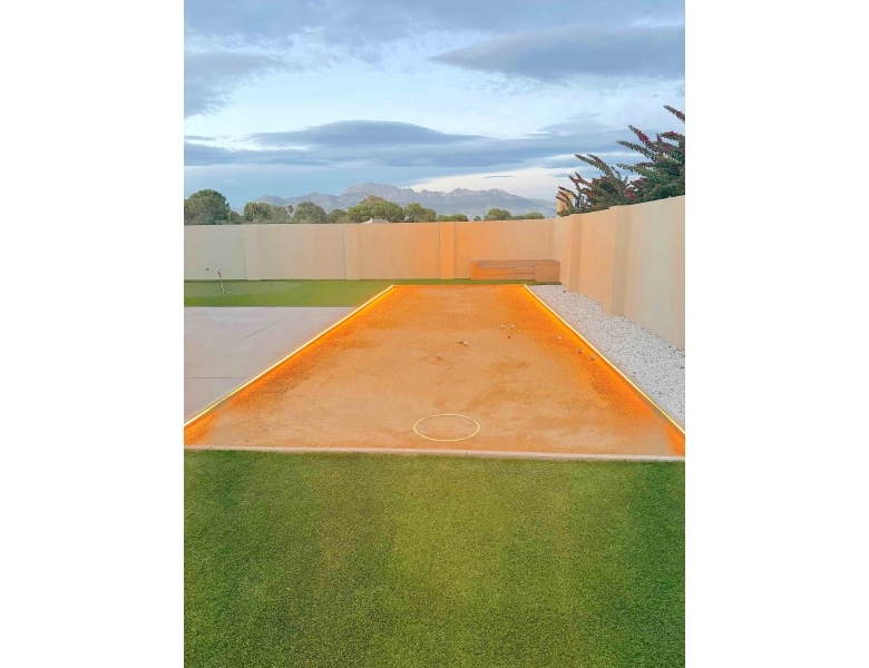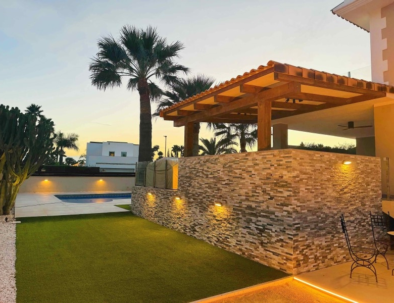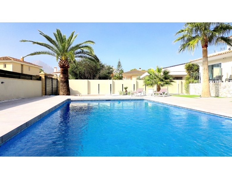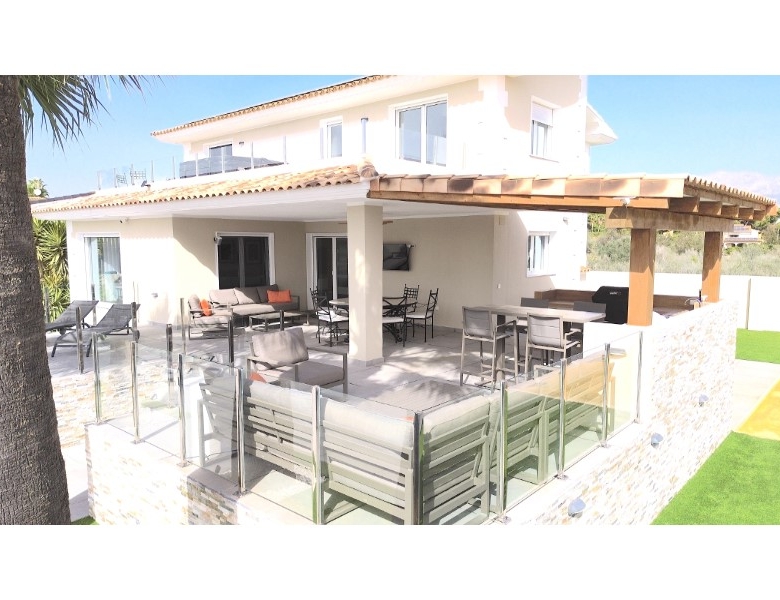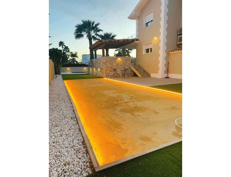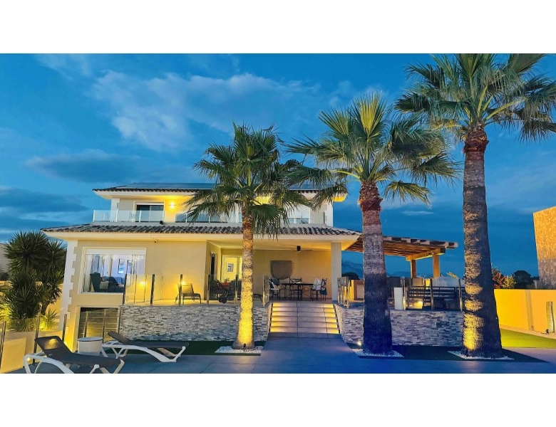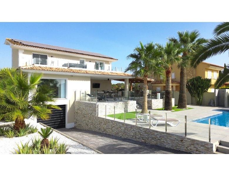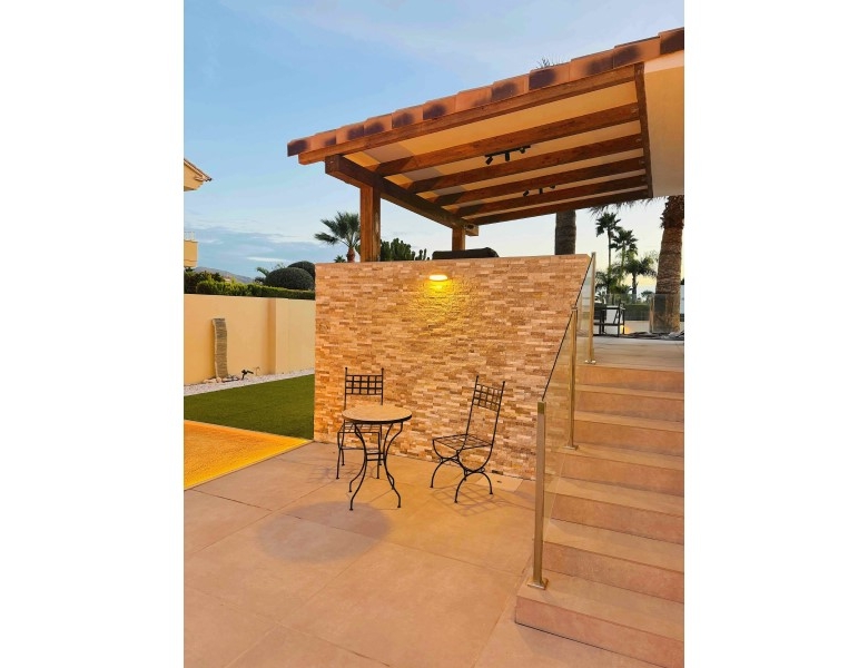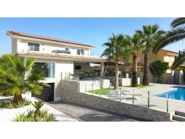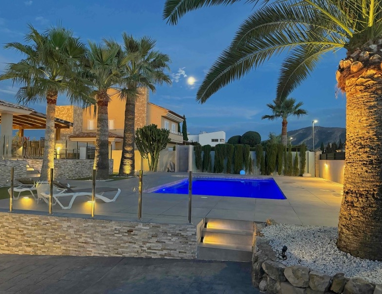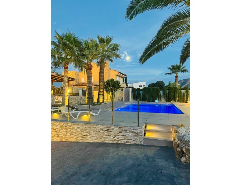 Are you looking for a dream home in Spain? Then have a look at this fantastic villa in Alfas del Pi, which is only minutes from the beach and 15 minutes from Benidorm. This villa has everything you could want in terms of comfort, design and quality.The villa was completely renovated in 2023, and has a modern and elegant look. The home has a living area of 350 square metres, spread over two floors and the basement.On the first floor, you will find a spacious living room combined with a dining room, which has large windows that let in a lot of light. There are integrated LED lights in the ceiling for atmospheric evenings. Here, there is also an open kitchen with integrated white goods and a large island. In addition, there is a bedroom/office, a separate bathroom and a great hall that includes stairs from the basement to the 2nd floor. There is direct access from the garage in the basement into the house.On the second floor there are three bedrooms, two with en-suite bathrooms and wardrobes. The main bedroom also has a walk-in closet and a private terrace overlooking the garden and pool. On the terrace there is a jacuzzi with a view of the Benidorm skyline.The outdoor area is just as impressive as the indoor area. Here you have a large plot of 1250 square meters, with a well-kept garden, a terrace with a dining area, a pergola with a seating area, and an outdoor kitchen with a grill and a sink with both hot and cold water. The most eye-catching feature is the beautiful pool, which has a length of 11 meters and a width of 5 meters. The pool has lighting that creates a magical atmosphere in the evening. There is also a play area with a bowls court that has LED lighting and a putting green for golf.The villa has many other features, such as underfloor heating, air conditioning, filtered water that allows you to drink tap water, an alarm system, a garage, a storage room, electric blinds, double glazing, etc. A solar cell system has been installed on the roof with a large battery pack so that you are self-sufficient in electricity. The villa is also fully furnished and ready to move into.This villa is a unique opportunity for those who want a luxurious and modern home in a quiet and safe area, but at the same time close to all facilities and attractions.