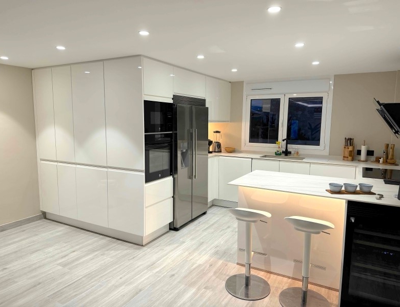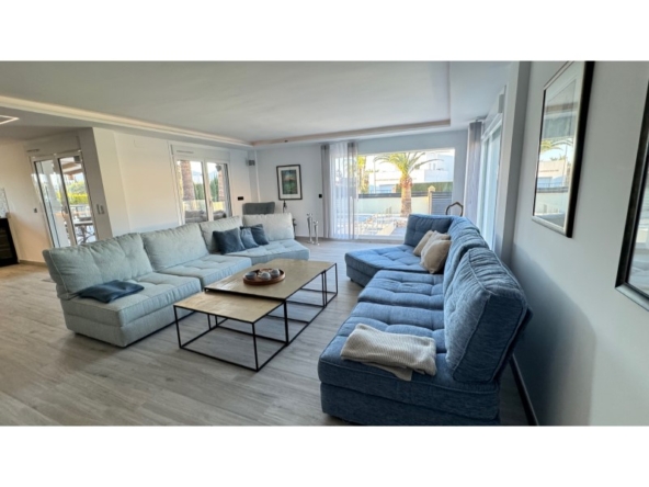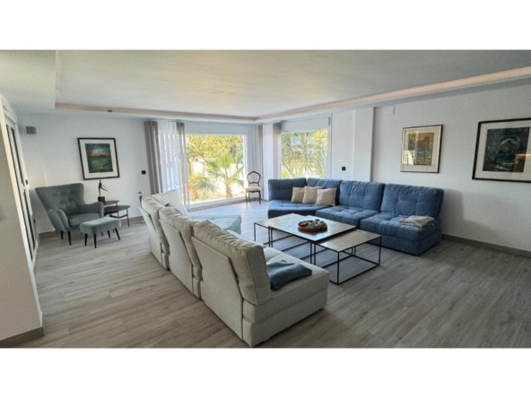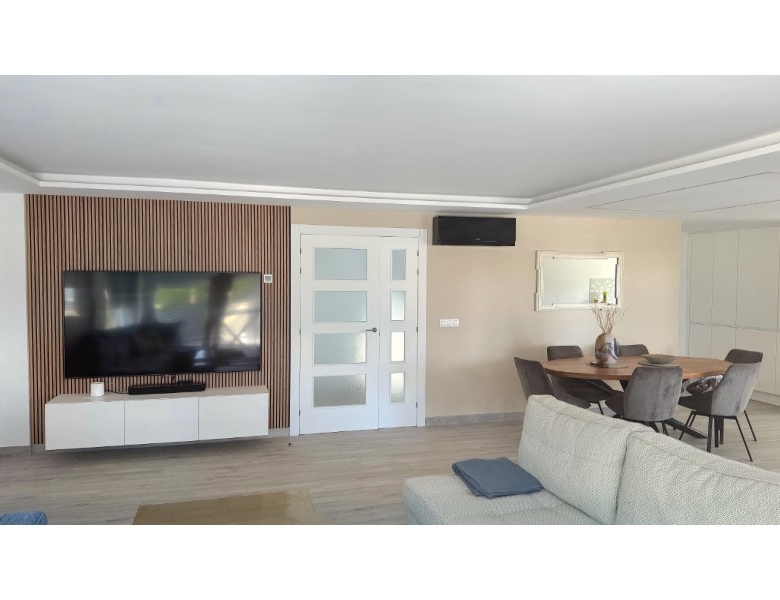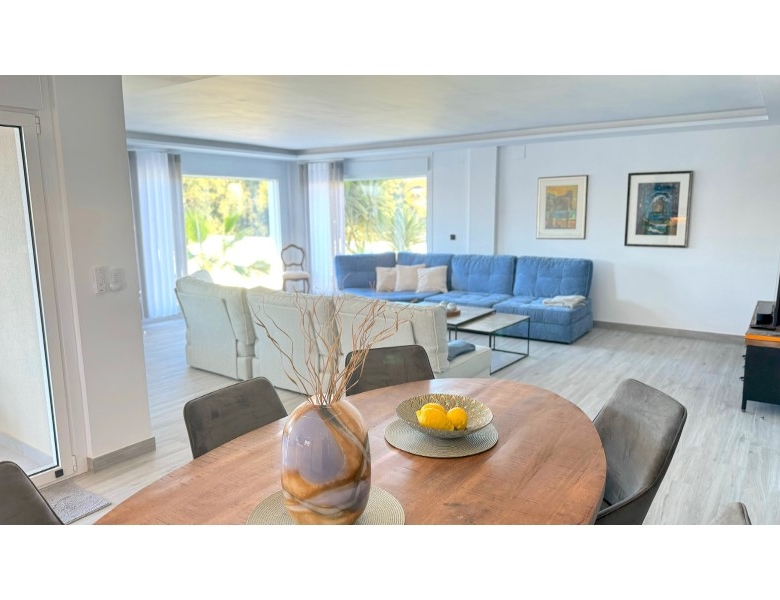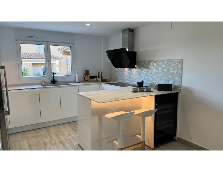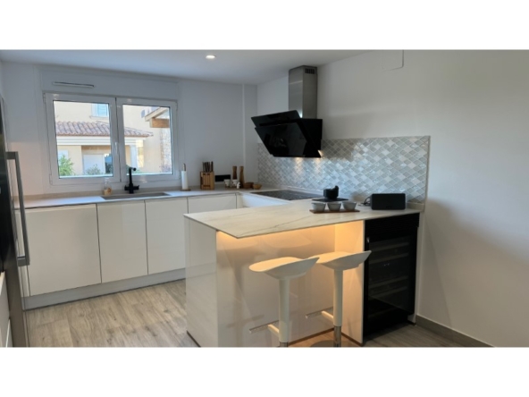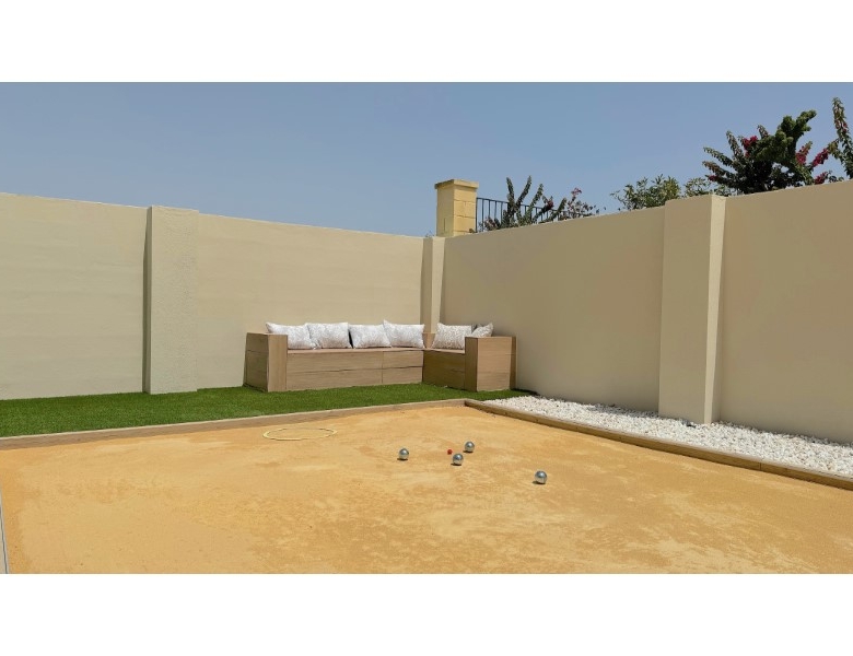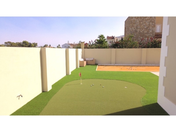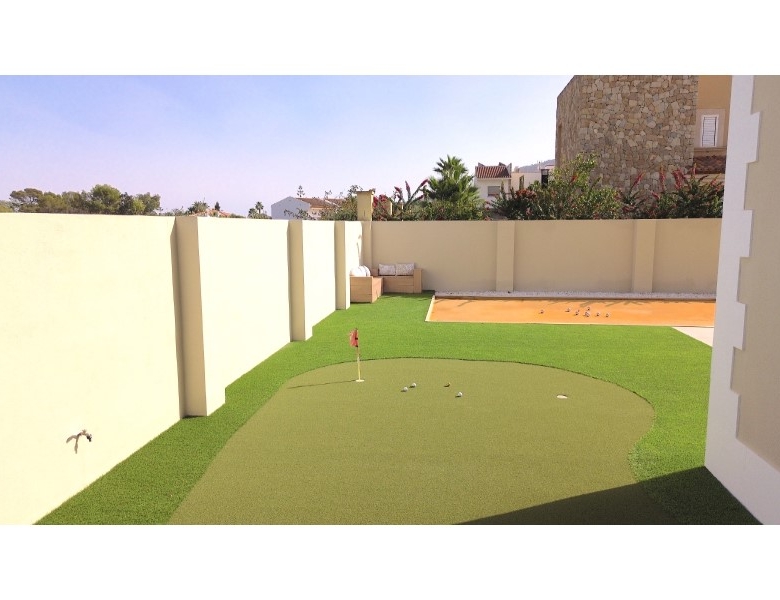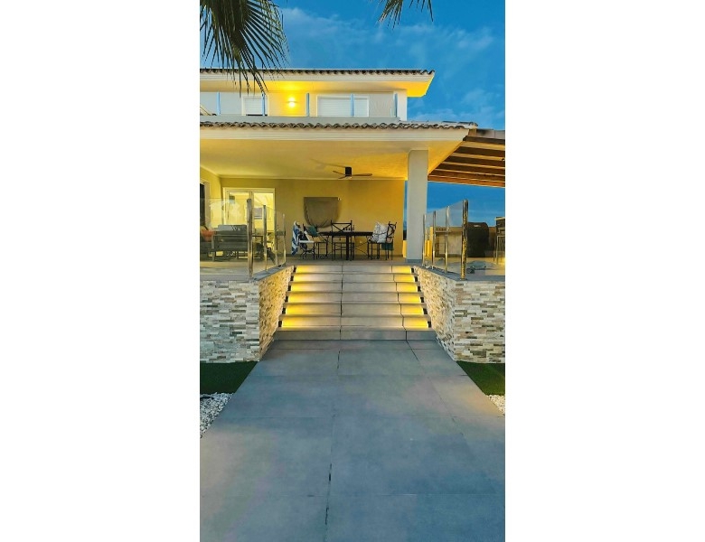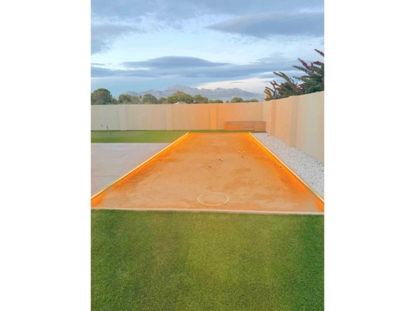 Are you looking for a dream home in Spain? Then have a look at this fantastic villa in Alfas del Pi, which is only minutes from the beach and 15 minutes from Benidorm. This villa has everything you could want in terms of comfort, design and quality.The villa was completely renovated in 2023, and has a modern and elegant look. The home has a living area of 350 square metres, spread over two floors and the basement.On the first floor, you will find a spacious living room combined with a dining room, which has large windows that let in a lot of light. There are integrated LED lights in the ceiling for atmospheric evenings. Here, there is also an open kitchen with integrated white goods and a large island. In addition, there is a bedroom/office, a separate bathroom and a great hall that includes stairs from the basement to the 2nd floor. There is direct access from the garage in the basement into the house.On the second floor there are three bedrooms, two with en-suite bathrooms and wardrobes. The main bedroom also has a walk-in closet and a private terrace overlooking the garden and pool. On the terrace there is a jacuzzi with a view of the Benidorm skyline.The outdoor area is just as impressive as the indoor area. Here you have a large plot of 1250 square meters, with a well-kept garden, a terrace with a dining area, a pergola with a seating area, and an outdoor kitchen with a grill and a sink with both hot and cold water. The most eye-catching feature is the beautiful pool, which has a length of 11 meters and a width of 5 meters. The pool has lighting that creates a magical atmosphere in the evening. There is also a play area with a bowls court that has LED lighting and a putting green for golf.The villa has many other features, such as underfloor heating, air conditioning, filtered water that allows you to drink tap water, an alarm system, a garage, a storage room, electric blinds, double glazing, etc. A solar cell system has been installed on the roof with a large battery pack so that you are self-sufficient in electricity. The villa is also fully furnished and ready to move into.This villa is a unique opportunity for those who want a luxurious and modern home in a quiet and safe area, but at the same time close to all facilities and attractions.