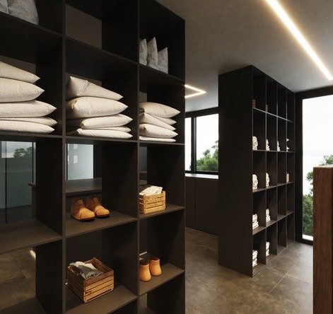 Light penetrates through the large windows and invades every corner of the house, dimensioned by the presence of white and translucent materials.