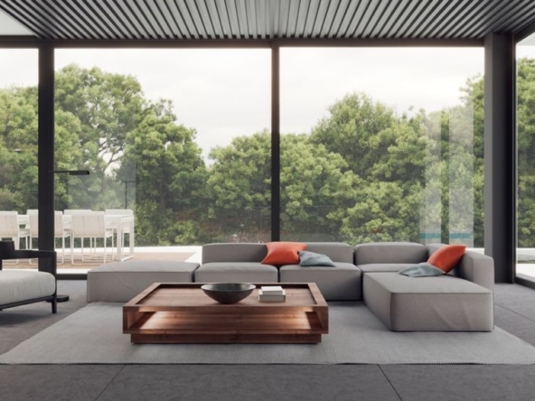 The orientation of the rooms and the presence of the large windows favor a permanent coexistence between the interior and exterior of the house, allowing the fusion of the environments and forming part of a single visual space.