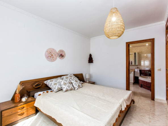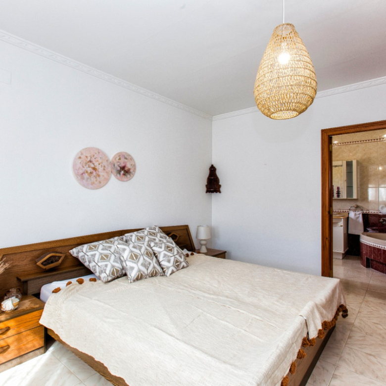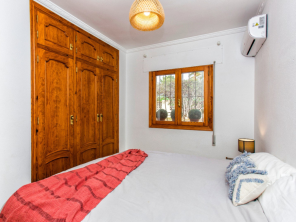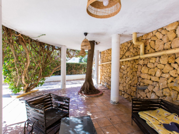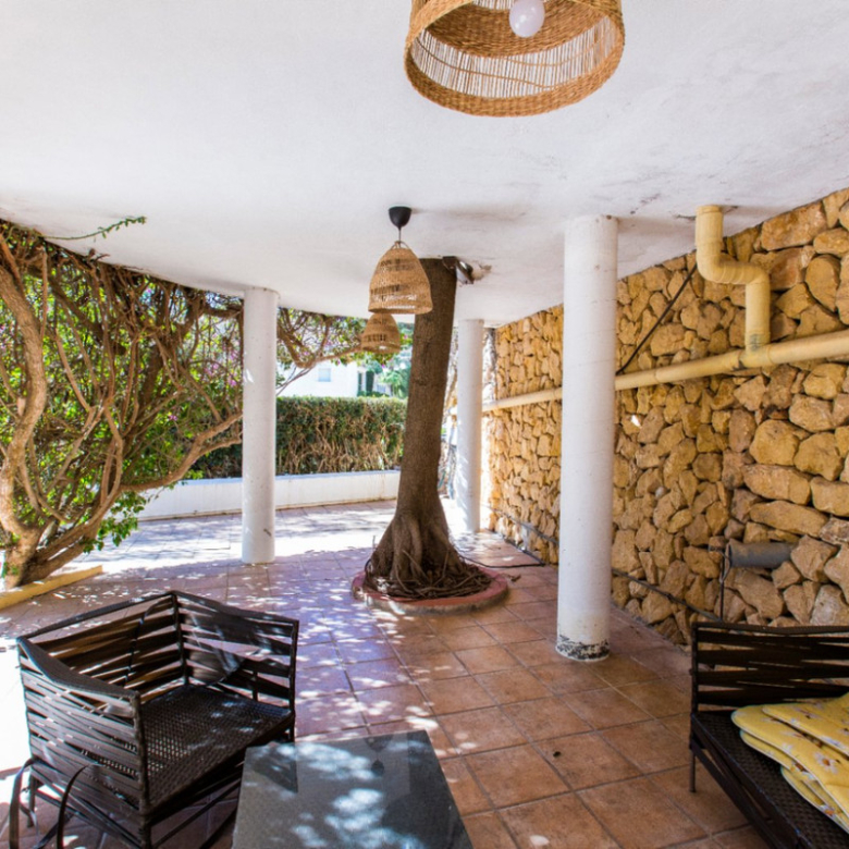 What makes this villa really special is the beautiful, lush garden. Here you will find several inviting sitting areas, well-kept lawns and mature trees, including many mature palm trees. Around the pool stretches a spacious sun terrace, ideal for placing sunbeds. The ‘hidden’ covered terrace, surrounded by greenery, offers a quiet place to relax. The unique detail here is a tree growing through the roof of the terrace, a beautiful natural element.