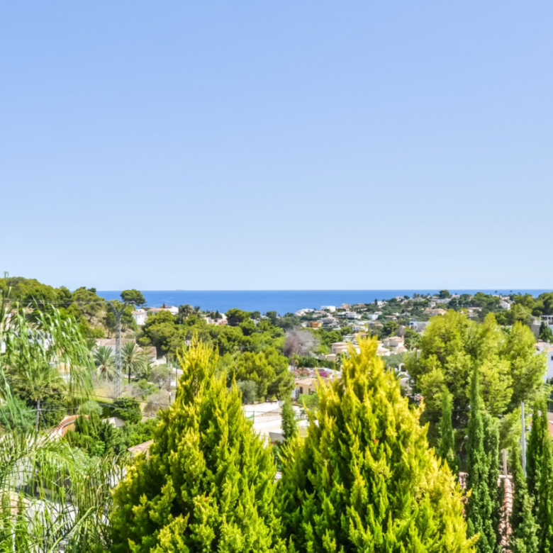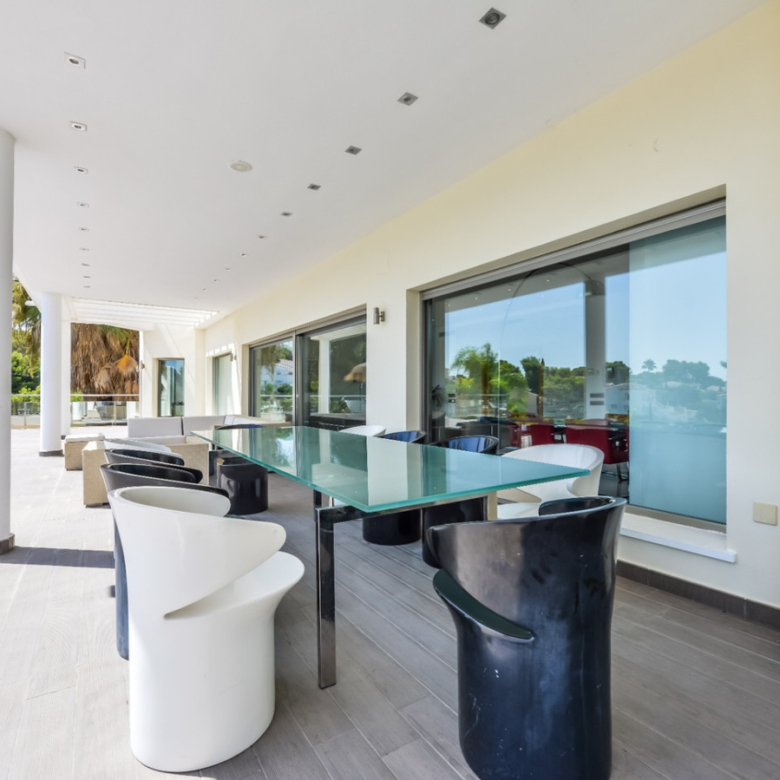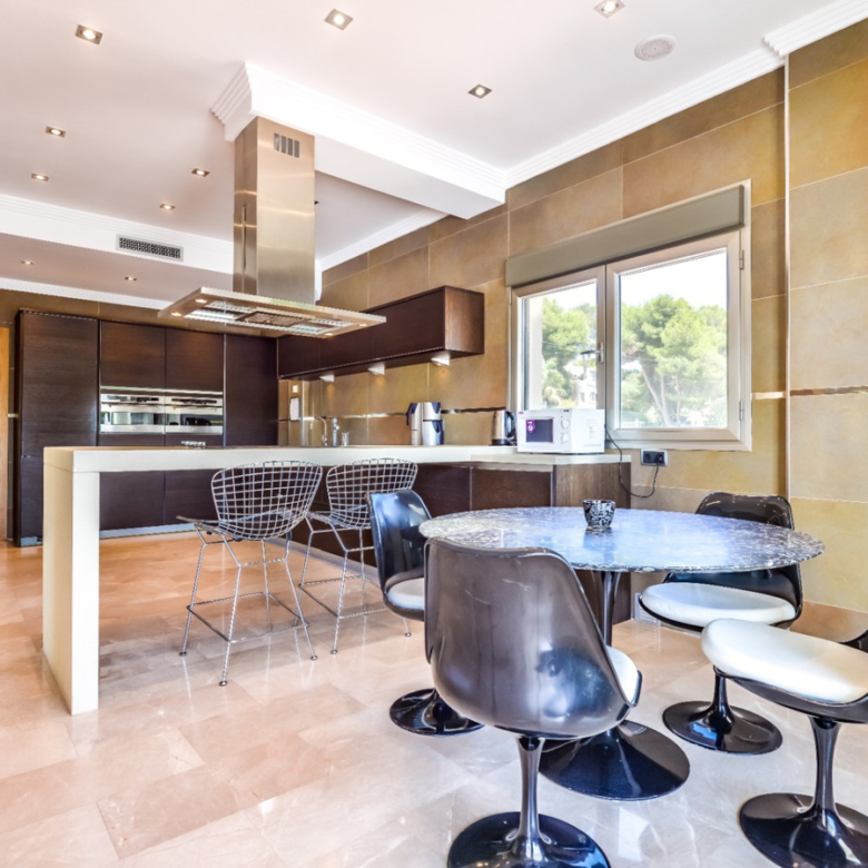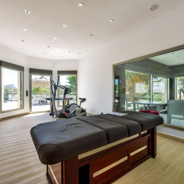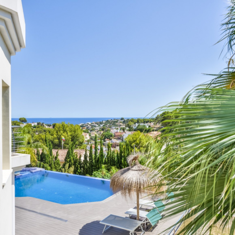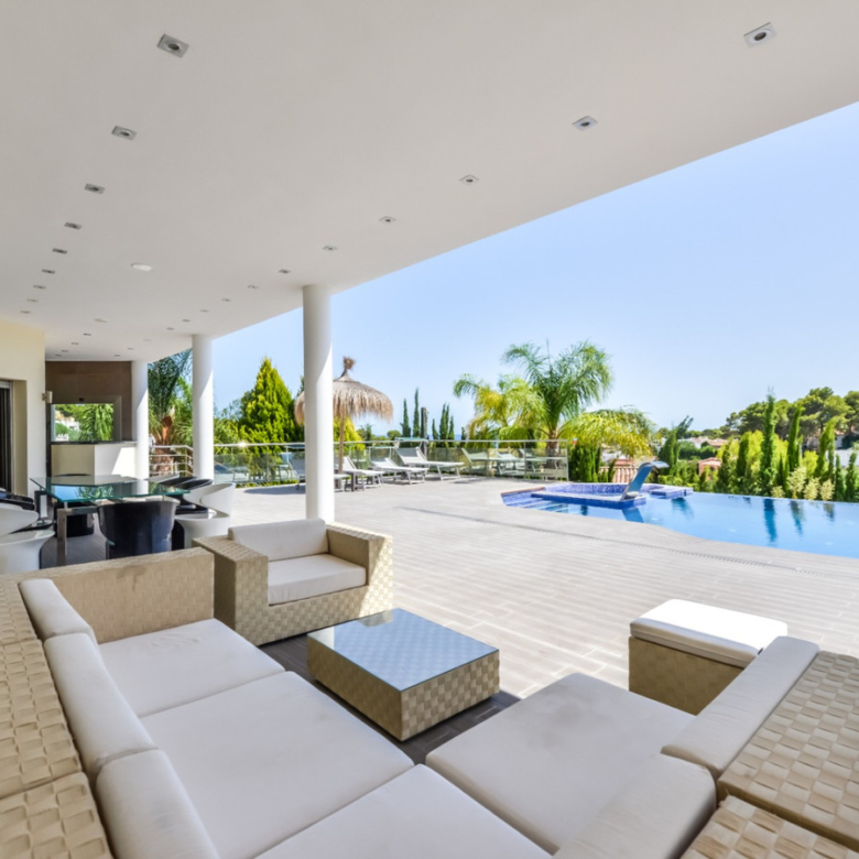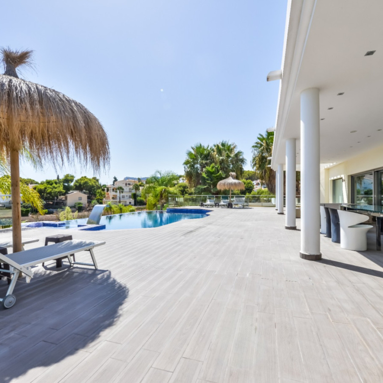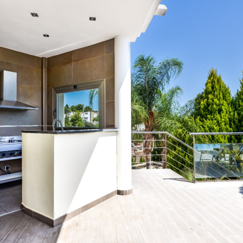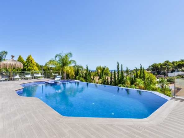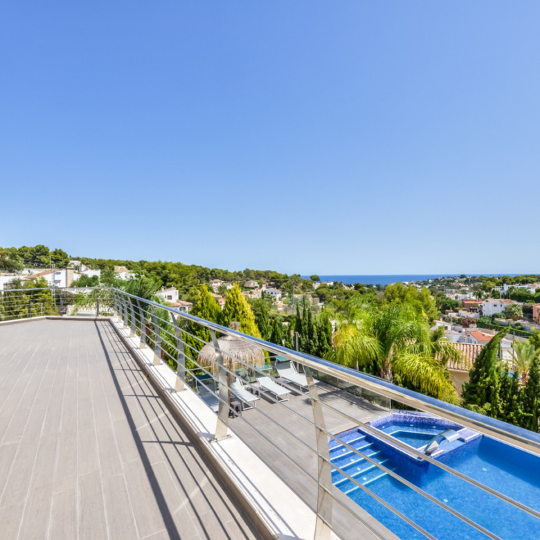 Big luxury villa for sale in La Fustera, situated just 1,3 Km from the beautiful La Fustera Beach, supermarket, restaurants, bus stop…, very close to Moraira and Calpe. This wonderful modern mediterranean style villa enjoys very nice sea views, plenty of sun (South facing) and maximum privacy. It is located on a superb plot of 1.840 m2 and has a constructed area of 585 m2, distributed over two floors + basement floor as follows: on the main floor we have the entrance porch, a fabulous 25 m2 hall with a beautiful double staircase that accesses the upper floor, an indoor spa and relaxation area with a 6×3 meters heated pool + jacuzzi + waterfall, sauna for 6 people, 25 m2 gym and 1 toilet, large 15 m2 laundry pantry, 30 m2 dining kitchen with island, fabulous dining living room of 75 m2 (with designer fireplace), and 50 m2 porch (perfectly equipped with a summer kitchen), which merges with the 100 m2 exterior terrace where we have a wonderful 70 m2 heated pool. Integrated into the garden, we also have a barbecue area that communicates with the exterior terrace. On the upper floor we have 5 large bedrooms (25 m2 + 20 m2 + 18 m2 + 18 m2 + 12 m2), 4 bathrooms en suite, a dressing room and 2 private terraces (80 m2 + 25 m2). In the basement floor we have a party room (with bar) of 40 m2 (with natural light through an English patio), 1 courtesy toilet, guest apartment (also with access from the outside), consisting of 1 bathroom, 1 bedroom of 12 m2 and open plan kitchen dining living room of 25 m2. In addition, on this floor we have an open space of 110 m2 not developed that offers a multitude of expansion options for this property. This impressive villa stands out for its beautiful design, for its exclusive materials and for its top quality finishes. It is equipped with underfloor heating and air conditioning, high end exterior carpentry, designer interior carpentry, designer kitchen fully equipped with Smeg appliances, designer bathrooms, alarm + cameras, LED lighting… In addition, it enjoys large exterior parking areas for several vehicles and an impressive 50 m2 pergola (for 3 vehicles, which could easily be converted into a garage), located next to the main entrance of the property. The garden is spectacular, with large grass areas, beautiful palm trees and is low maintenance (with automatic irrigation system).