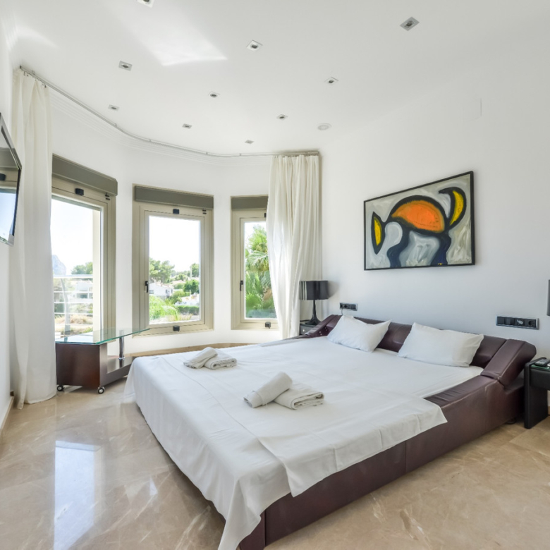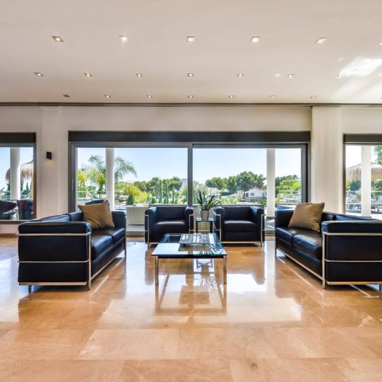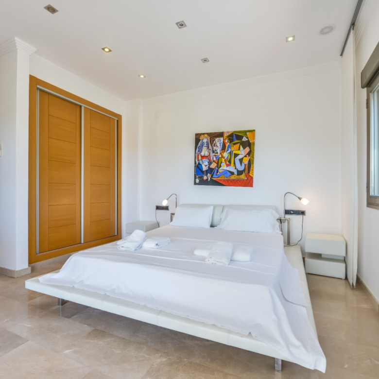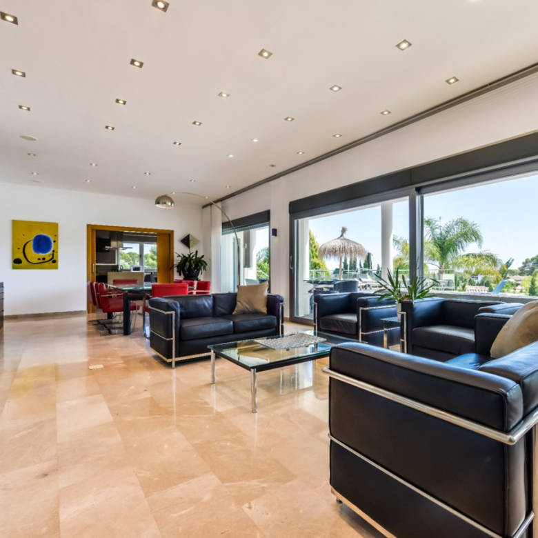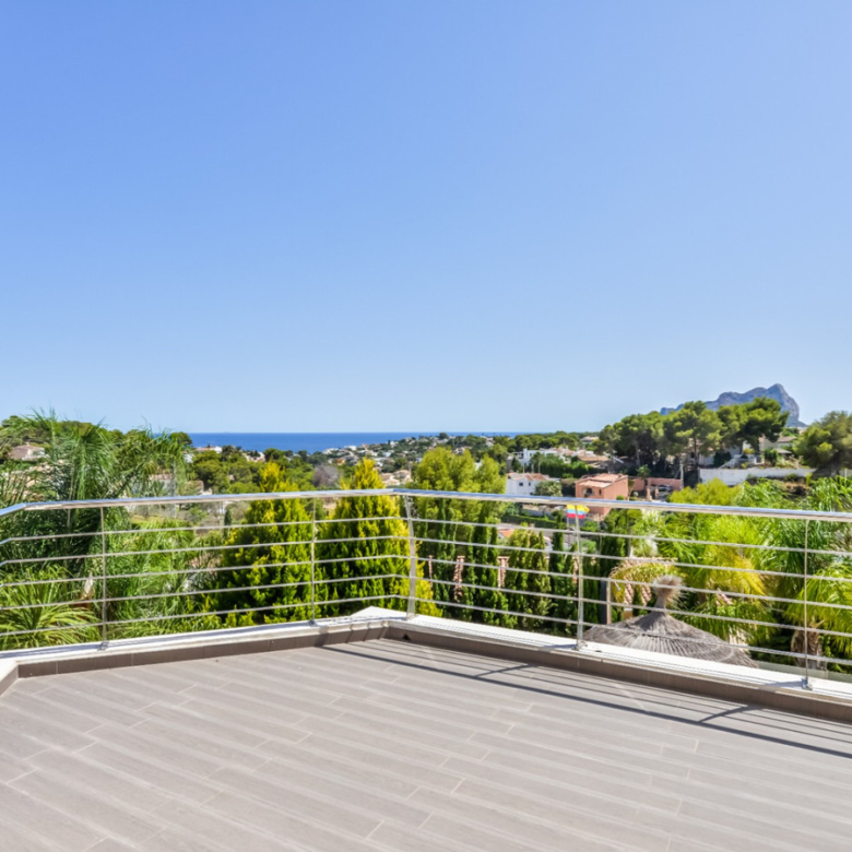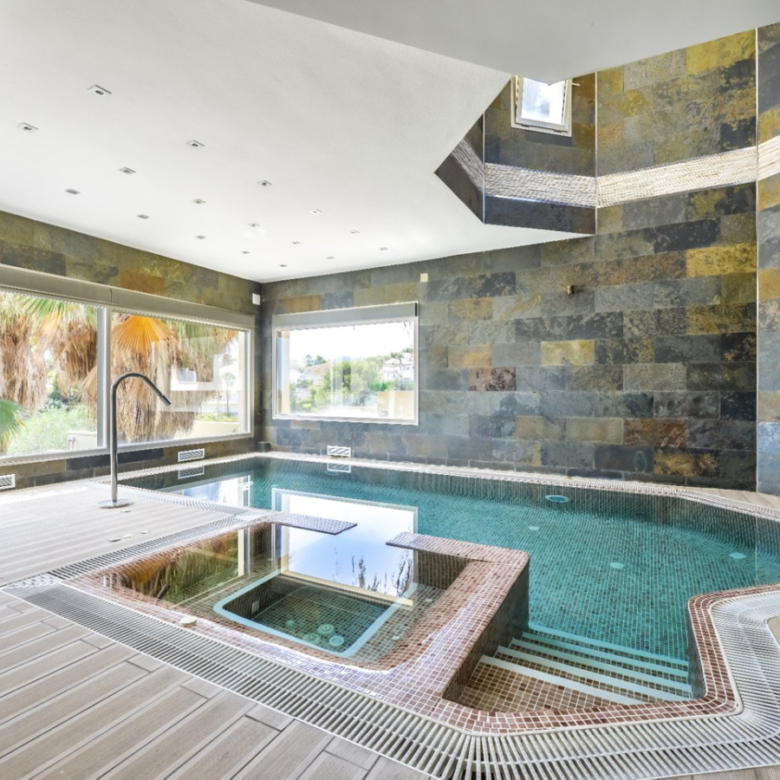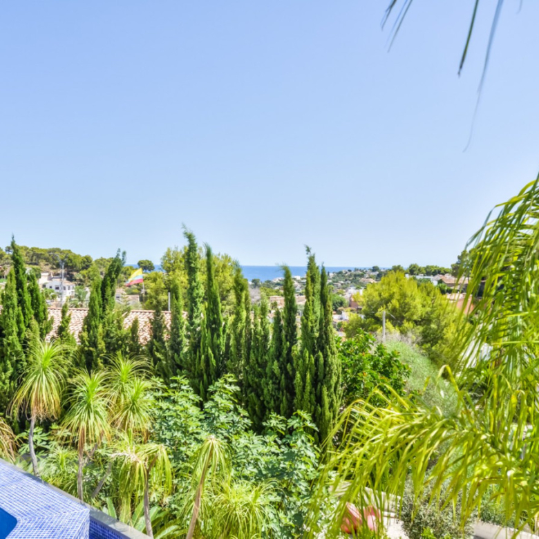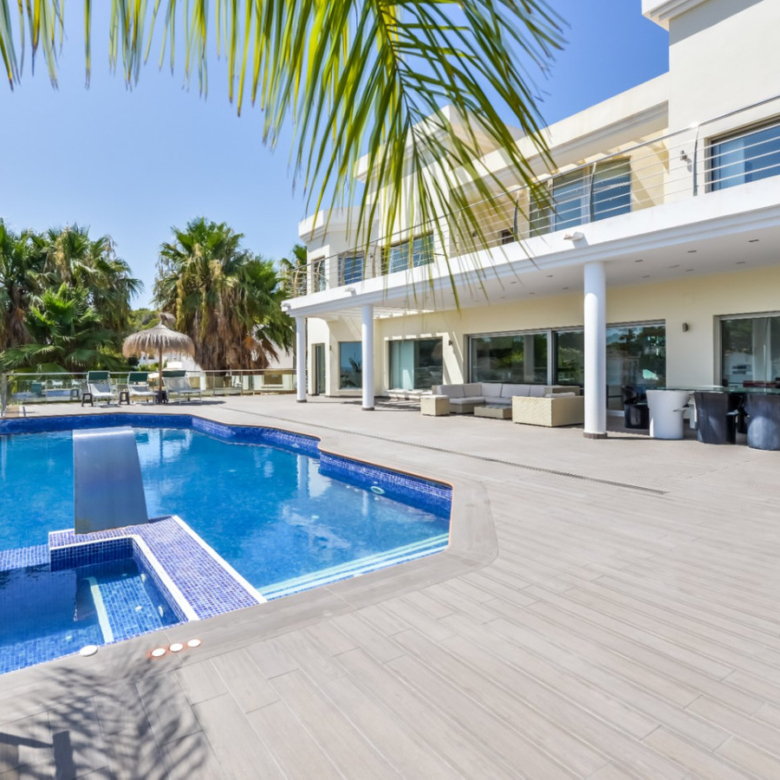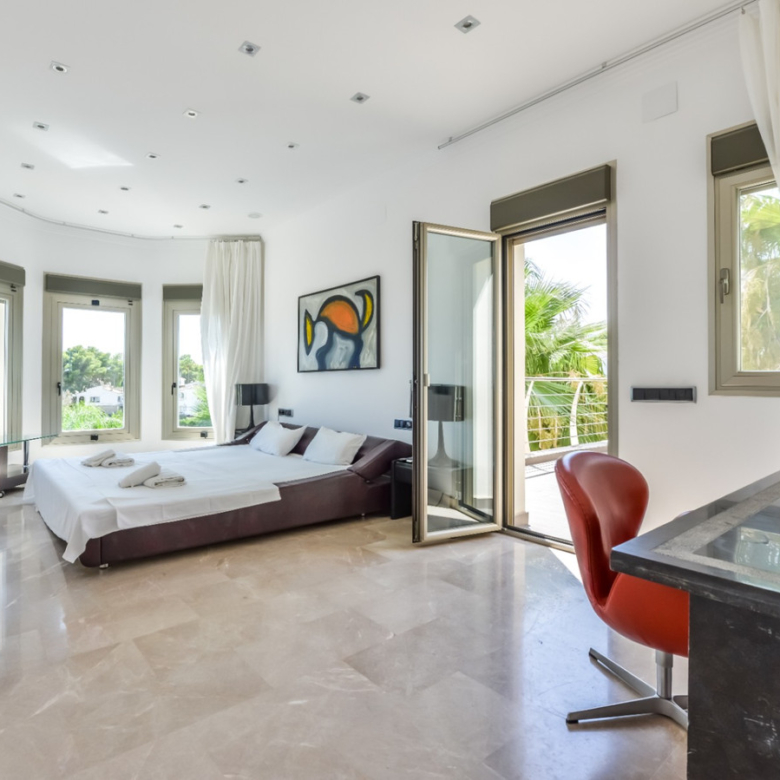 Big luxury villa for sale in La Fustera, situated just 1,3 Km from the beautiful La Fustera Beach, supermarket, restaurants, bus stop…, very close to Moraira and Calpe. This wonderful modern mediterranean style villa enjoys very nice sea views, plenty of sun (South facing) and maximum privacy. It is located on a superb plot of 1.840 m2 and has a constructed area of 585 m2, distributed over two floors + basement floor as follows: on the main floor we have the entrance porch, a fabulous 25 m2 hall with a beautiful double staircase that accesses the upper floor, an indoor spa and relaxation area with a 6×3 meters heated pool + jacuzzi + waterfall, sauna for 6 people, 25 m2 gym and 1 toilet, large 15 m2 laundry pantry, 30 m2 dining kitchen with island, fabulous dining living room of 75 m2 (with designer fireplace), and 50 m2 porch (perfectly equipped with a summer kitchen), which merges with the 100 m2 exterior terrace where we have a wonderful 70 m2 heated pool. Integrated into the garden, we also have a barbecue area that communicates with the exterior terrace. On the upper floor we have 5 large bedrooms (25 m2 + 20 m2 + 18 m2 + 18 m2 + 12 m2), 4 bathrooms en suite, a dressing room and 2 private terraces (80 m2 + 25 m2). In the basement floor we have a party room (with bar) of 40 m2 (with natural light through an English patio), 1 courtesy toilet, guest apartment (also with access from the outside), consisting of 1 bathroom, 1 bedroom of 12 m2 and open plan kitchen dining living room of 25 m2. In addition, on this floor we have an open space of 110 m2 not developed that offers a multitude of expansion options for this property. This impressive villa stands out for its beautiful design, for its exclusive materials and for its top quality finishes. It is equipped with underfloor heating and air conditioning, high end exterior carpentry, designer interior carpentry, designer kitchen fully equipped with Smeg appliances, designer bathrooms, alarm + cameras, LED lighting… In addition, it enjoys large exterior parking areas for several vehicles and an impressive 50 m2 pergola (for 3 vehicles, which could easily be converted into a garage), located next to the main entrance of the property. The garden is spectacular, with large grass areas, beautiful palm trees and is low maintenance (with automatic irrigation system).