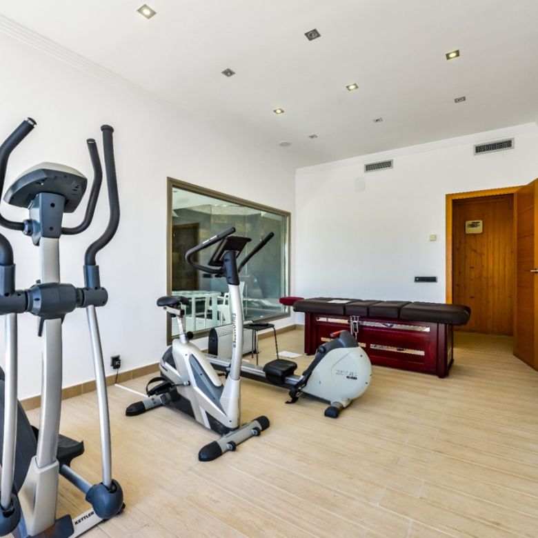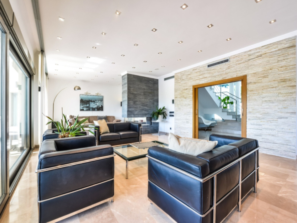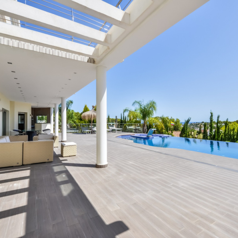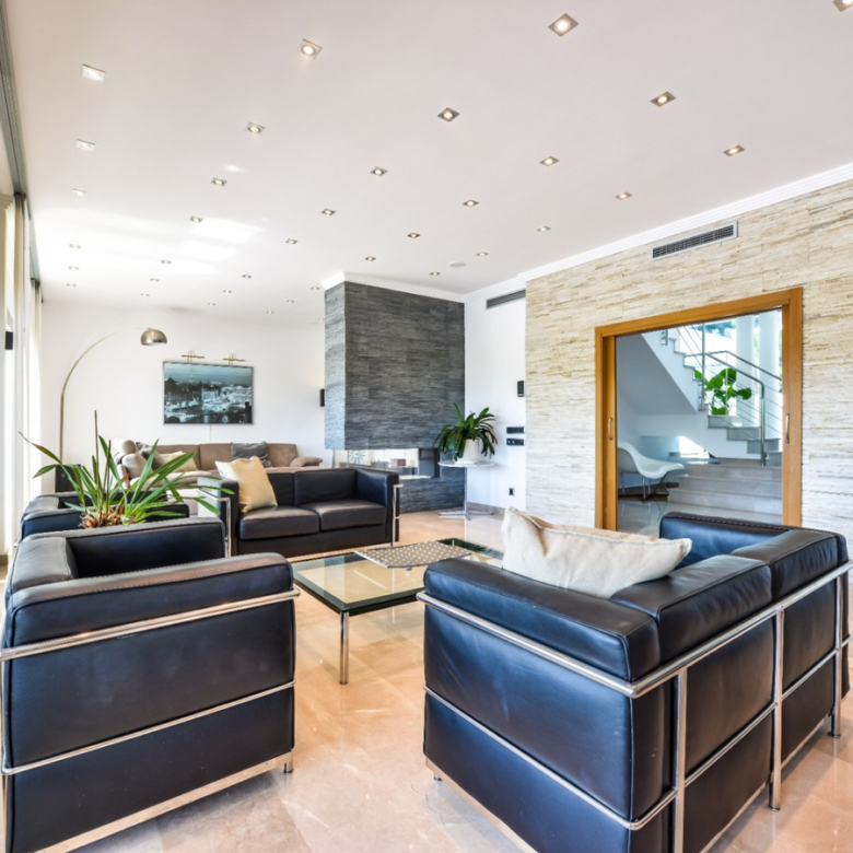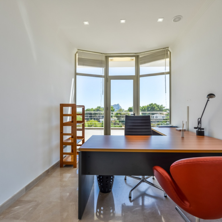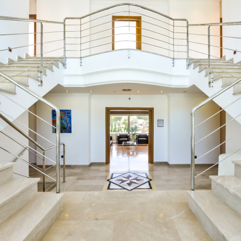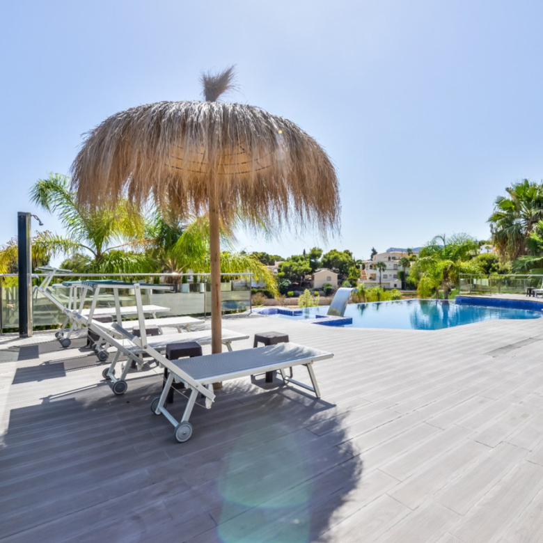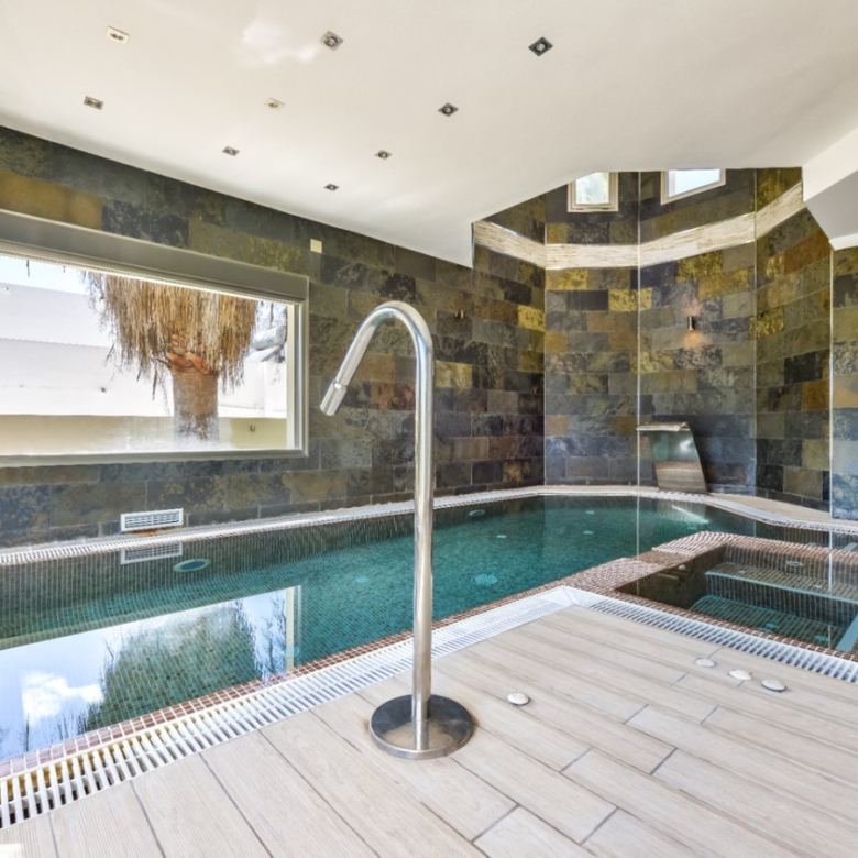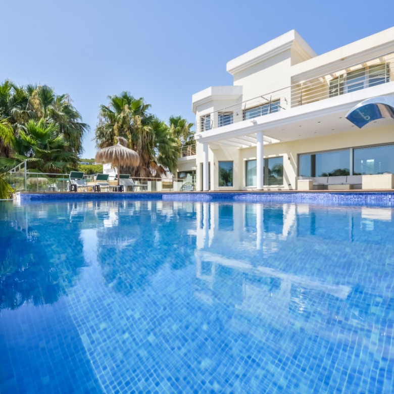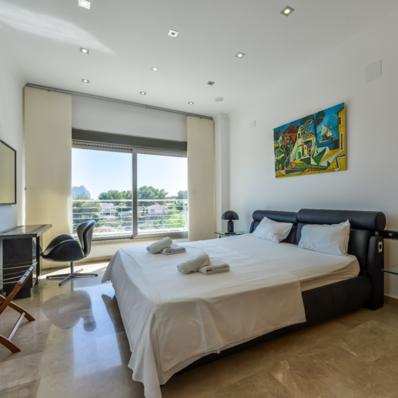 Big luxury villa for sale in La Fustera, situated just 1,3 Km from the beautiful La Fustera Beach, supermarket, restaurants, bus stop…, very close to Moraira and Calpe. This wonderful modern mediterranean style villa enjoys very nice sea views, plenty of sun (South facing) and maximum privacy. It is located on a superb plot of 1.840 m2 and has a constructed area of 585 m2, distributed over two floors + basement floor as follows: on the main floor we have the entrance porch, a fabulous 25 m2 hall with a beautiful double staircase that accesses the upper floor, an indoor spa and relaxation area with a 6×3 meters heated pool + jacuzzi + waterfall, sauna for 6 people, 25 m2 gym and 1 toilet, large 15 m2 laundry pantry, 30 m2 dining kitchen with island, fabulous dining living room of 75 m2 (with designer fireplace), and 50 m2 porch (perfectly equipped with a summer kitchen), which merges with the 100 m2 exterior terrace where we have a wonderful 70 m2 heated pool. Integrated into the garden, we also have a barbecue area that communicates with the exterior terrace. On the upper floor we have 5 large bedrooms (25 m2 + 20 m2 + 18 m2 + 18 m2 + 12 m2), 4 bathrooms en suite, a dressing room and 2 private terraces (80 m2 + 25 m2). In the basement floor we have a party room (with bar) of 40 m2 (with natural light through an English patio), 1 courtesy toilet, guest apartment (also with access from the outside), consisting of 1 bathroom, 1 bedroom of 12 m2 and open plan kitchen dining living room of 25 m2. In addition, on this floor we have an open space of 110 m2 not developed that offers a multitude of expansion options for this property. This impressive villa stands out for its beautiful design, for its exclusive materials and for its top quality finishes. It is equipped with underfloor heating and air conditioning, high end exterior carpentry, designer interior carpentry, designer kitchen fully equipped with Smeg appliances, designer bathrooms, alarm + cameras, LED lighting… In addition, it enjoys large exterior parking areas for several vehicles and an impressive 50 m2 pergola (for 3 vehicles, which could easily be converted into a garage), located next to the main entrance of the property. The garden is spectacular, with large grass areas, beautiful palm trees and is low maintenance (with automatic irrigation system).