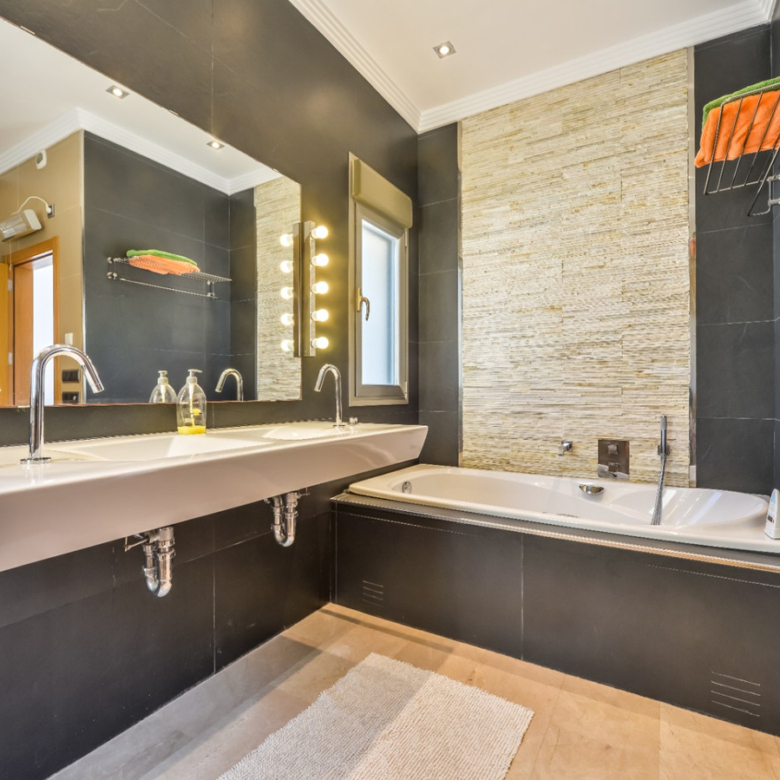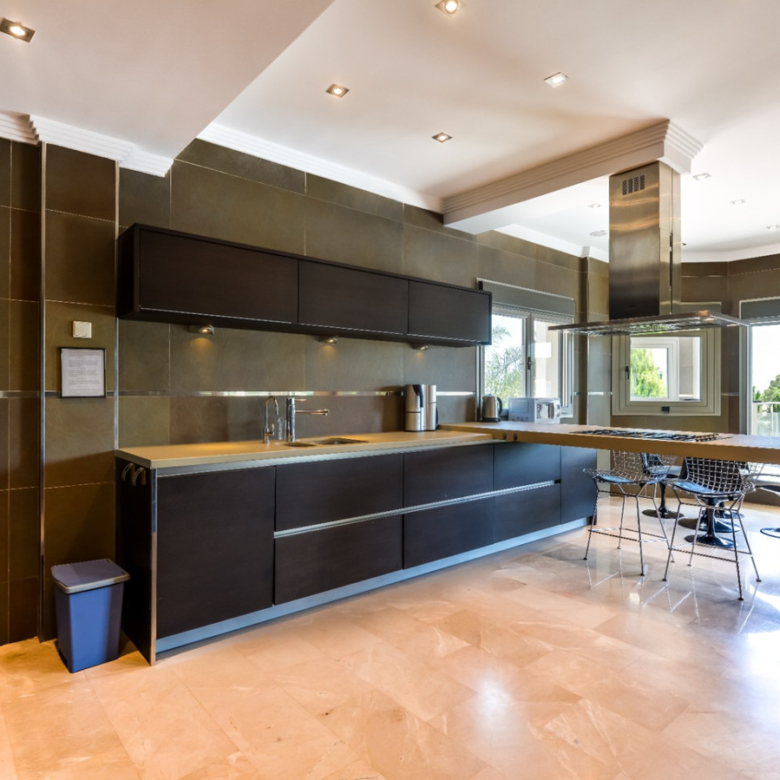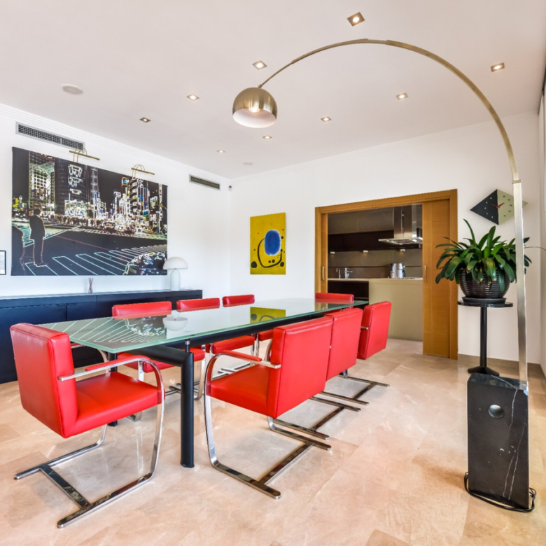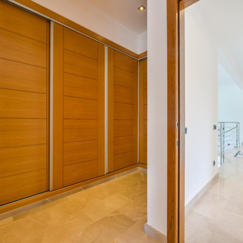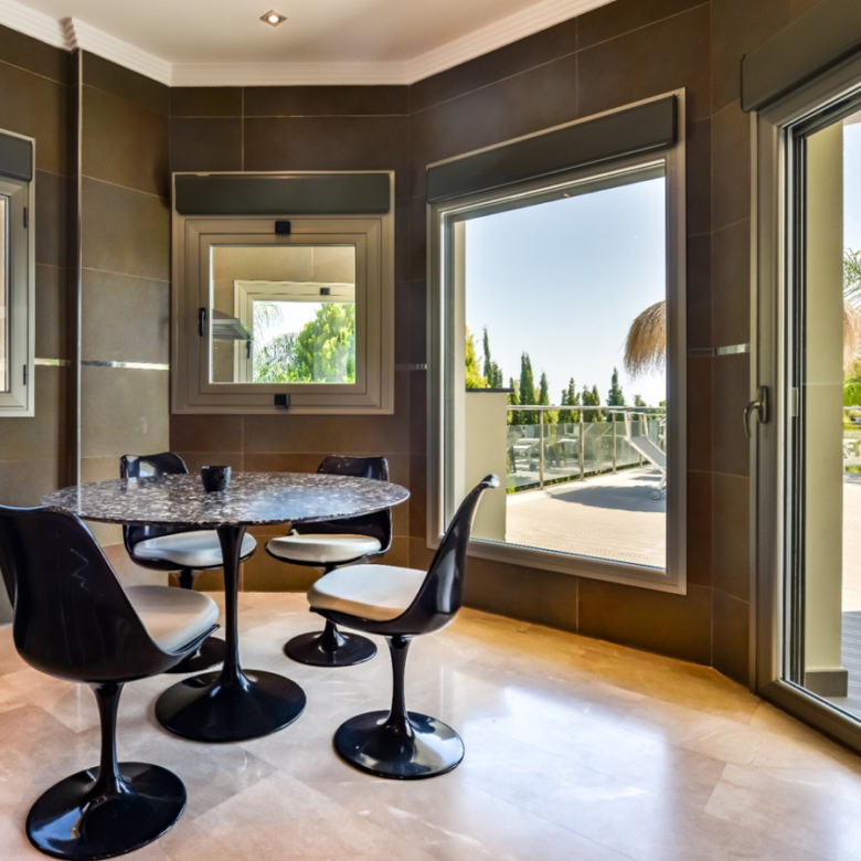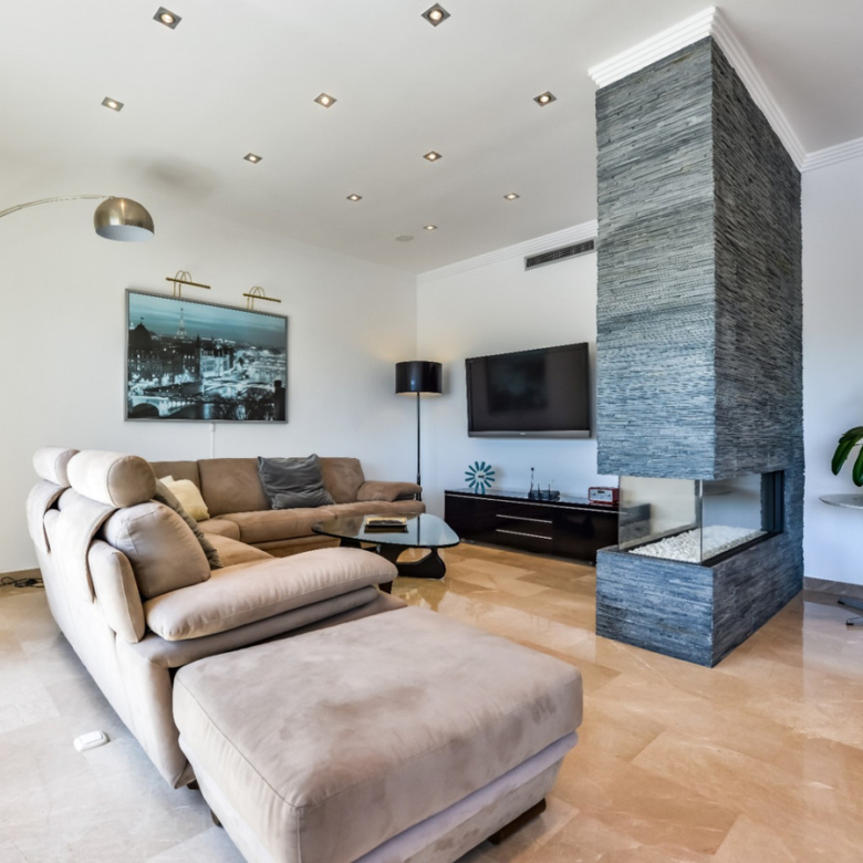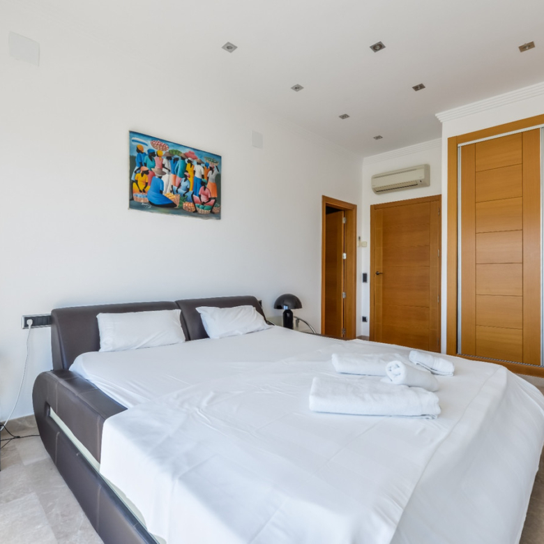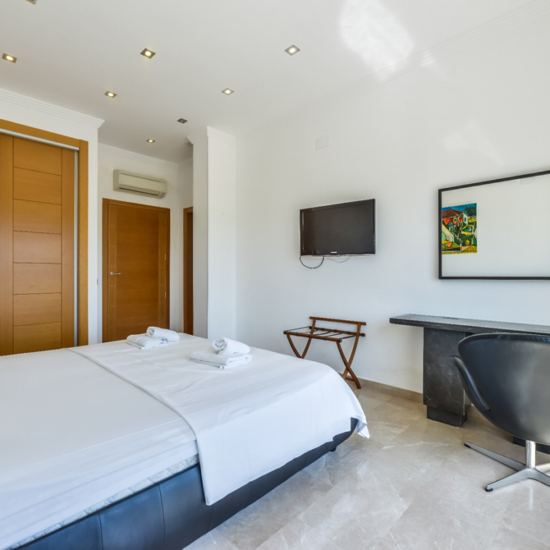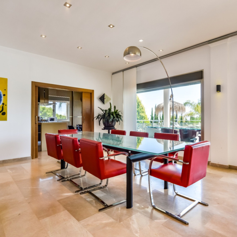 Big luxury villa for sale in La Fustera, situated just 1,3 Km from the beautiful La Fustera Beach, supermarket, restaurants, bus stop…, very close to Moraira and Calpe. This wonderful modern mediterranean style villa enjoys very nice sea views, plenty of sun (South facing) and maximum privacy. It is located on a superb plot of 1.840 m2 and has a constructed area of 585 m2, distributed over two floors + basement floor as follows: on the main floor we have the entrance porch, a fabulous 25 m2 hall with a beautiful double staircase that accesses the upper floor, an indoor spa and relaxation area with a 6×3 meters heated pool + jacuzzi + waterfall, sauna for 6 people, 25 m2 gym and 1 toilet, large 15 m2 laundry pantry, 30 m2 dining kitchen with island, fabulous dining living room of 75 m2 (with designer fireplace), and 50 m2 porch (perfectly equipped with a summer kitchen), which merges with the 100 m2 exterior terrace where we have a wonderful 70 m2 heated pool. Integrated into the garden, we also have a barbecue area that communicates with the exterior terrace. On the upper floor we have 5 large bedrooms (25 m2 + 20 m2 + 18 m2 + 18 m2 + 12 m2), 4 bathrooms en suite, a dressing room and 2 private terraces (80 m2 + 25 m2). In the basement floor we have a party room (with bar) of 40 m2 (with natural light through an English patio), 1 courtesy toilet, guest apartment (also with access from the outside), consisting of 1 bathroom, 1 bedroom of 12 m2 and open plan kitchen dining living room of 25 m2. In addition, on this floor we have an open space of 110 m2 not developed that offers a multitude of expansion options for this property. This impressive villa stands out for its beautiful design, for its exclusive materials and for its top quality finishes. It is equipped with underfloor heating and air conditioning, high end exterior carpentry, designer interior carpentry, designer kitchen fully equipped with Smeg appliances, designer bathrooms, alarm + cameras, LED lighting… In addition, it enjoys large exterior parking areas for several vehicles and an impressive 50 m2 pergola (for 3 vehicles, which could easily be converted into a garage), located next to the main entrance of the property. The garden is spectacular, with large grass areas, beautiful palm trees and is low maintenance (with automatic irrigation system).