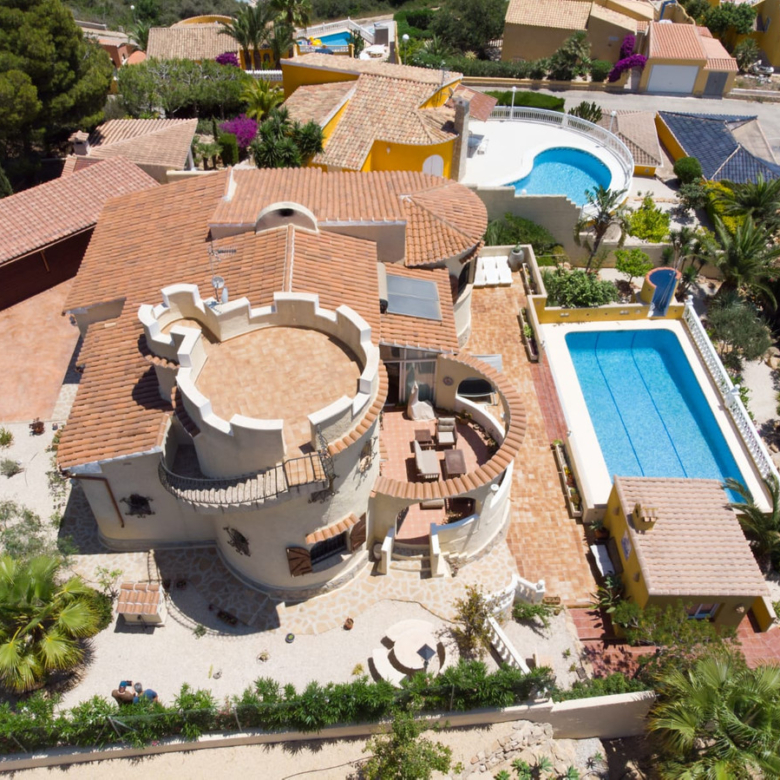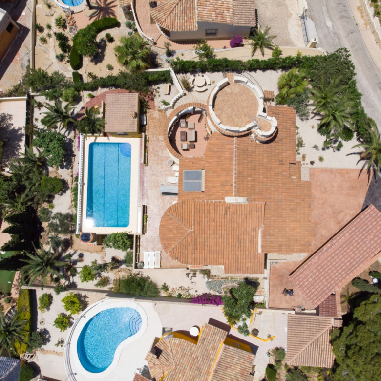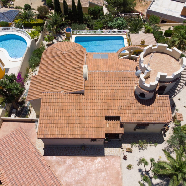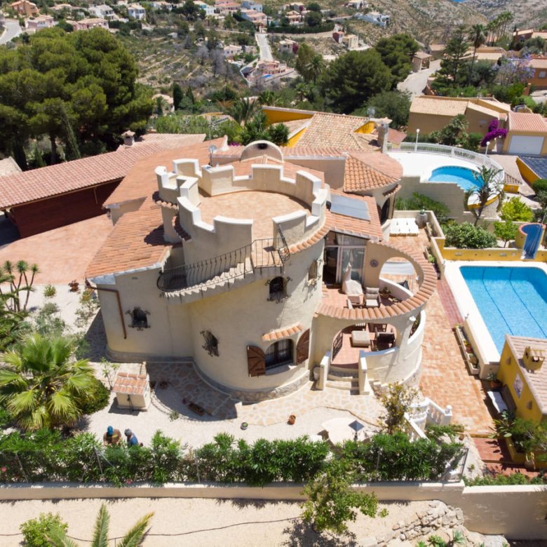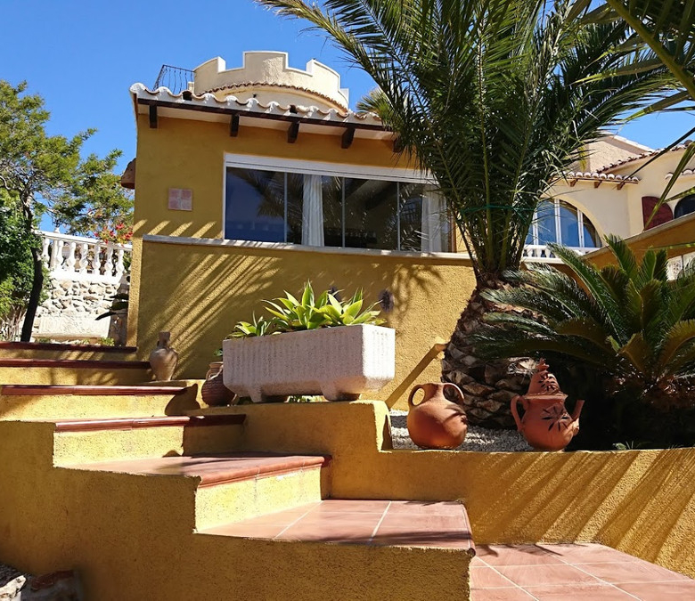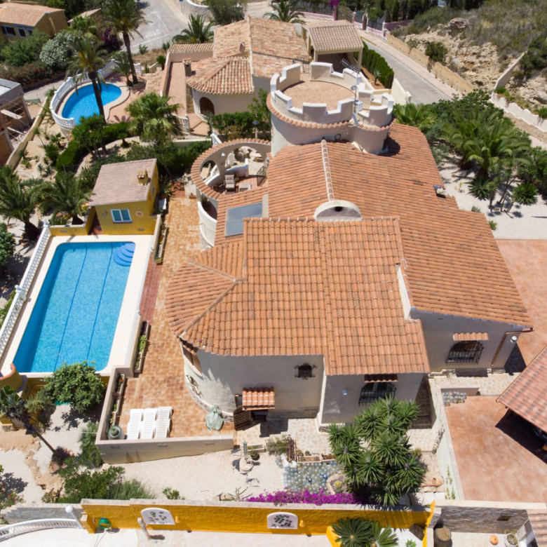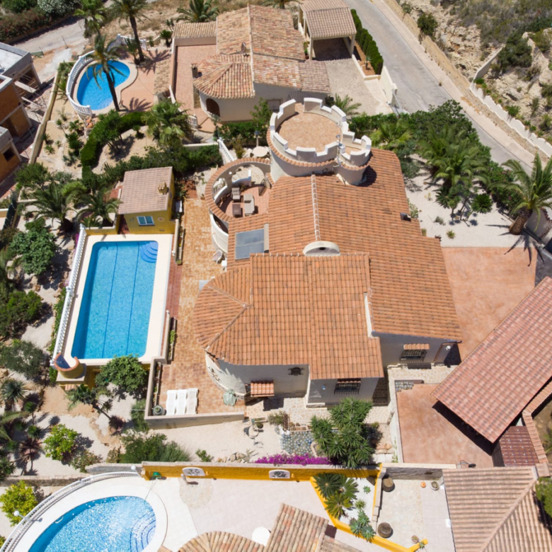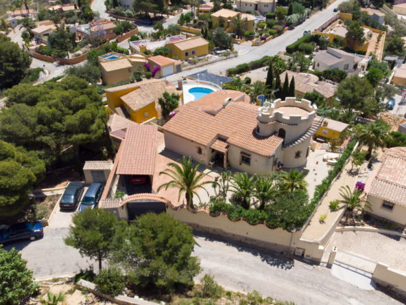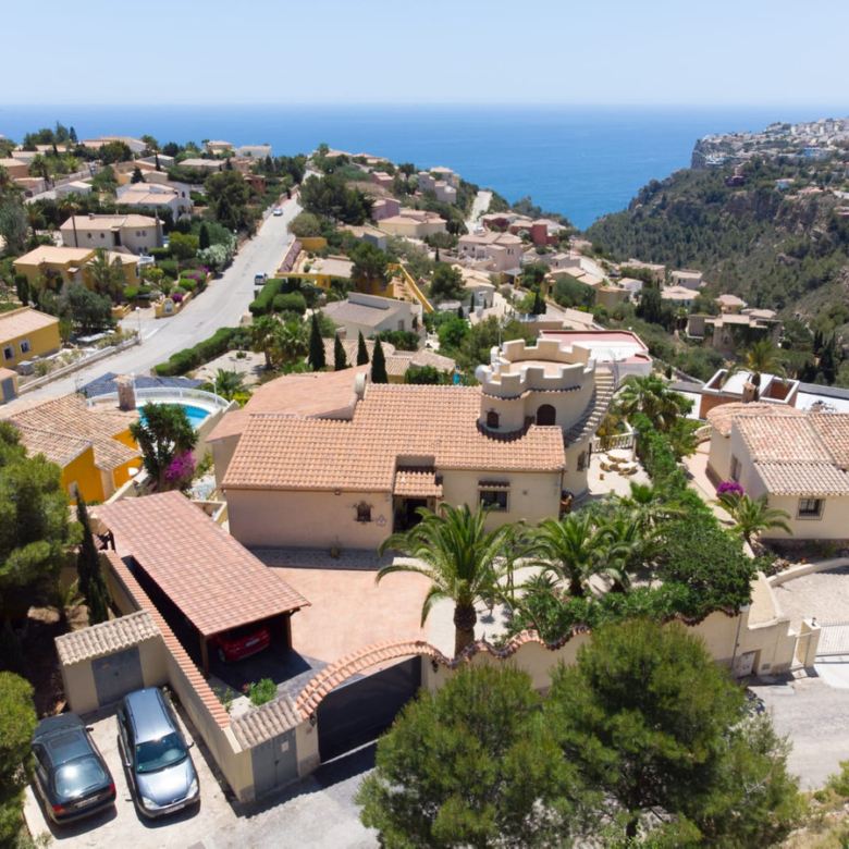 This traditional villa is located in the Cumbre del Sol residential resort. There are sea views from the terrace as well as from all rooms. The villa is spread over three floors. The ground floor comprises a lounge with a fireplace, a dining room, a kitchen, three double bedrooms, one with an en suite bathroom, a separate bathroom, a naya and a terrace. In the tower there is a fourth bedroom with access to the roof terrace where you can enjoy breathtaking 180º views. The basement comprises a fifth bedroom with a bathroom and a storage room. Outside is a swimming pool with a large terrace, an outdoor shower and an outdoor kitchen with a barbecue. There is also large driveway and a carport with space for two cars. The villa is surrounded by a Mediterranean garden with automatic irrigation. Cumbre del Sol is located in Benitachell municipality between Jávea and Moraira. Several beautiful beaches are less than a km away, there is also a large international school, a supermarket, a pharmacy and several bars and restaurants.