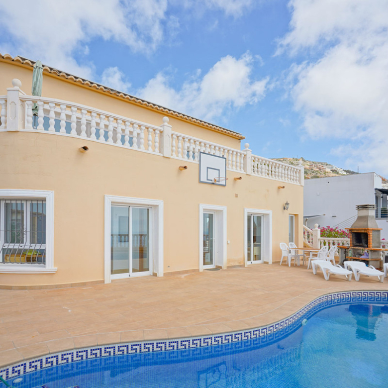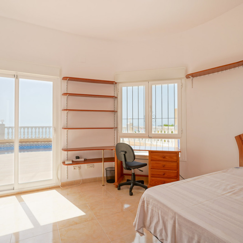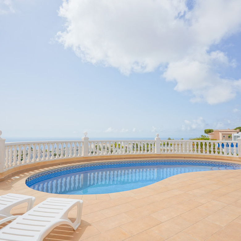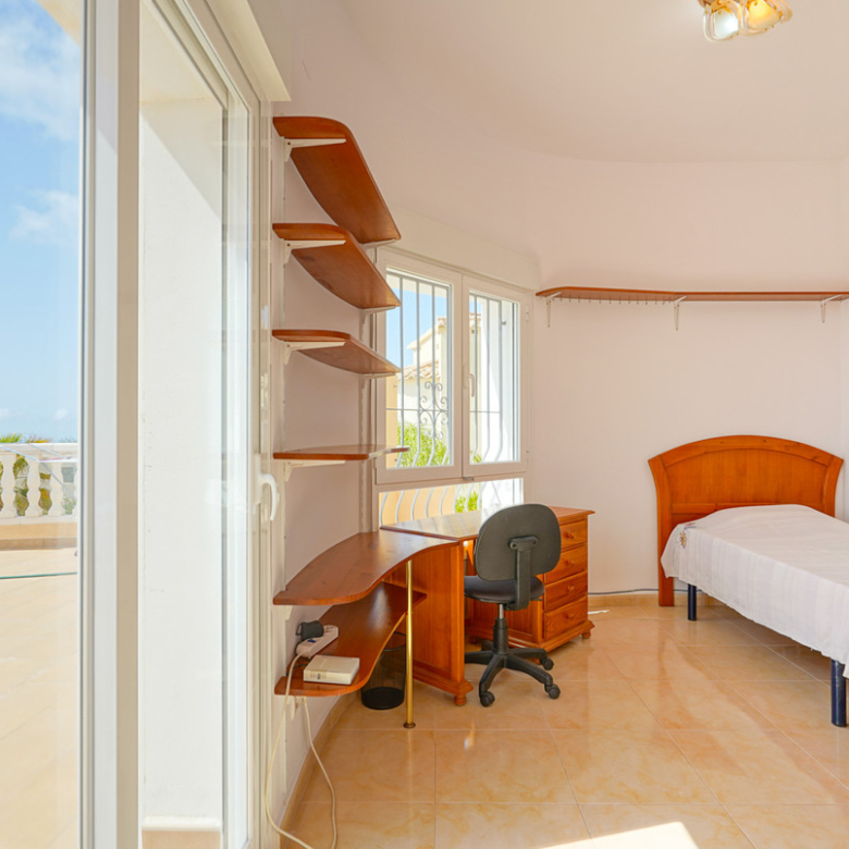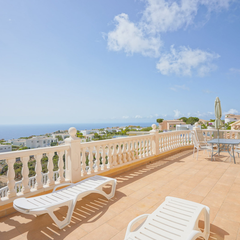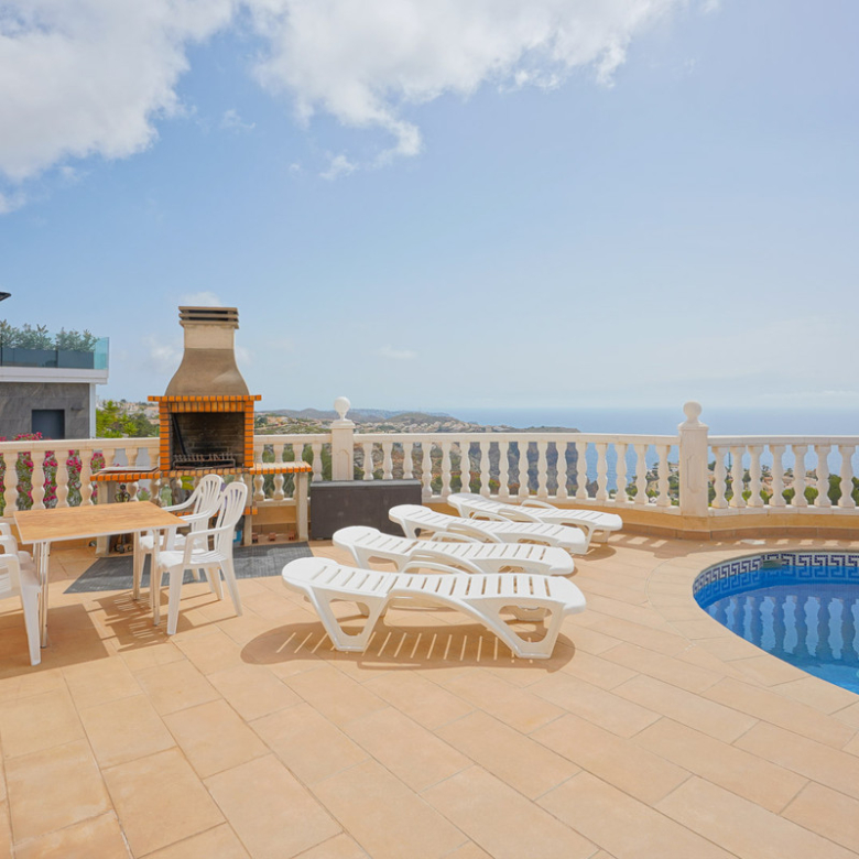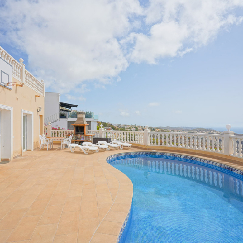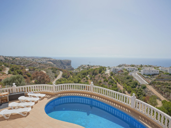 Located in Cumbre del Sol, this villa offers breathtaking views over the cliffs and the azure Mediterranean Sea. The villa is spread over two floors. On the first floor is a living-dining room with a stove, a half-open kitchen and a double bedroom with an ensuite bathroom. Through sliding windows there is direct access to a large terrace from both the bedroom and the living room. The ground floor consists of two double bedrooms, two bathrooms and an extra room that could possibly be used as a single room. Outside, there is a large poolside terrace and a barbecue. There is also a terrace surrounded by fruit trees on the north side. The villa has air conditioning and underfloor heating. There is also parking space for two cars. There is also a project approved to extend the villa by 100 m2 if required. The villa is just 4 minutes’ drive from the idyllic pebble beach of Cala Moraig and 10 minutes from the tourist coastal village of Moraira and has a rental licence. Jávea can be reached in 20 minutes. Both the international school and several large supermarkets can be reached in just 5 minutes.