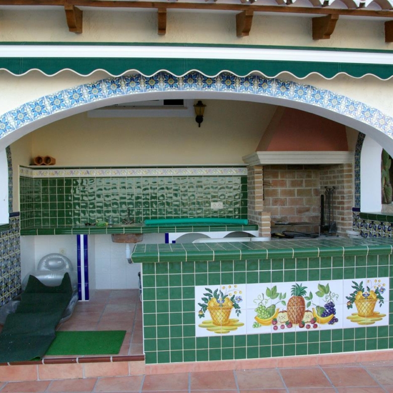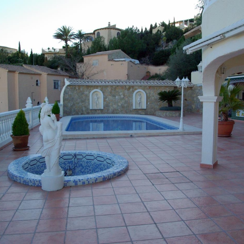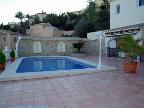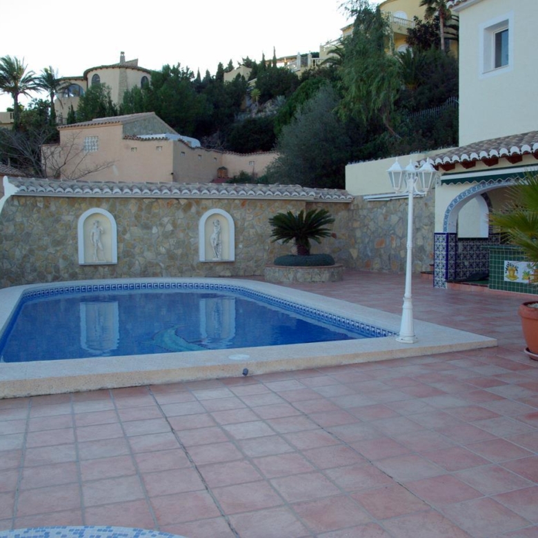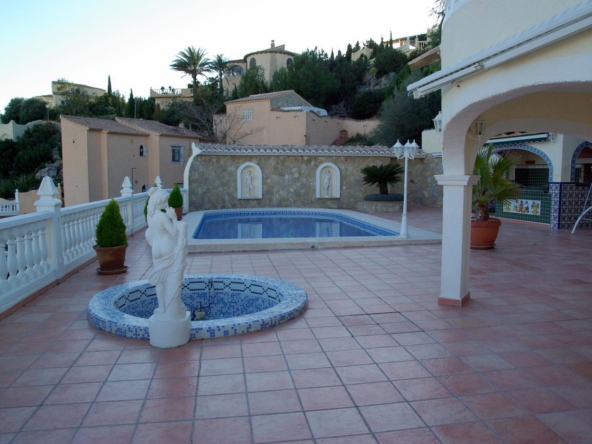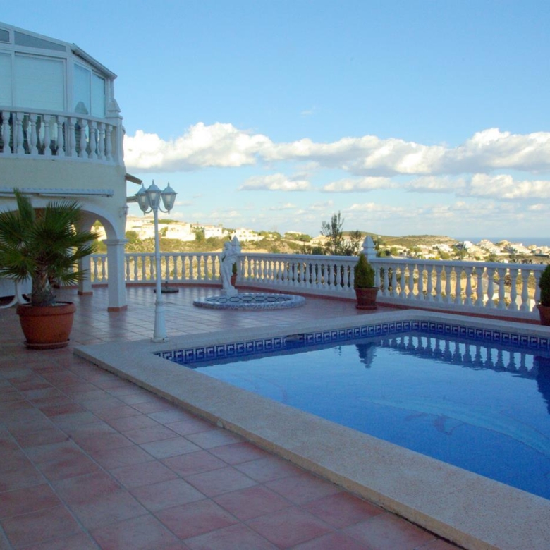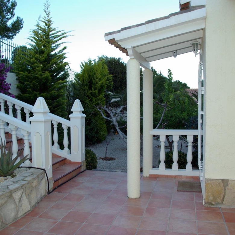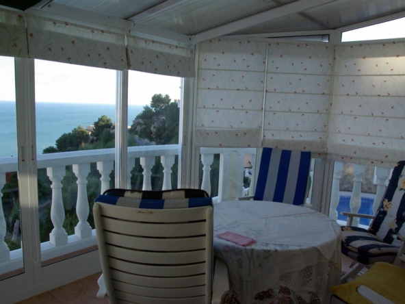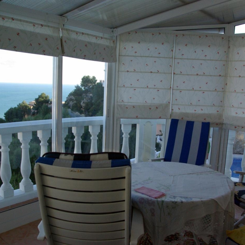 It has a glazed porch on the top floor and a porch on the lower floor on the terrace with the pool.