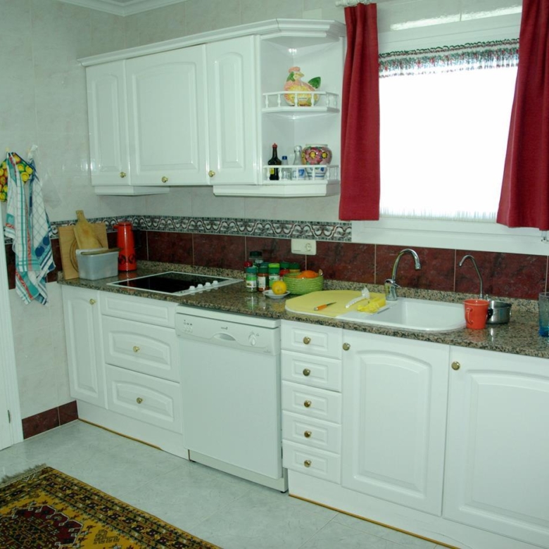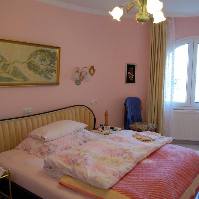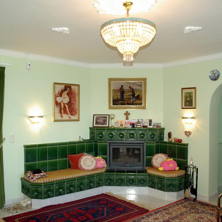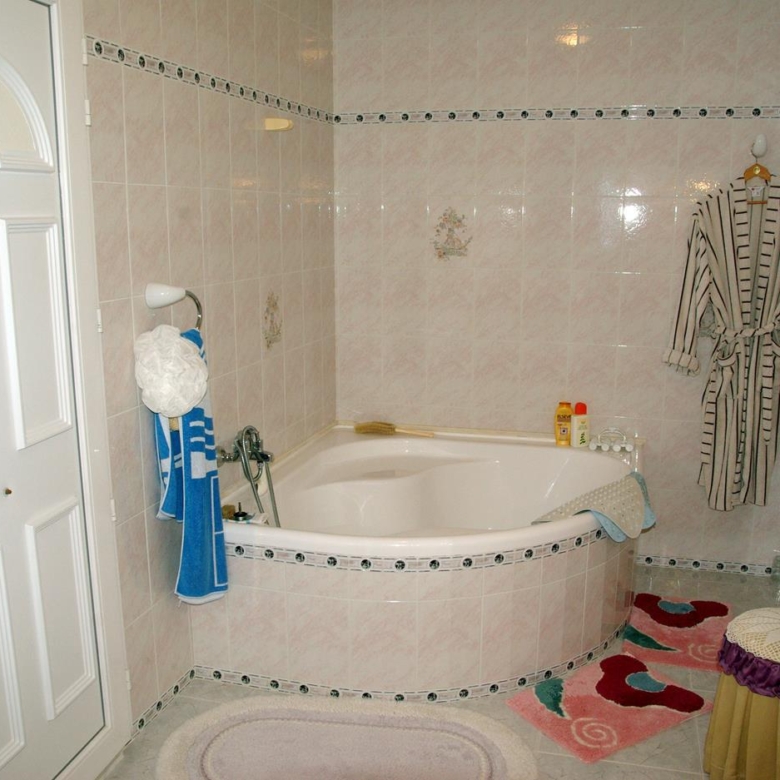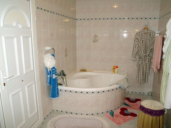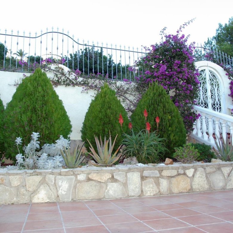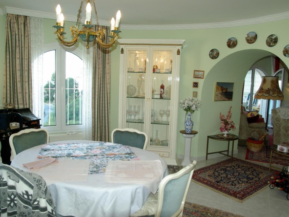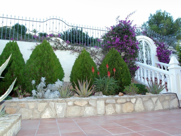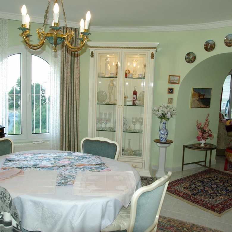 It has a glazed porch on the top floor and a porch on the lower floor on the terrace with the pool.