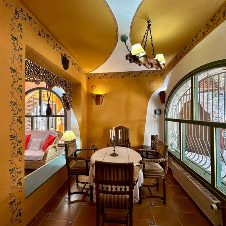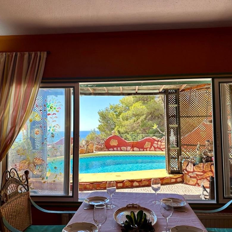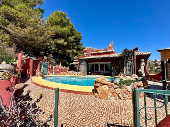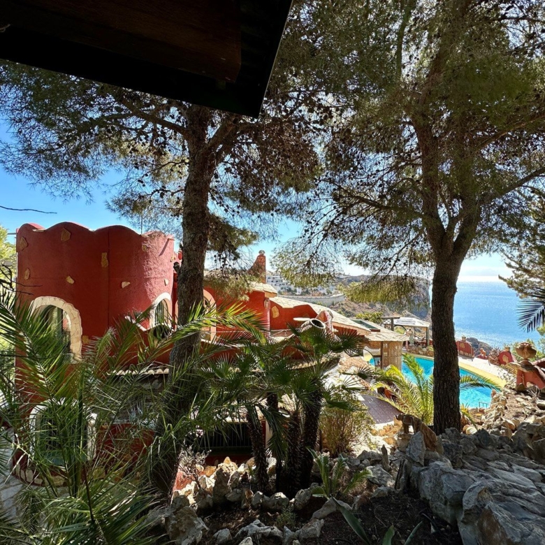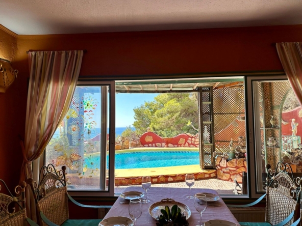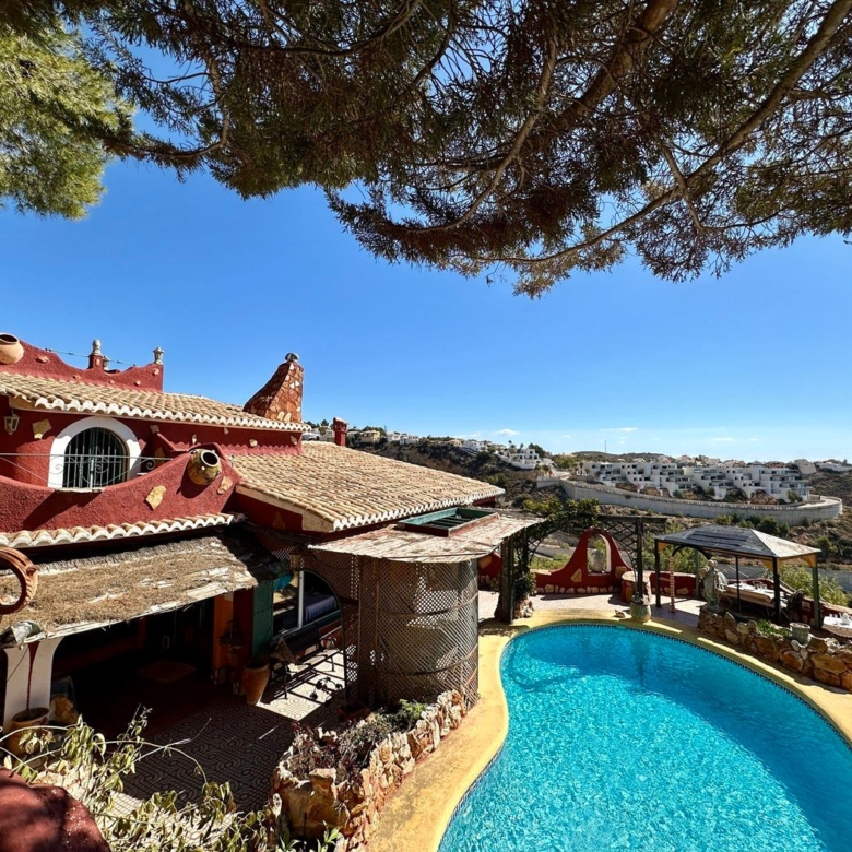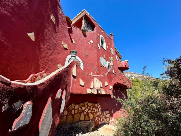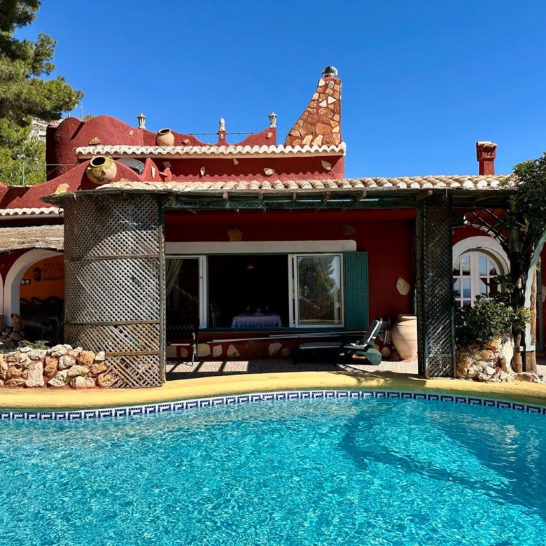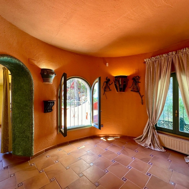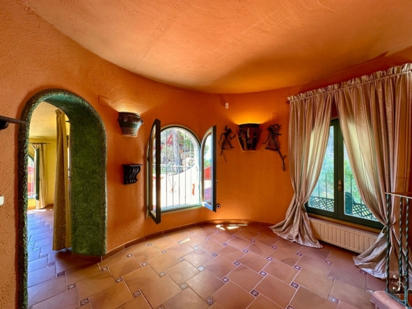 Inspired by the Austrian artist Friedensreich Hundertwasser, this villa stands out for its absence of straight lines and its bright colors that evoke nature. It has wooden finishes, sculptures, undulating walls and a garden full of charming corners. The ground floor has a dining room overlooking the pool, living room with fireplace, kitchen, another dining room, two bedrooms and two bathrooms en suite. The first floor houses another bedroom with bathroom, terrace and solarium adorned with large amphorae and 360º panoramic views.