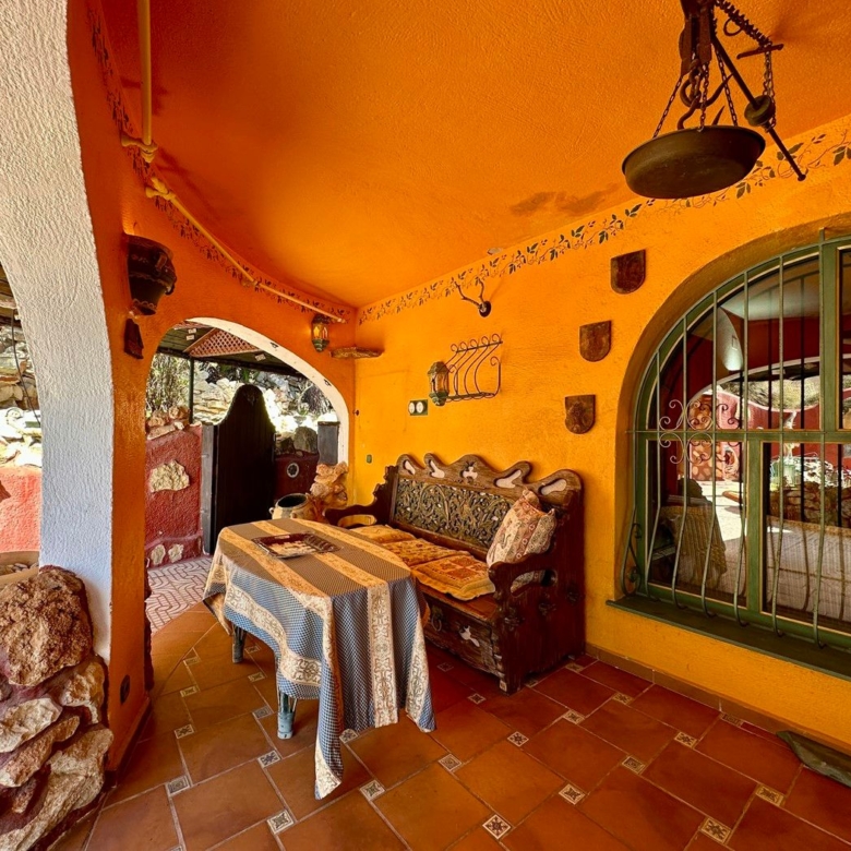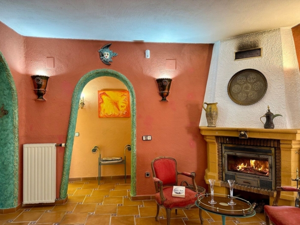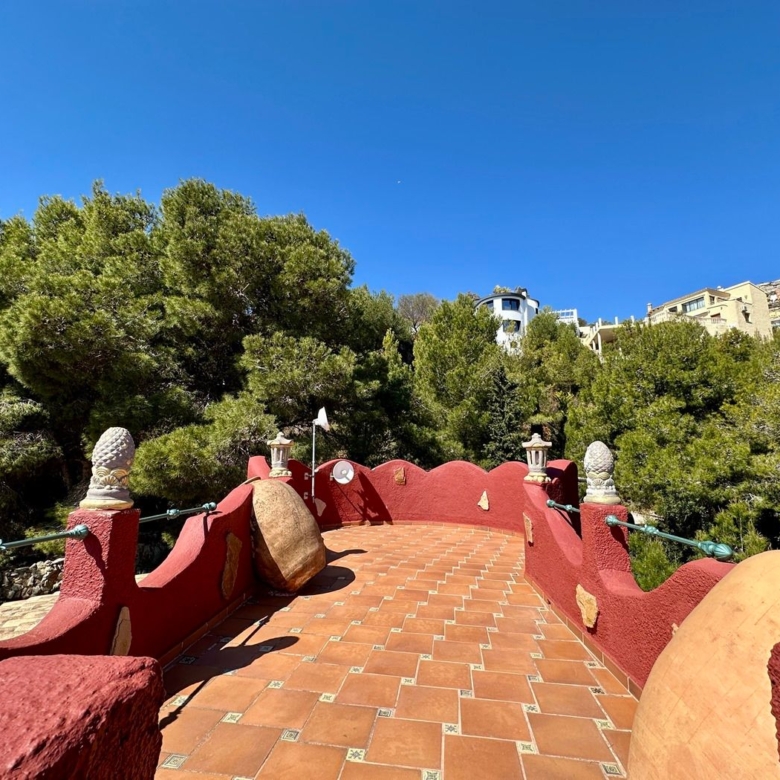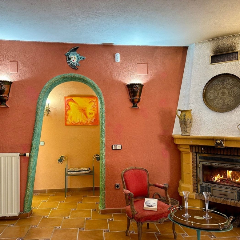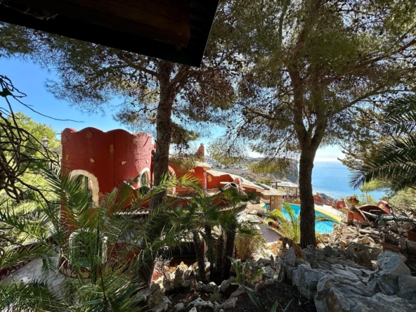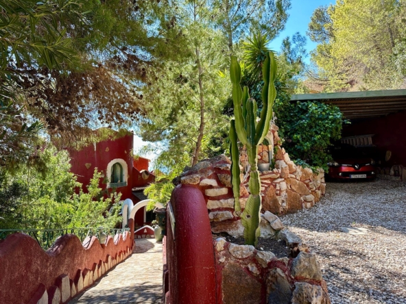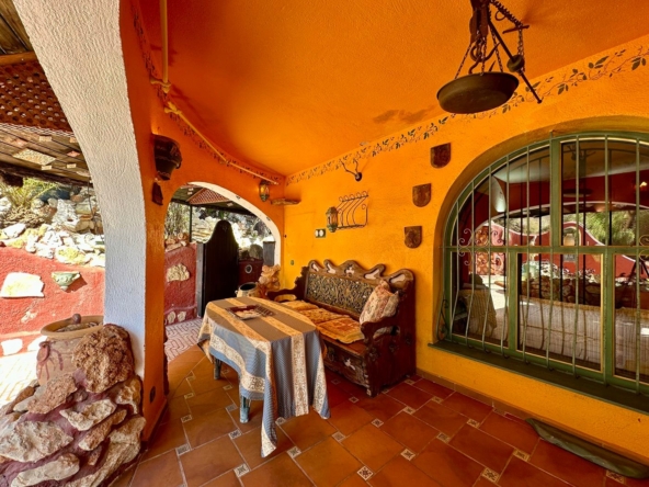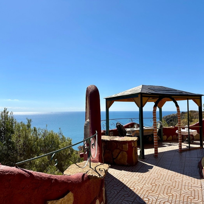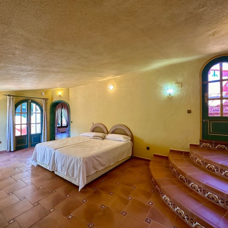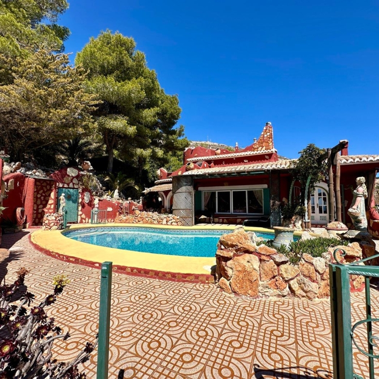 Inspired by the Austrian artist Friedensreich Hundertwasser, this villa stands out for its absence of straight lines and its bright colors that evoke nature. It has wooden finishes, sculptures, undulating walls and a garden full of charming corners. The ground floor has a dining room overlooking the pool, living room with fireplace, kitchen, another dining room, two bedrooms and two bathrooms en suite. The first floor houses another bedroom with bathroom, terrace and solarium adorned with large amphorae and 360º panoramic views.