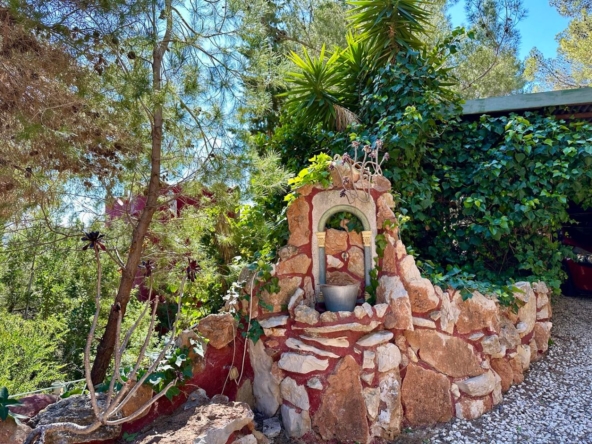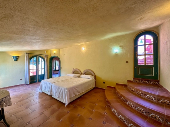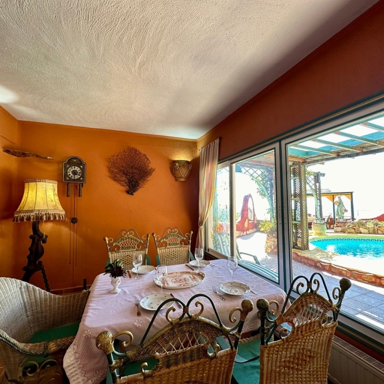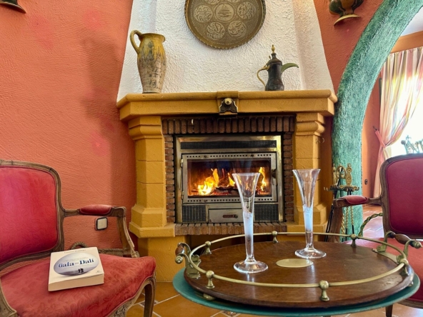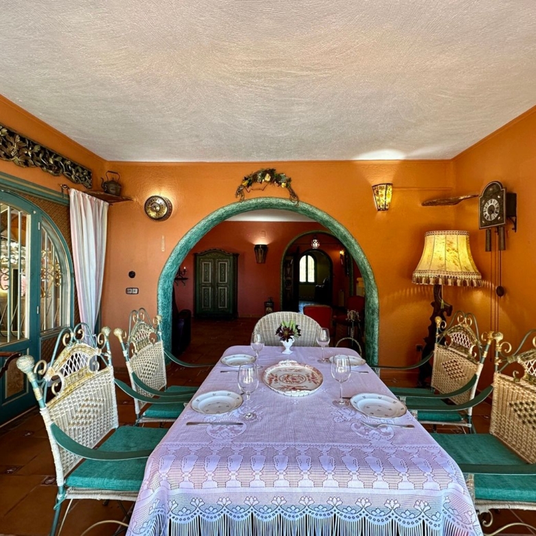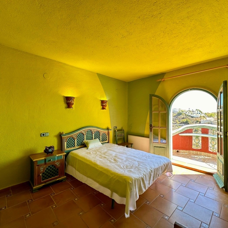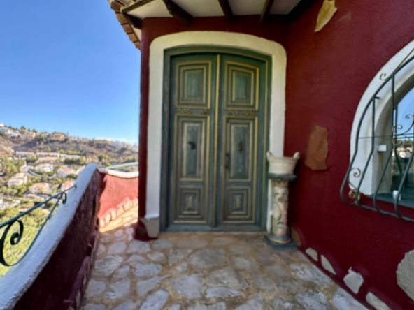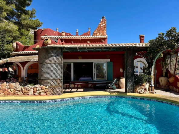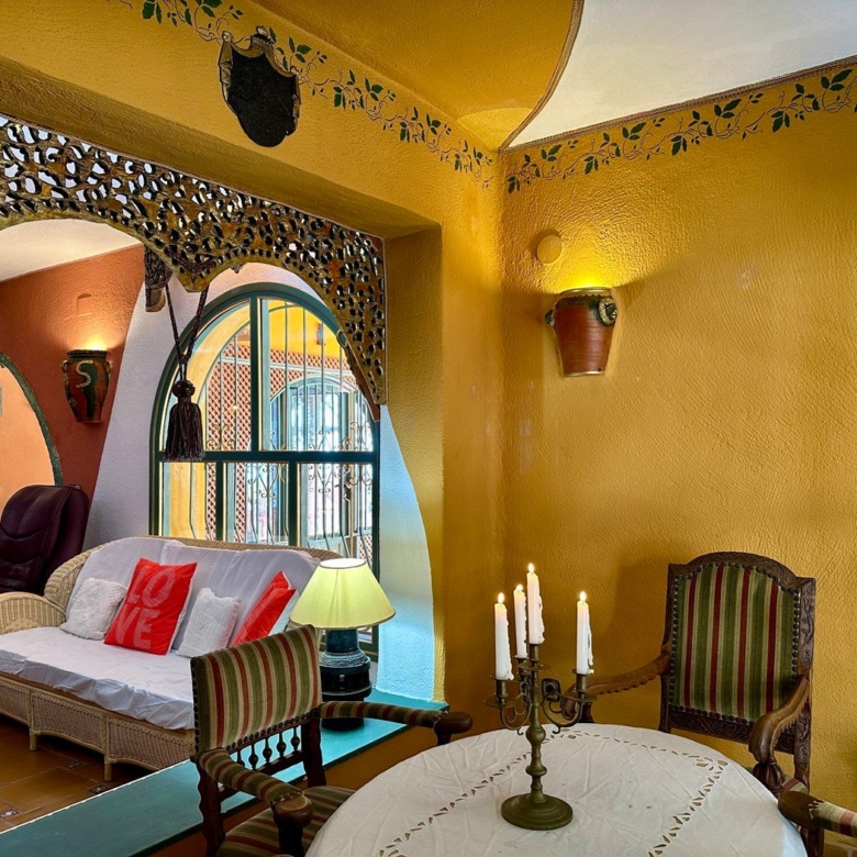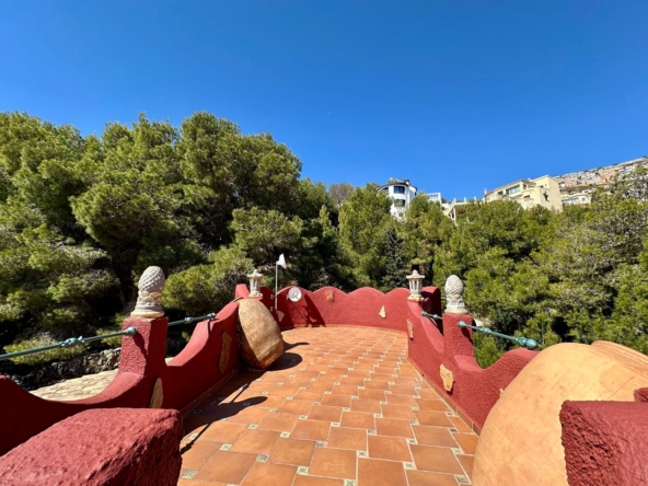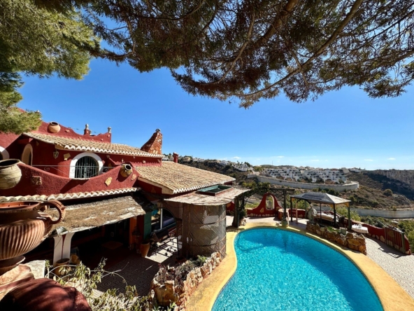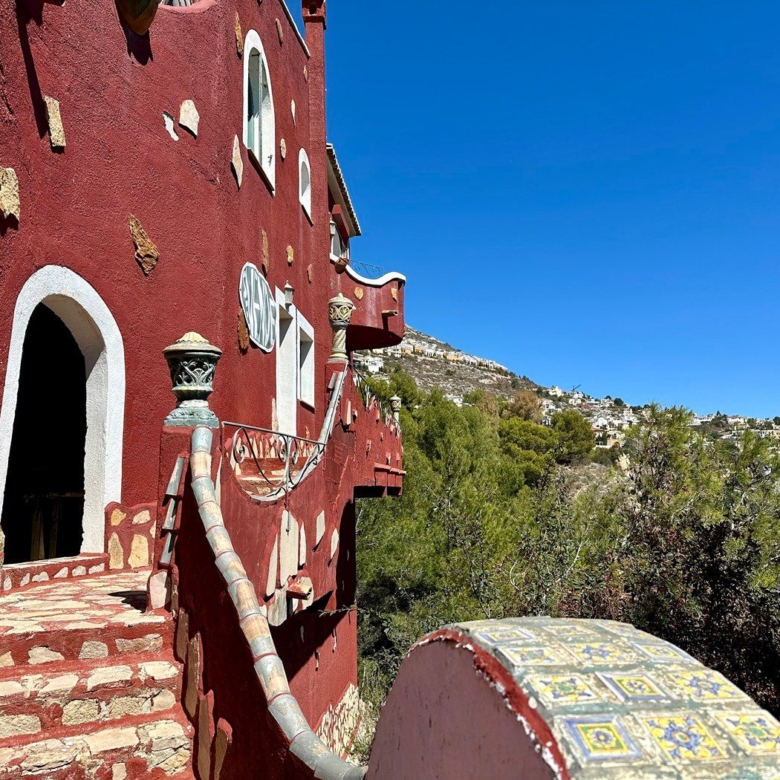 Inspired by the Austrian artist Friedensreich Hundertwasser, this villa stands out for its absence of straight lines and its bright colors that evoke nature. It has wooden finishes, sculptures, undulating walls and a garden full of charming corners. The ground floor has a dining room overlooking the pool, living room with fireplace, kitchen, another dining room, two bedrooms and two bathrooms en suite. The first floor houses another bedroom with bathroom, terrace and solarium adorned with large amphorae and 360º panoramic views.