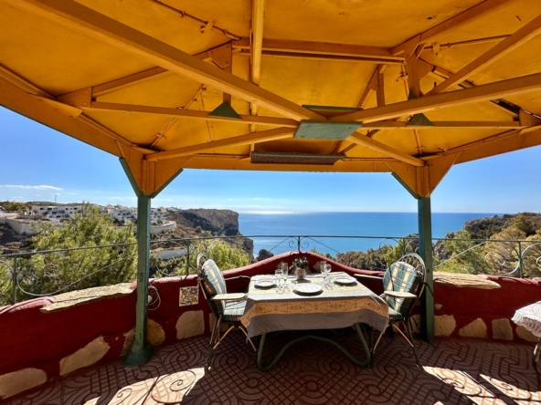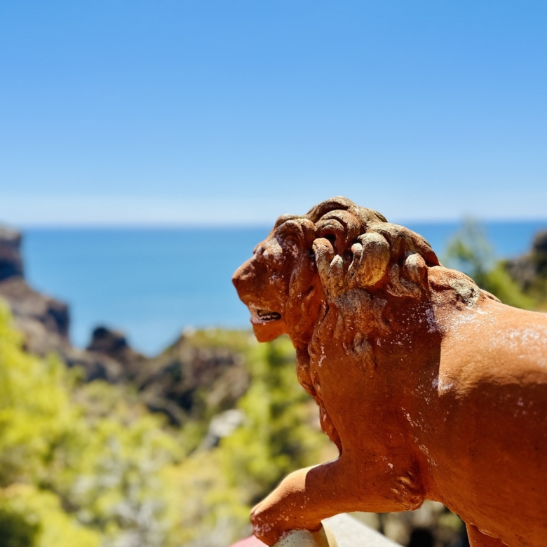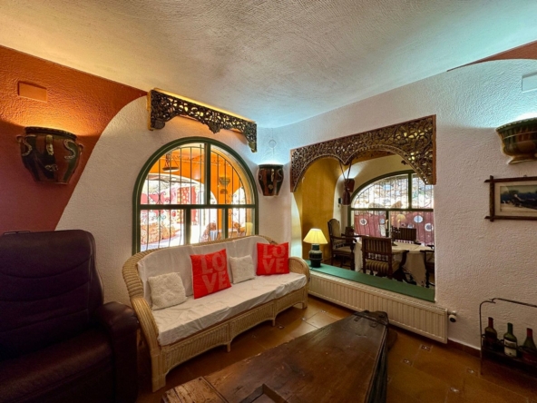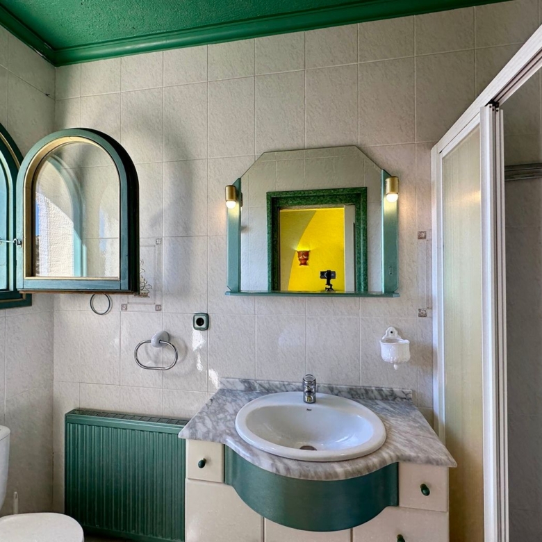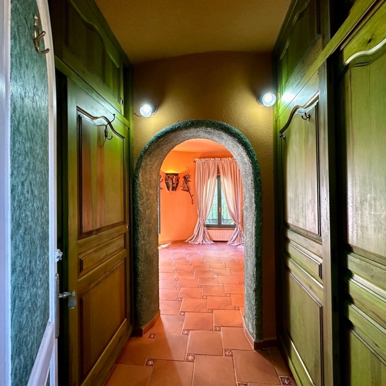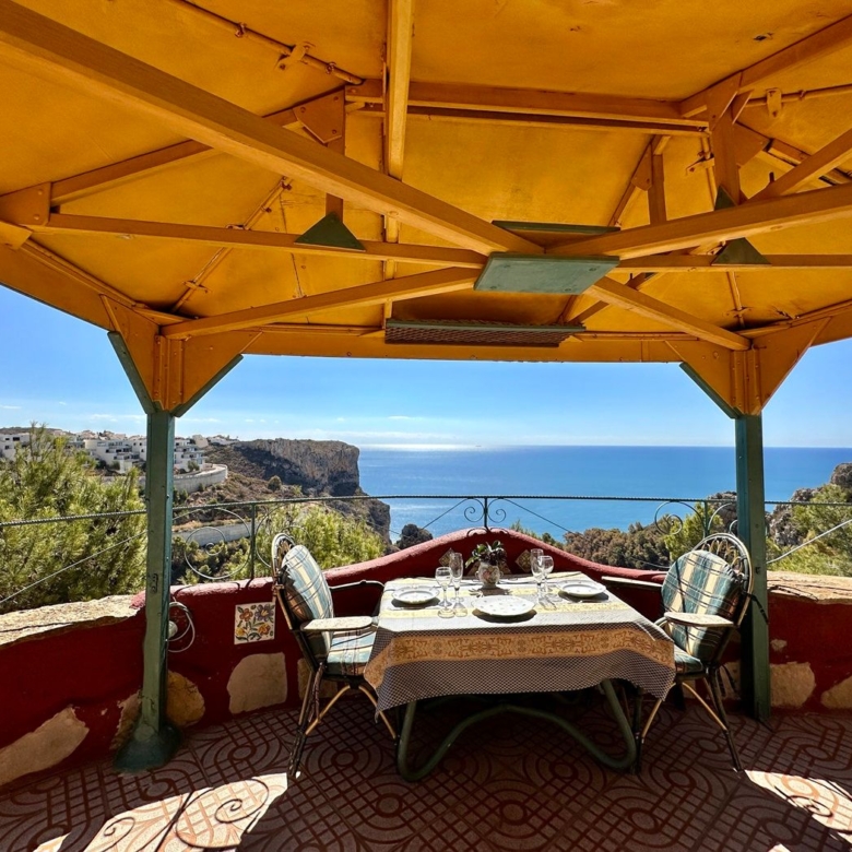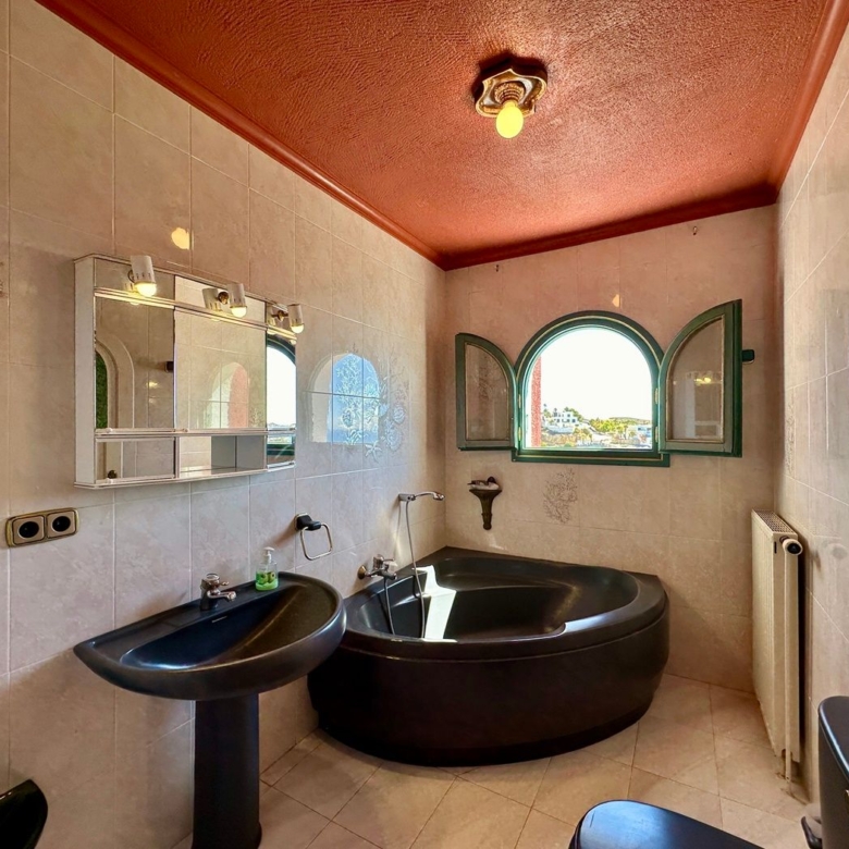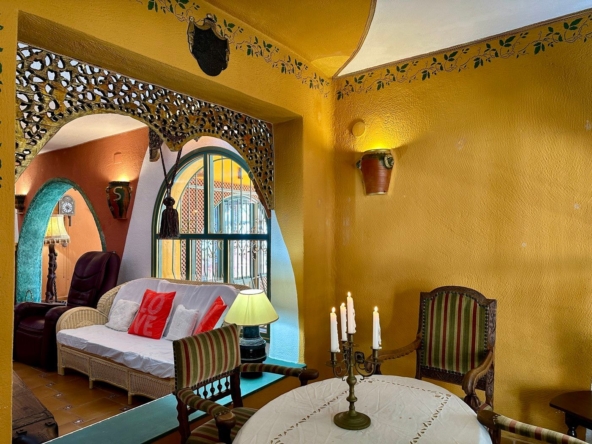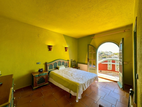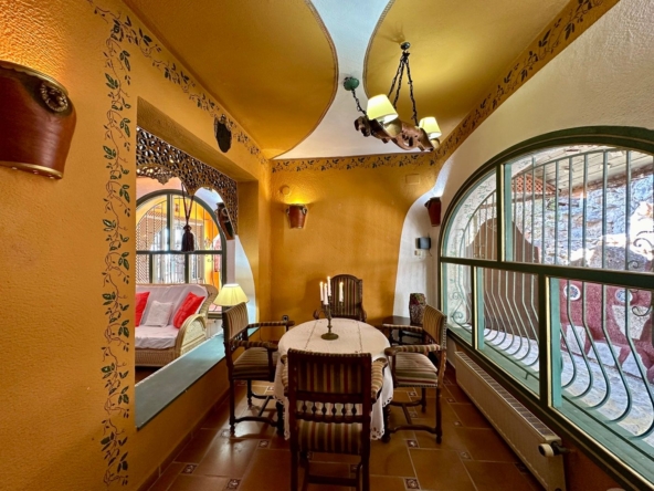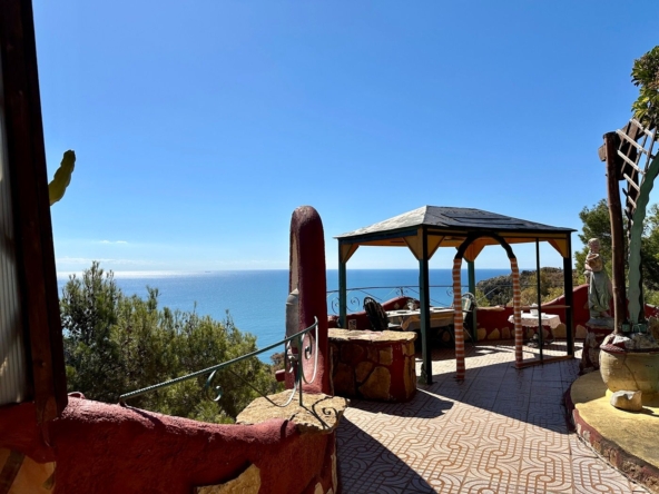 Inspired by the Austrian artist Friedensreich Hundertwasser, this villa stands out for its absence of straight lines and its bright colors that evoke nature. It has wooden finishes, sculptures, undulating walls and a garden full of charming corners. The ground floor has a dining room overlooking the pool, living room with fireplace, kitchen, another dining room, two bedrooms and two bathrooms en suite. The first floor houses another bedroom with bathroom, terrace and solarium adorned with large amphorae and 360º panoramic views.
