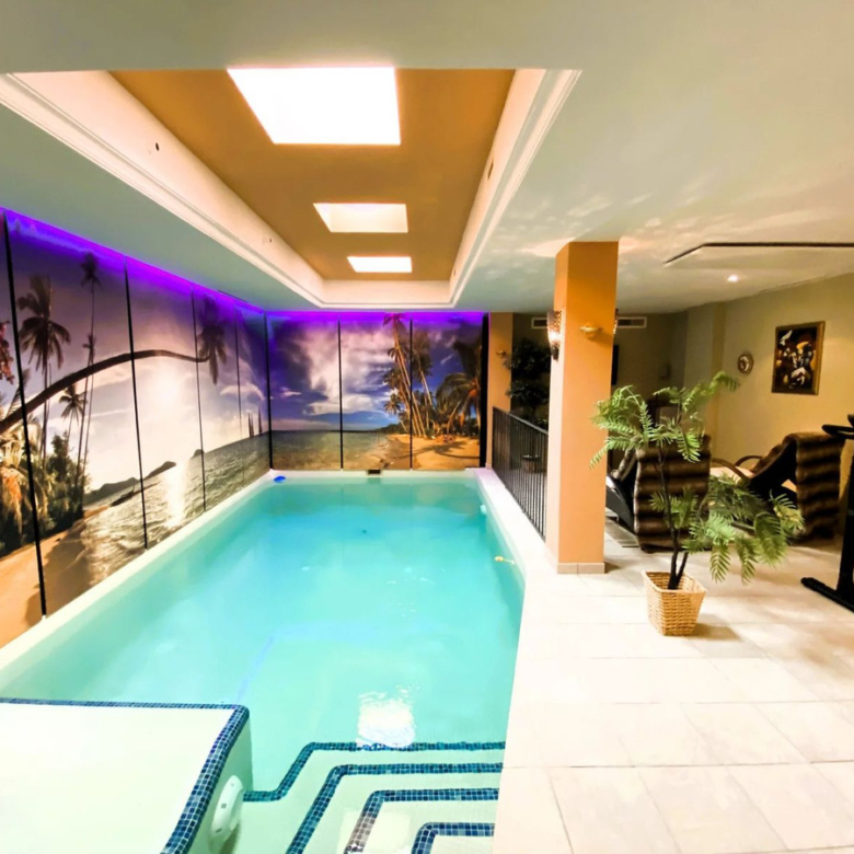 The ground floor offers respite with a large indoor swimming pool, ideal for year-round enjoyment. Two bedrooms, a bathroom, a generously sized sitting area/library, and a versatile living or play area with a billiards table provide ample space for leisure. Additionally, a separate laundry room and access to the spacious garage can be found on this level.