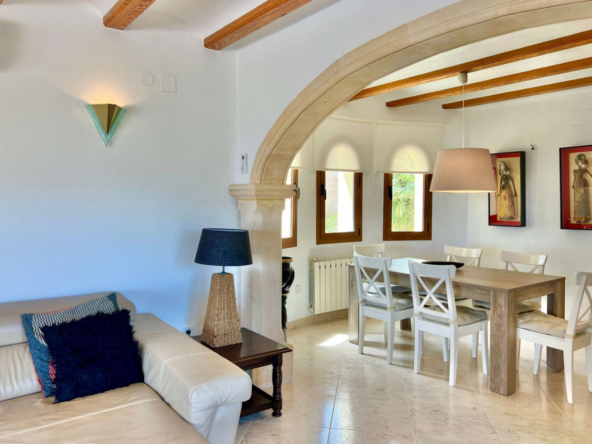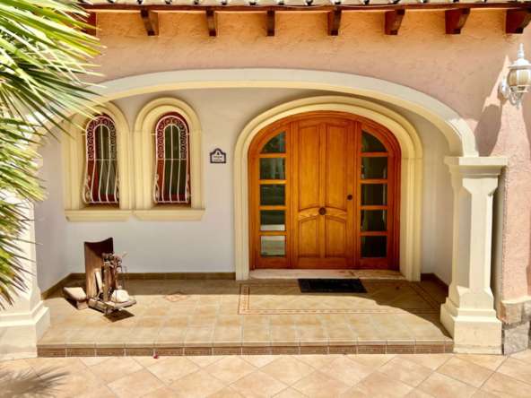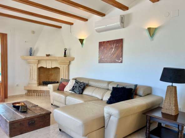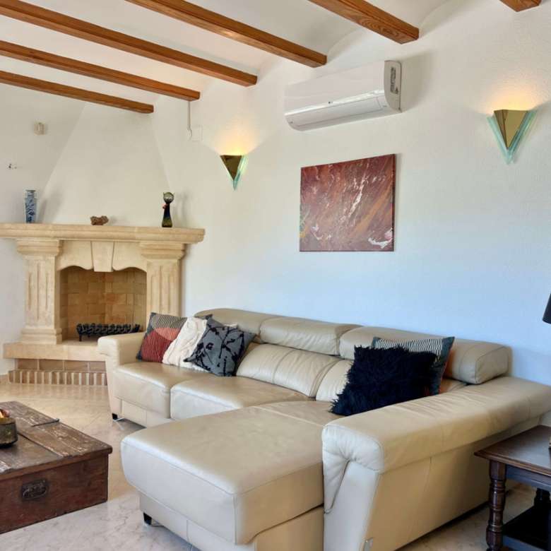 On the edge of protected nature reserve, in an oasis of tranquillity and with lovely views, you will find this villa in traditional Spanish style. The property consists of 2 levels and can be perfectly used as 2 separate living units. You can access the villa via the automatic sliding gate or the separate pedestrian entrance. The entrance has a spacious hall, with the beautiful arches of the staircase hall immediately attracting attention. From the entrance there is direct access to the living area and kitchen on the one hand, and the sleeping area on the other. The master bedroom, with dressing room has en suite bathroom. This luxurious bathroom includes a large whirlpool bath and offers lovely views of nature. There is also a second bedroom and bathroom, as well as the technical room with heat pump. From the spacious and bright living room, divided into dining room and lounge with fireplace, there are already views of Calpe’s famous rock! On this side of the villa is also the covered terrace and pool, surrounded by tropical plants and equipped with outdoor shower and relaxation corner. The ground floor, accessible via external or internal stairs, enjoys the extensive terrace, private garden and laundry and storage areas and includes the separate flat. This has a sitting area, open-plan kitchen, two bedrooms and two bathrooms. There is a private entrance and the flat can also be locked into the house from the upper floor. Enjoying privacy and views from here too! Much attention was paid to quality and energy saving. Among other things, the outdoor terrace was re-tiled. In other words, this lovely villa is ready to move in and enjoy peace and quiet and sunshine.