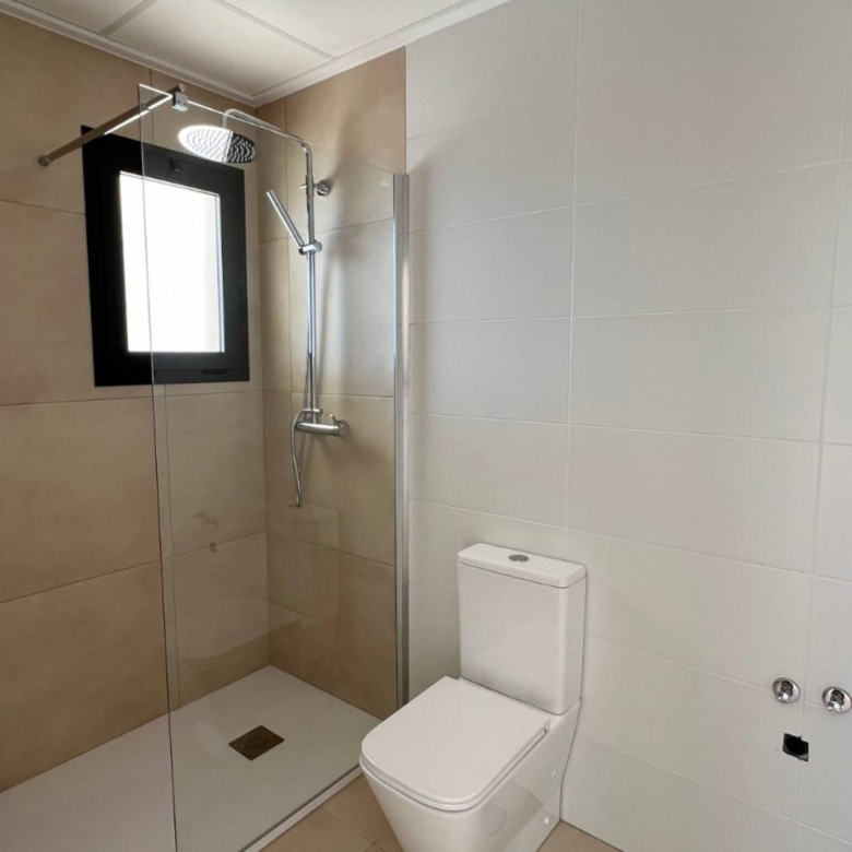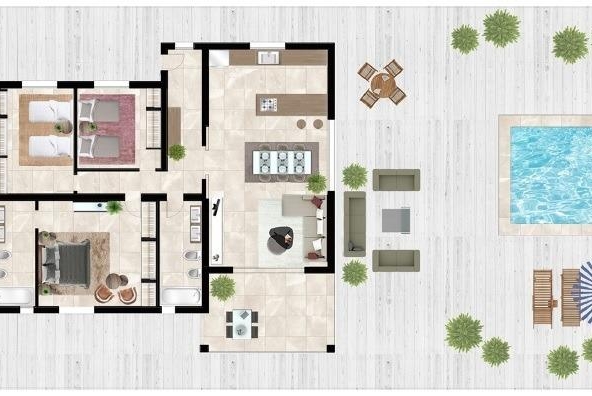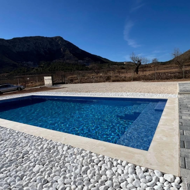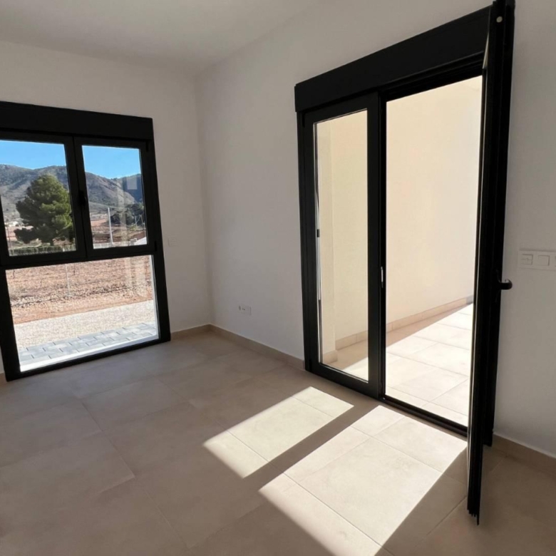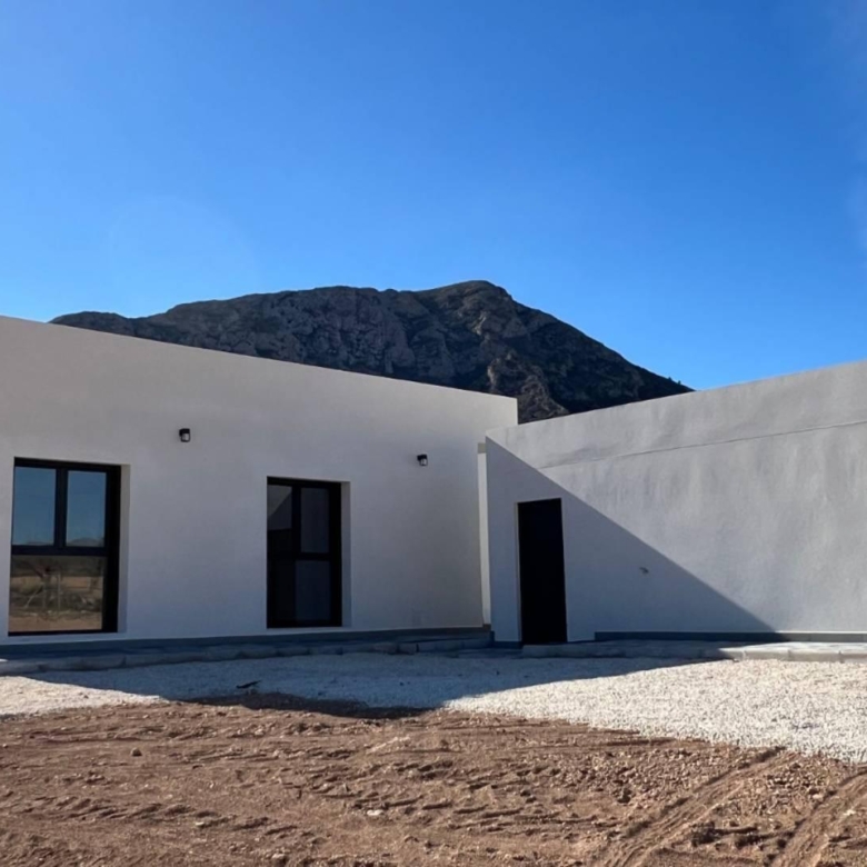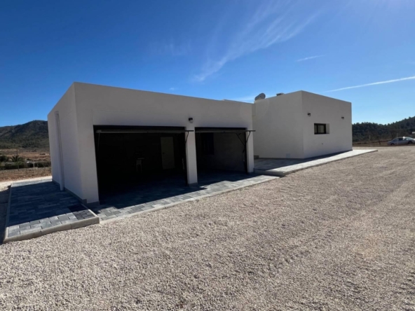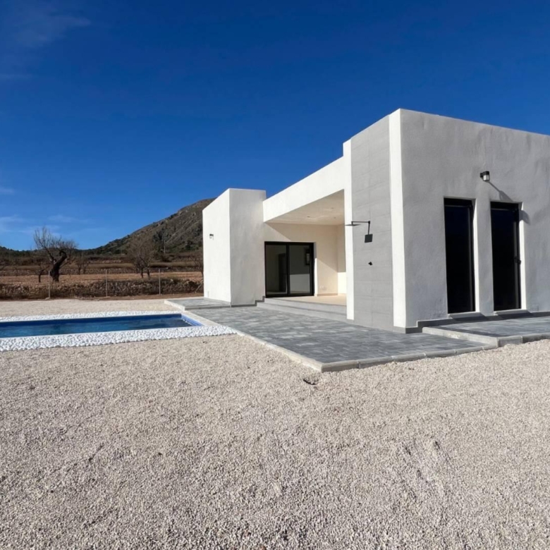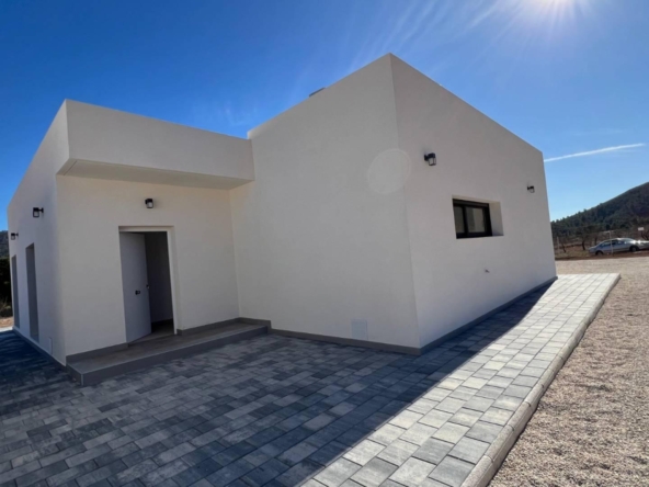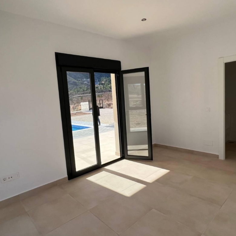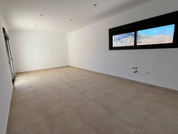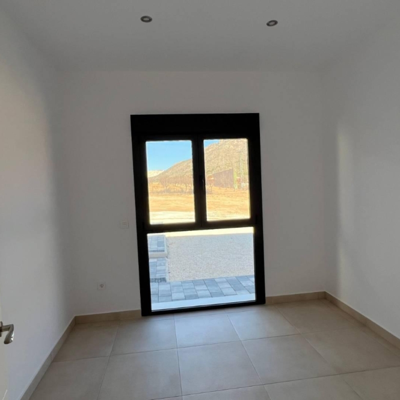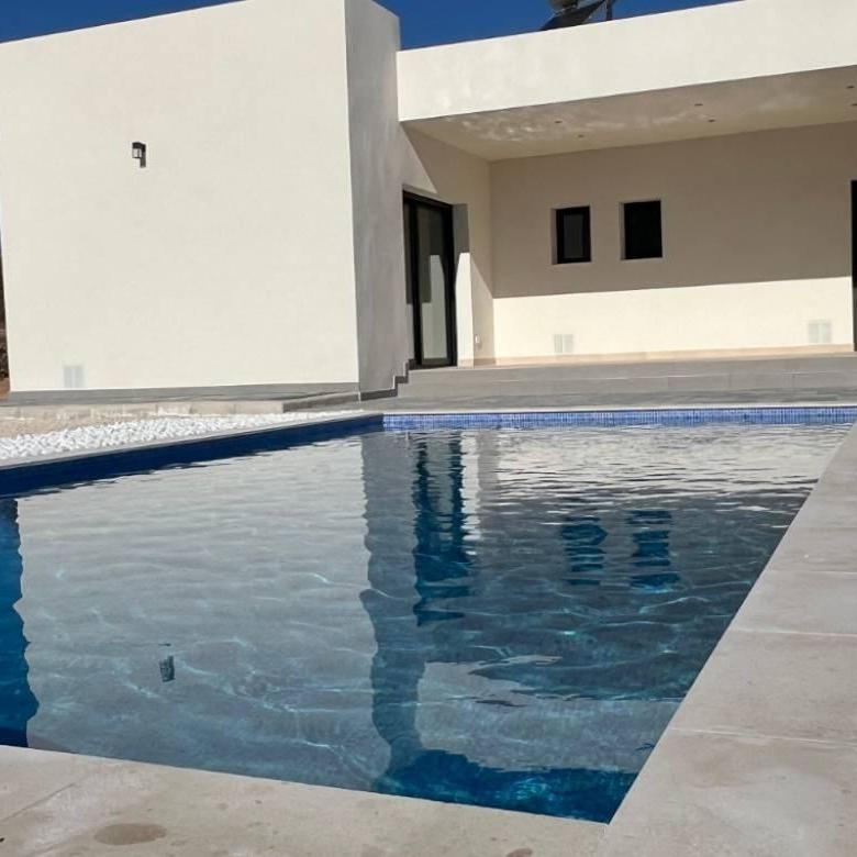 Modern one level villa built on a huge plot of 5,000 m2, has 3 bedrooms, 2 bathrooms, guest toilet, open-plan fitted kitchen with spacious living-dining room, large floor-to-ceiling windows with a lot of natural light, built-in wardrobes.
