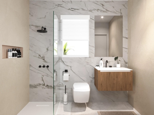 Fully equipped bathrooms, including built-in niches in showers, mirrors with lighting, and vanity units.