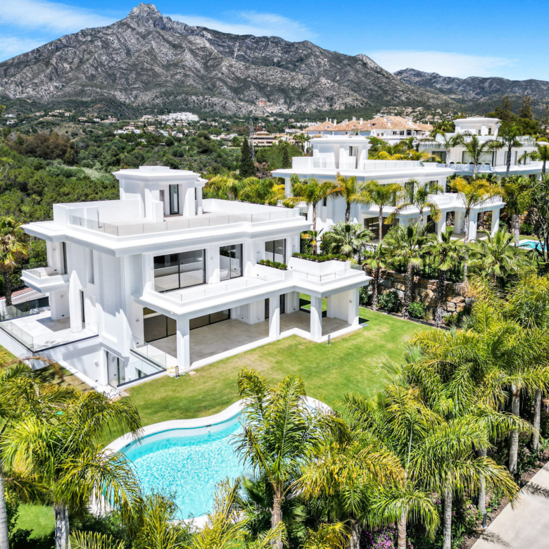 The interior of these villas in Marbella is designed to offer maximum comfort and functionality. With six bedrooms and six bathrooms, each property guarantees space and privacy for all family members. Wooden floors add warmth and elegance to the spaces, while the underfloor heating system ensures a cozy environment throughout the year. The villas are equipped with air conditioning and a home automation system, providing total control over the home’s environment. High-end appliances and built-in wardrobes complete the equipment of these properties, ensuring every need is covered. Additionally, each villa has a private garage, offering convenience and security for vehicles.