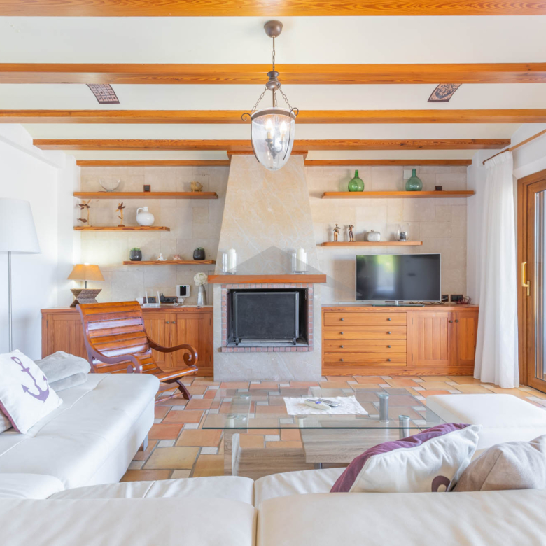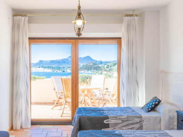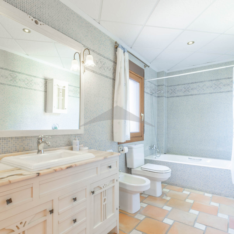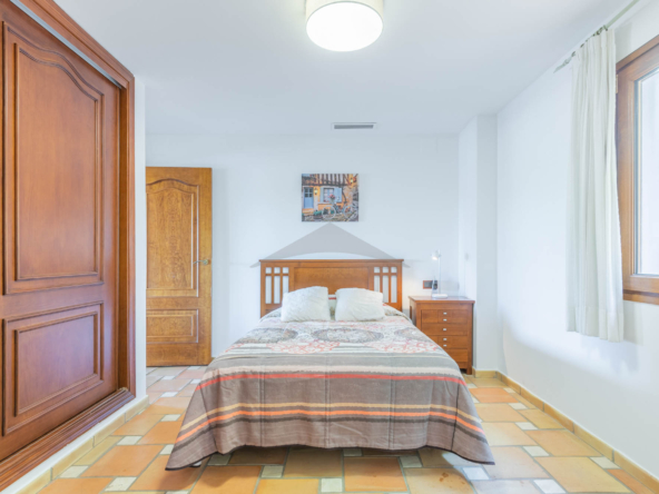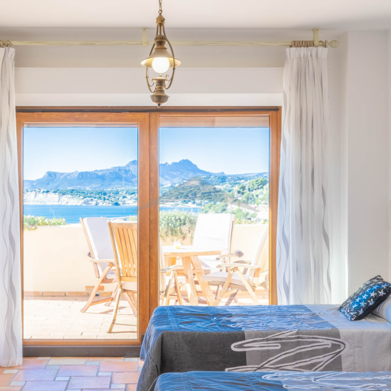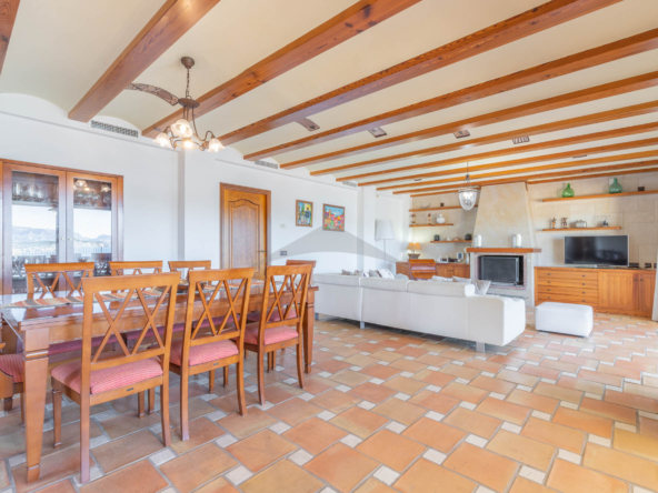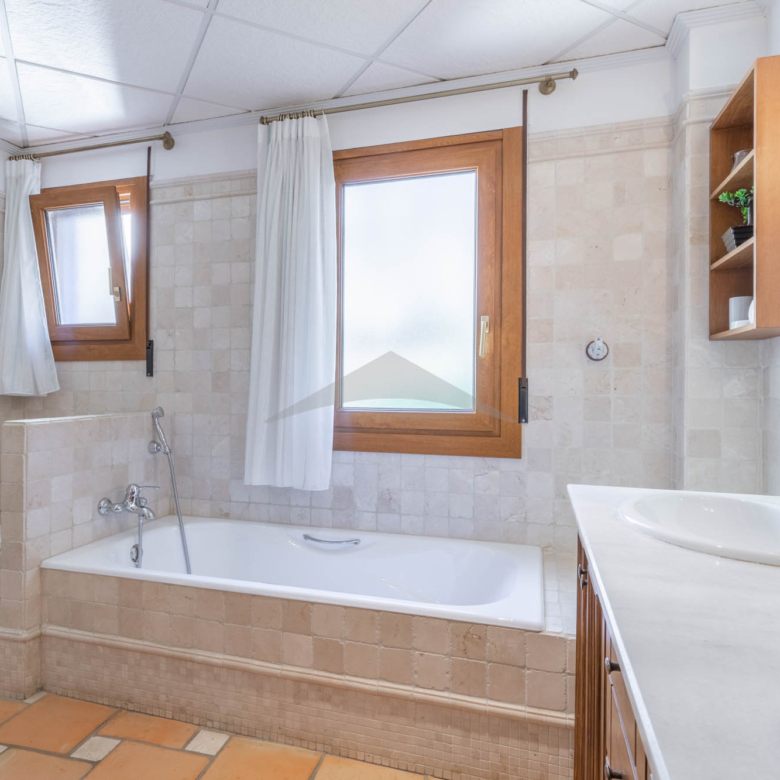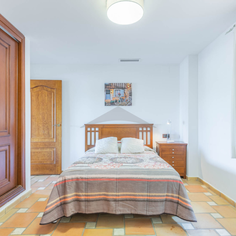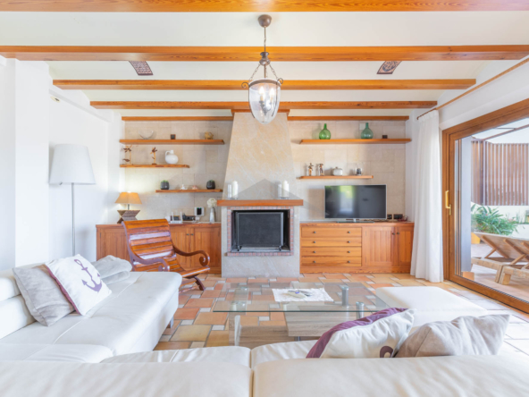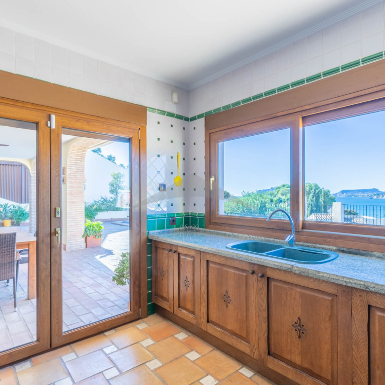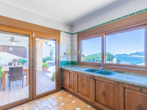 This Villa Just a Few Steps from El Portet Beach consists of two floors connected by an internal staircase. On the ground floor of the house, pool level, which can be entered through the beautiful front door, leads into the spacious living/dining room with wood-burning stove. This room has direct access to the outside terrace through the large sliding windows. Next to the living/dining room is the large kitchen, fully equipped with quality appliances. A great advantage of this kitchen is the extra storage space that makes it a very practical kitchen. Also, the kitchen has direct access to the pool terrace and the naya. As well, on this floor you will find a double bedroom with ensuite bathroom.