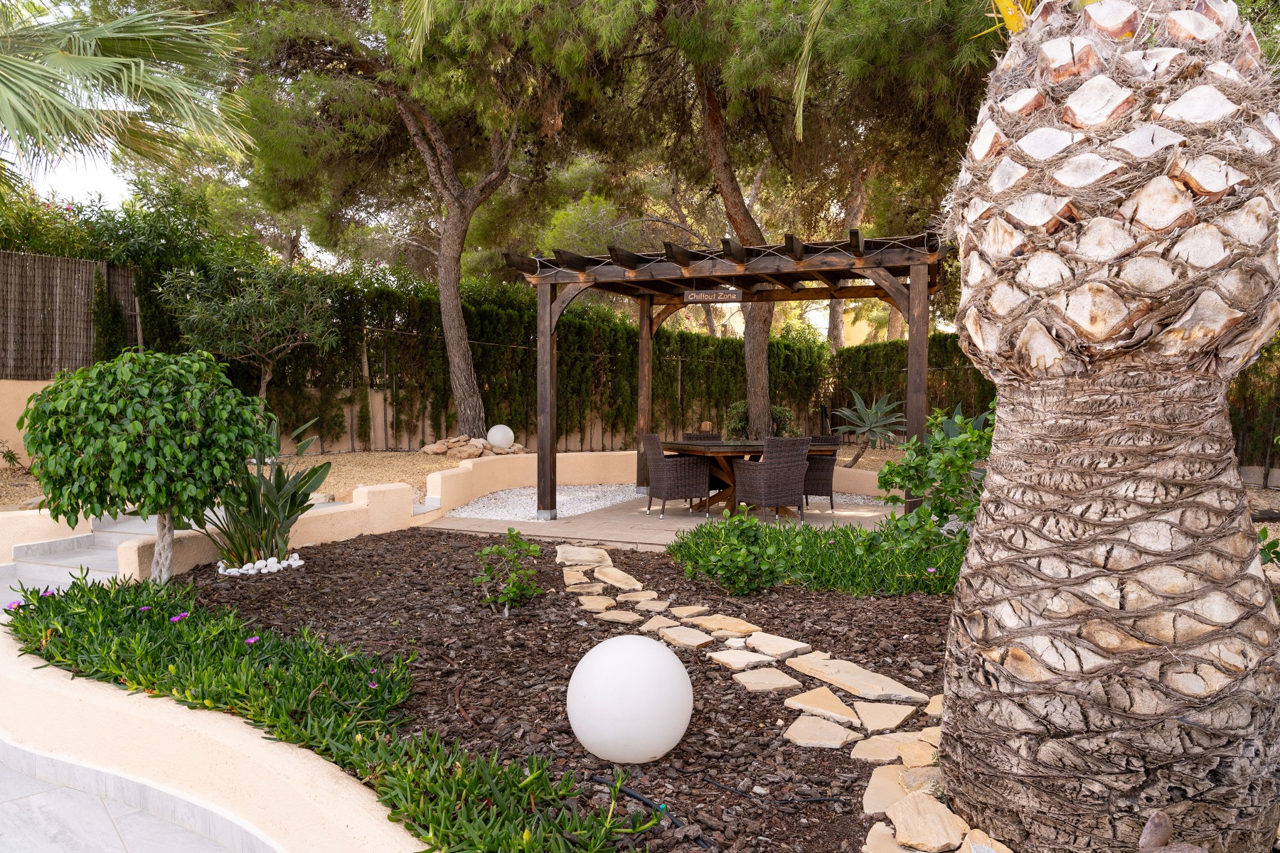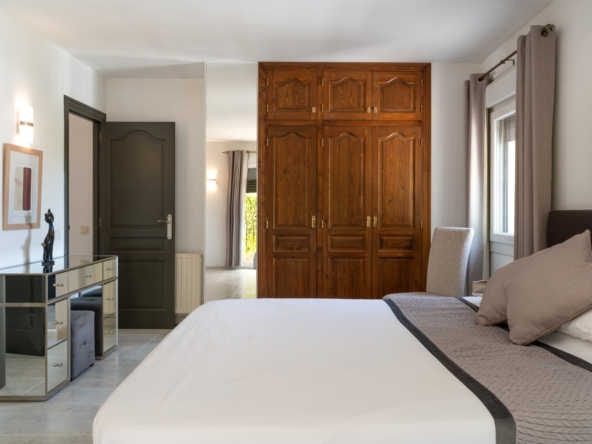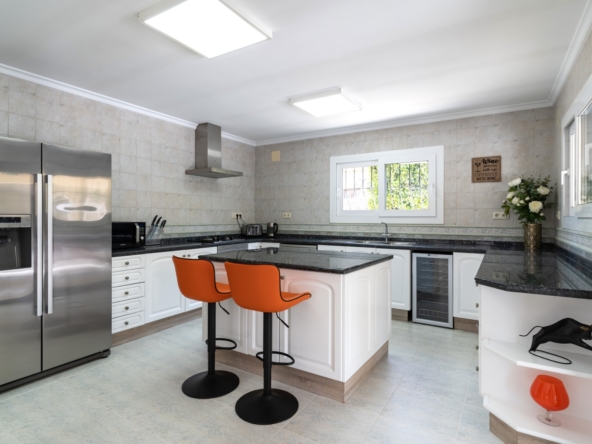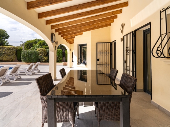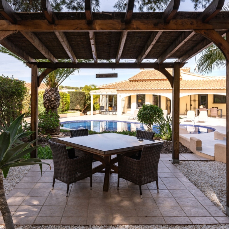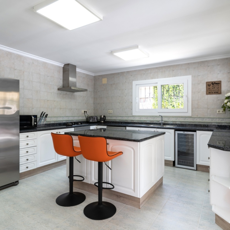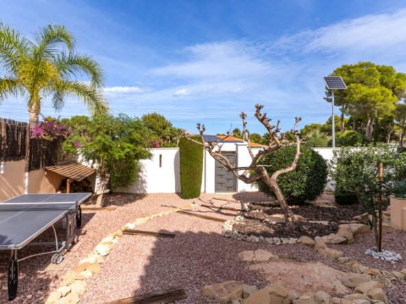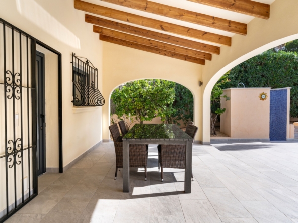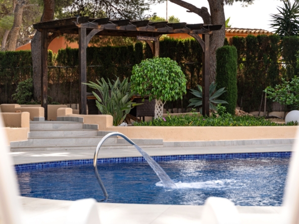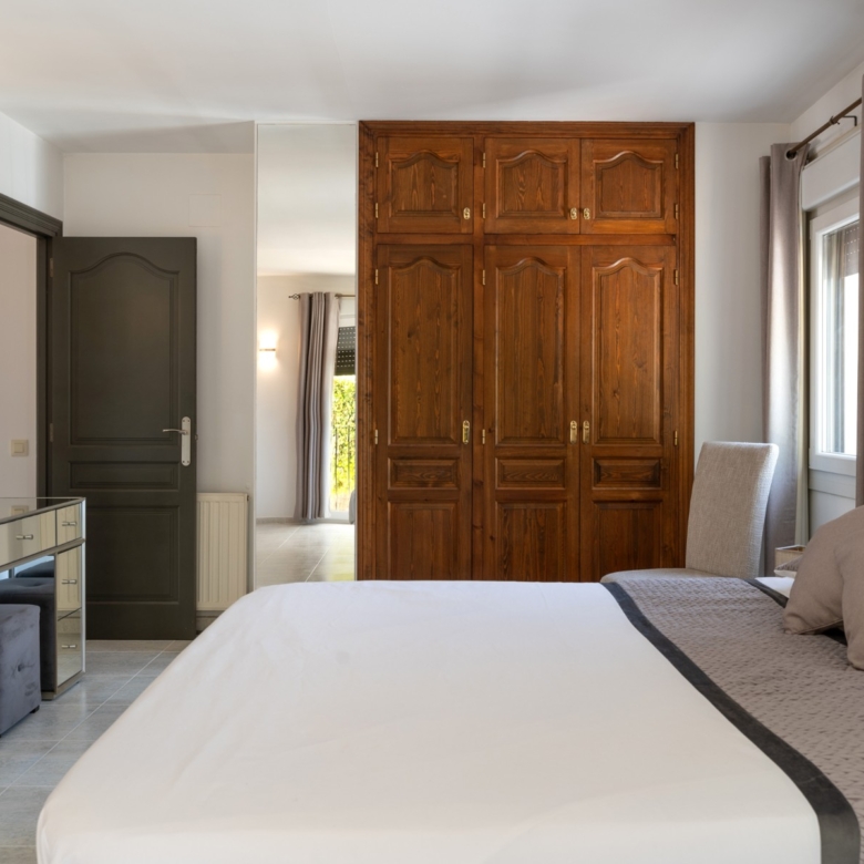 Layout and Living SpaceThe villa is entirely on one level, making it both practical and comfortable. As you enter, you are welcomed into a spacious, light-filled living room that seamlessly flows into the dining area and the modern open-plan kitchen. This kitchen features a stylish island, high-quality built-in appliances, and offers plenty of space for cooking and dining with family and friends. Thanks to the open layout, you will enjoy a harmonious connection between the living areas, creating a spacious feel while allowing natural light to flow throughout the home.The living room provides direct access to the large covered terrace. Here, you can relax all year round, whether in the shade or the sun, while enjoying views of the sparkling pool and the extensive surrounding terraces. This outdoor space is perfect for taking advantage of the Mediterranean climate, whether you’re sunbathing, dining al fresco, or simply relaxing in your private, peaceful garden with full privacy. The beautifully landscaped and fully enclosed garden offers plenty of privacy, making it a tranquil oasis of peace and beauty.
