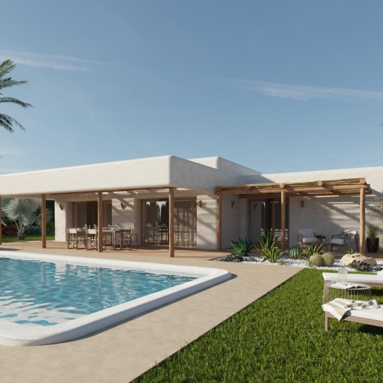 Choose from several villa models with 2, 3 or 4 bedrooms and 2 bathrooms (one of them en suite), all designed on a single floor for maximum comfort. The final price is calculated based on the chosen design, the construction system (slab or structure) and the selected plot. For this advertisement, a plot priced at €73,000 has been considered. If another plot is chosen, the difference will be paid or charged depending on the price of the plot.