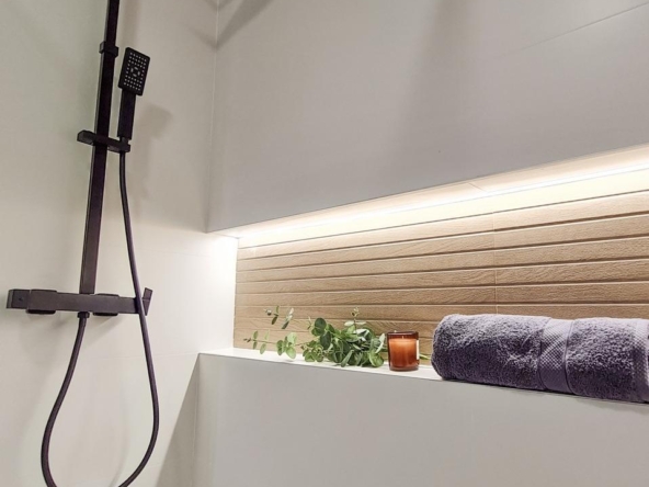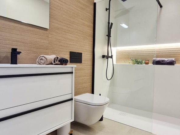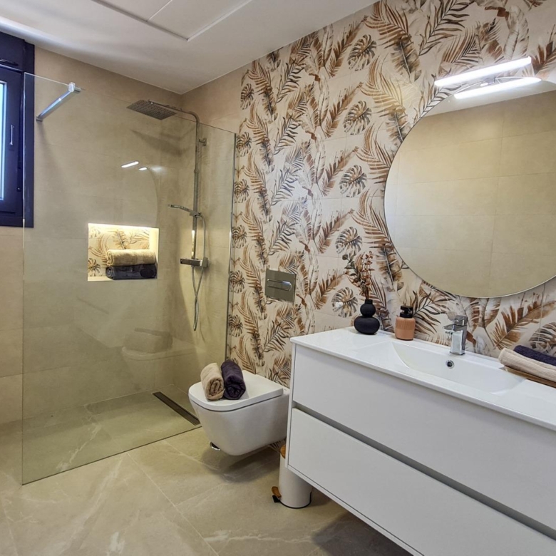 Complete bathrooms with washbasin unit, wall-hung toilet with built-in cistern, mirror, rain-effect shower and screens.