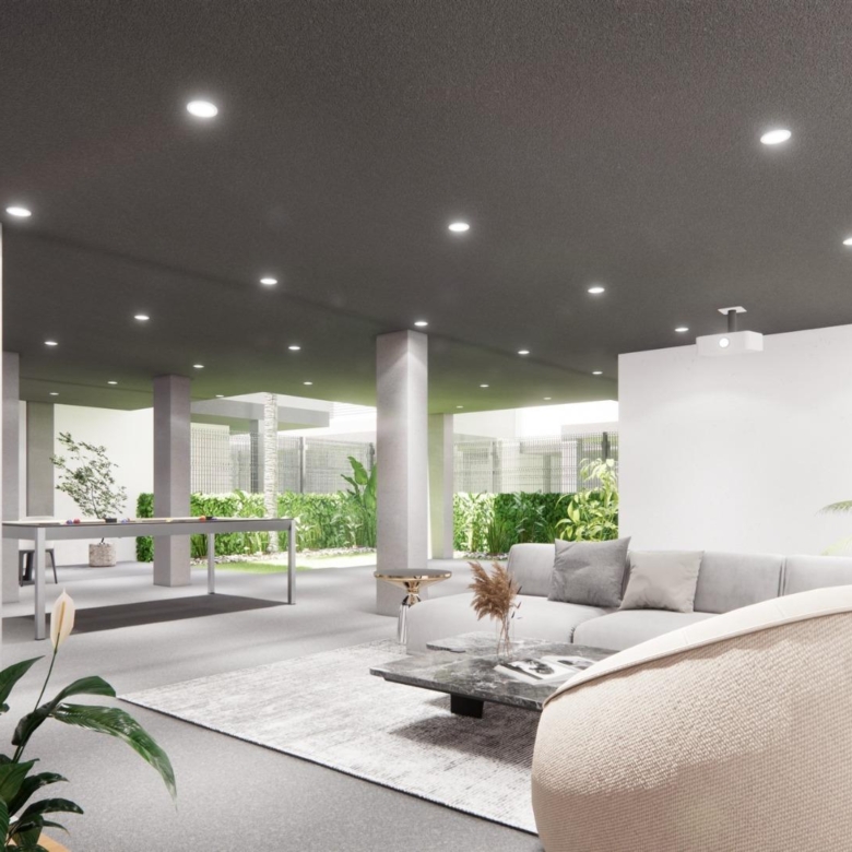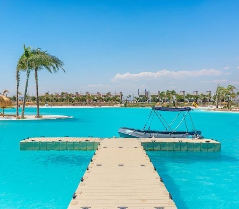 It comprises walking and cycling paths, sport facilities, paddle and tennis courts, a mini-golf course, gardens, dog parks, leisure areas, clubhouse…. Also in the central area is the jewel of the resort, a crystal-clear artificial lake of almost 17.000m2 of water surface, surrounded by white sandy beaches and palm trees, bringing a piece of the Caribbean to the Murcia Region.