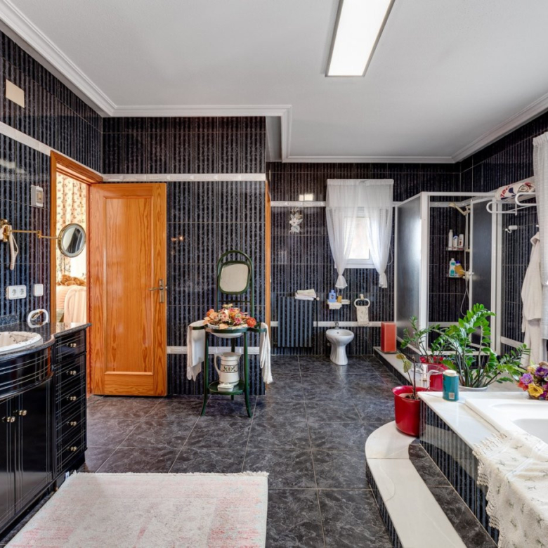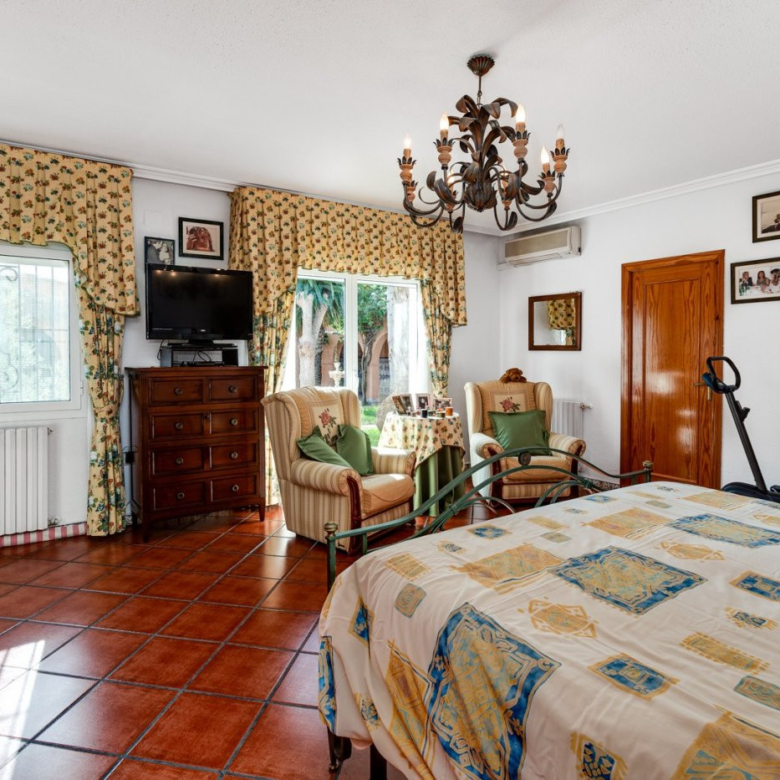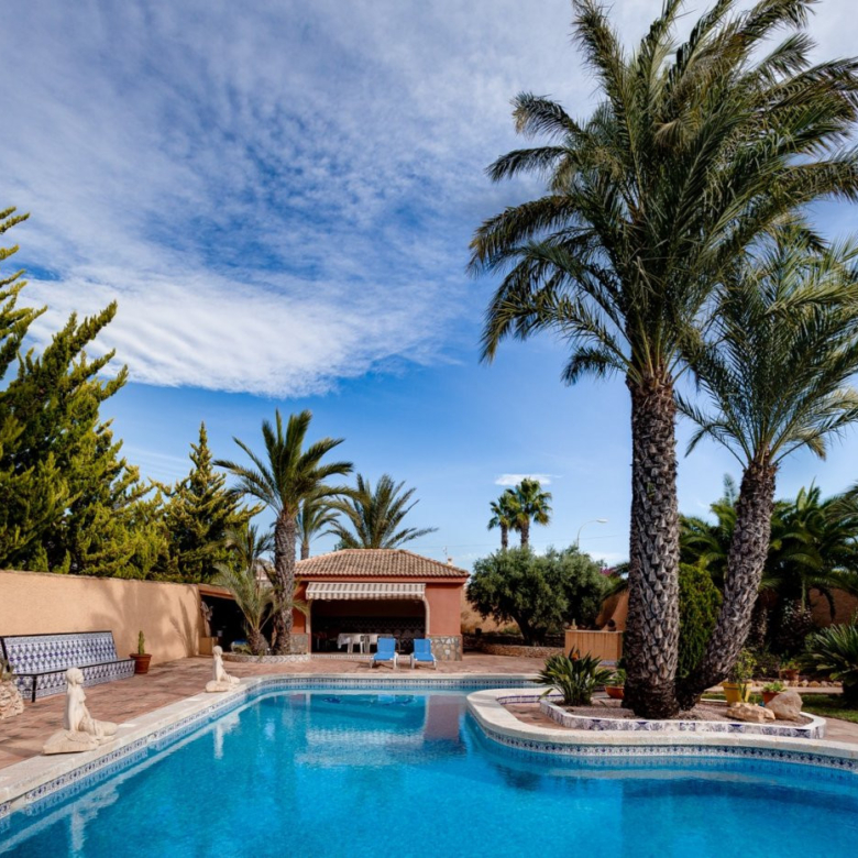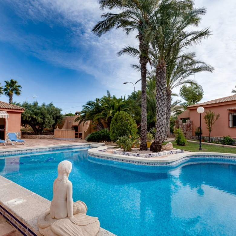 We are pleased to offer you this beautiful luxury villa with 5 bedrooms, 3 bathrooms, the main bathroom with jacuzzi and shower, equipped and independent kitchen, warehouse of 90 square meters which has been renovated and made a 1 bedroom apartment with kitchen and bathroom, 66 square meter sports area, garden, 31 square meter parking, terraces, barbecue, private pool, large living room and dining area, large kitchen with breakfast area, multipurpose area and a terrace overlooking the patio, pool private to make use of the 300 sunny days of the region. Going out there is fantastic with the pool surrounded by a sunny terrace and gardens along with parking area and additional storage area, and much more. Very close to the Laguna Rosa de Torrevieja, in the area of San Luis, La Siesta. The house has a plot of 1850 square meters. Housing with a constructed area of 568 square meters. It is a detached house built on the ground floor, living room, kitchen, passage, bathroom, bedrooms and other rooms and with a useful area of 371 square meters, and upstairs with a tower of about 25 square meters and a covered terrace together to him of about 30 square meters, communicating the ground floor with the Tower by an internal staircase. About 5 minutes from the city of Torrevieja. Located just a few minutes drive from the main AP-7 motorway, with easy access to both Murcia and Alicante airports. If you are going on vacation, here are some ideas for excursions to get the most out of the south of the Costa Blanca: 1. Visit the inner area of Elche famous for its palm grove. 2. Go south and enjoy La Manga. 3. The historic cities of Murcia and Cartagena are not far. 4. If you want history, Rojales has a special charm with its cave houses.