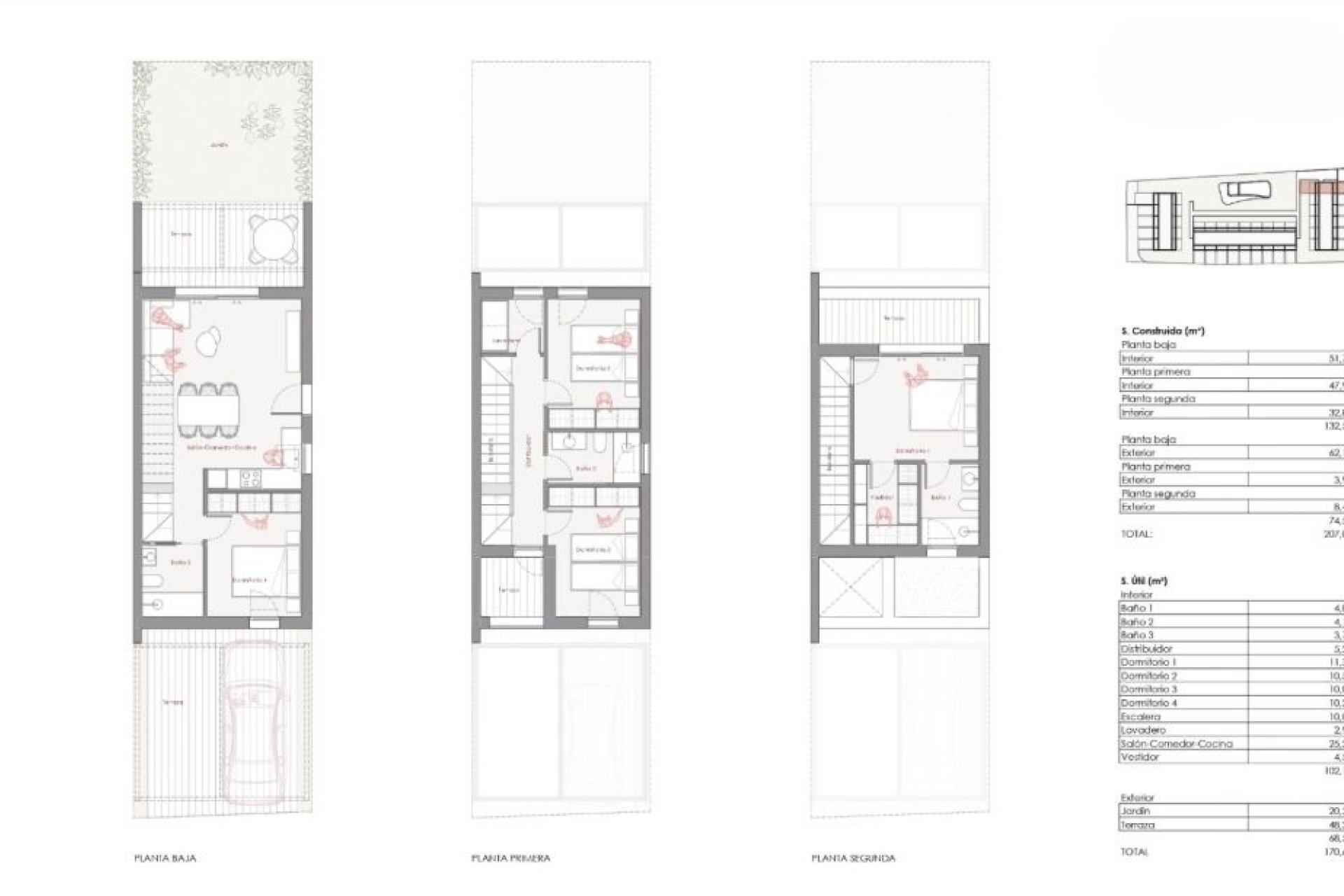 El interior de los adosados está diseñado con atención al detalle, incorporando suelos de gres porcelánico que aportan un toque moderno y elegante. Las viviendas están equipadas con aire acondicionado para asegurar el máximo confort durante todo el año. La cocina está completamente equipada con electrodomésticos modernos, y los armarios empotrados en los dormitorios ofrecen un amplio espacio de almacenamiento. Cada adosado dispone de tres dormitorios y tres baños, proporcionando un espacio generoso para toda la familia. Además, cuentan con garaje privado, añadiendo comodidad y seguridad al conjunto.