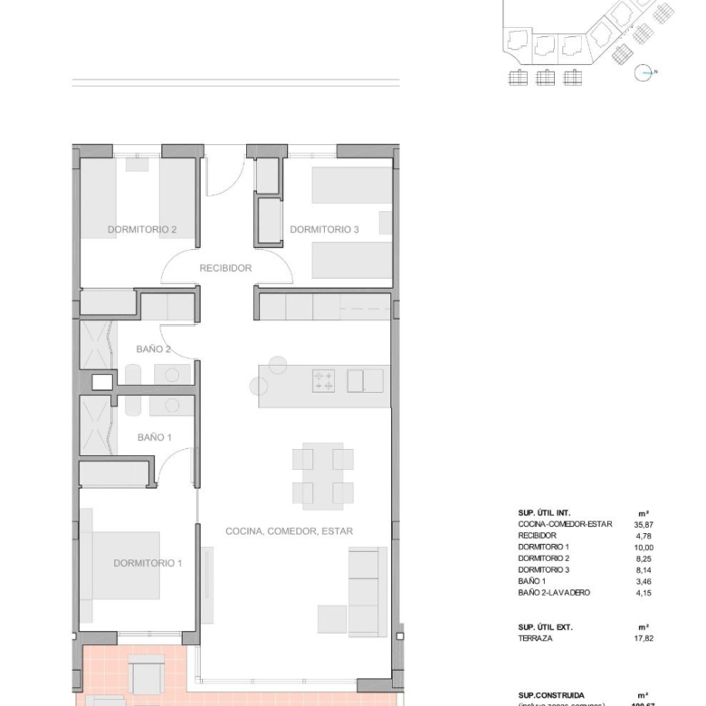 Estos apartamentos disponen de 3 dormitorios, 2 baños, salón diáfano con cocina, planta baja con jardín privado, planta media con terraza y planta alta con solarium privado.