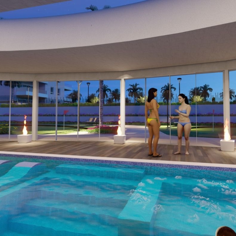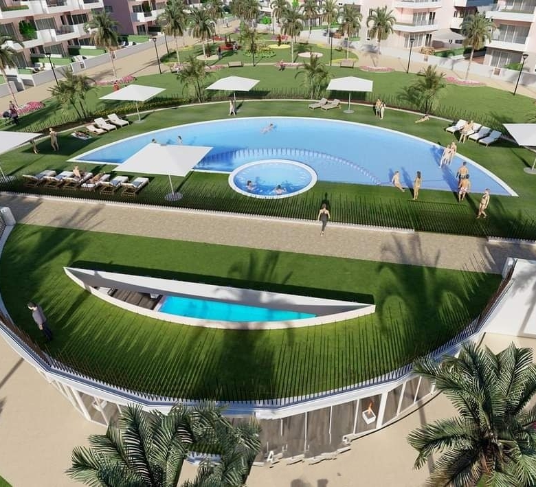 Complejo con piscina, zonas verdes, greens de golf, Spa, parque infantil, maquinas biosaludables y zonas deportivas.