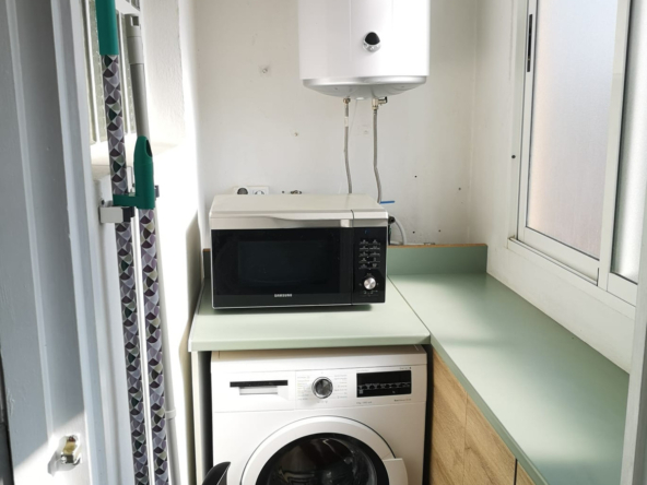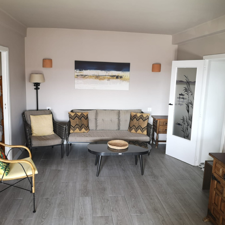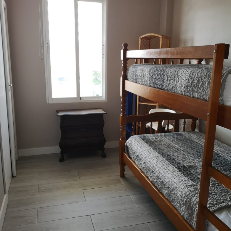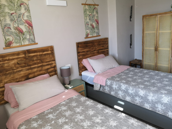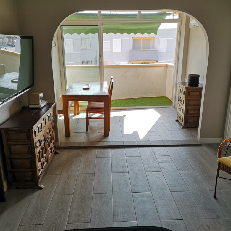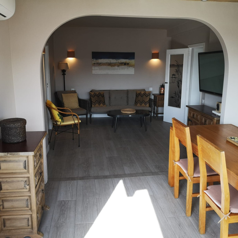 El apartamento cuenta con tres dormitorios, un baño moderno y una amplia sala de estar que se abre a un balcón privado, ideal para relajarse al sol. Equipado con aire acondicionado para mayor confort durante todo el año, este hogar ofrece la combinación perfecta de comodidad y estilo de vida costero.