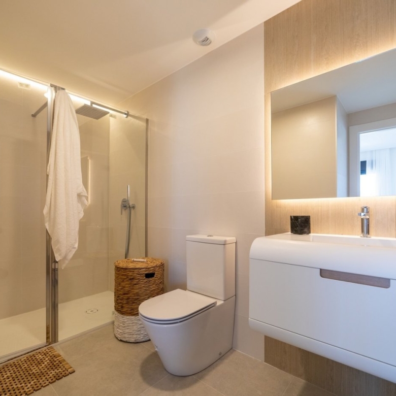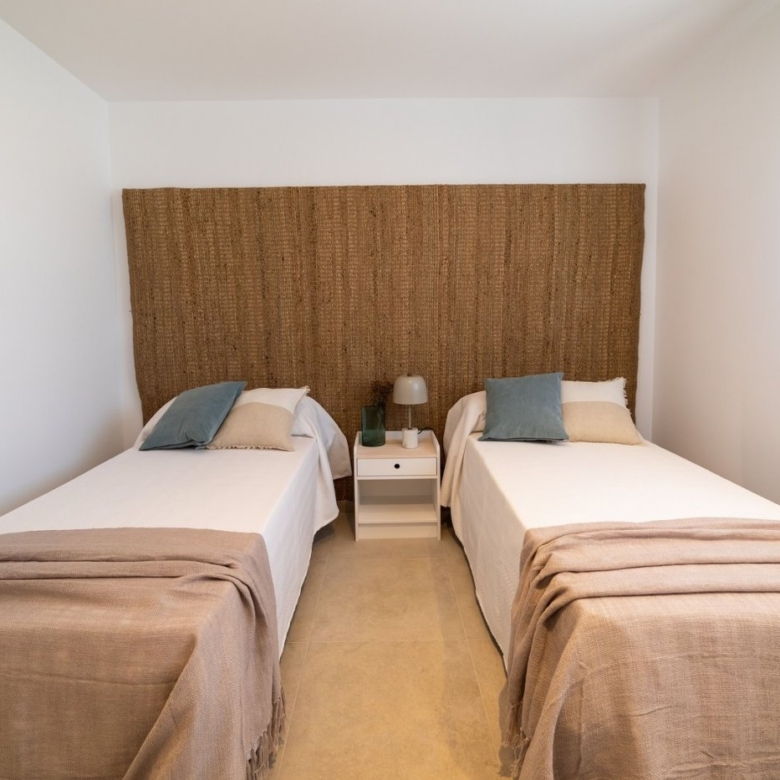 Los apartamentos de 2 y 3 dormitorios y 2 baños, tienen una cuidada distribución y gozan de bonitas vistas al mar, la playa y a la piscina y jardines privados de la urbanización.