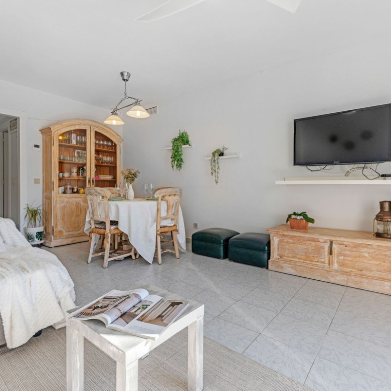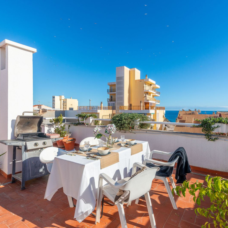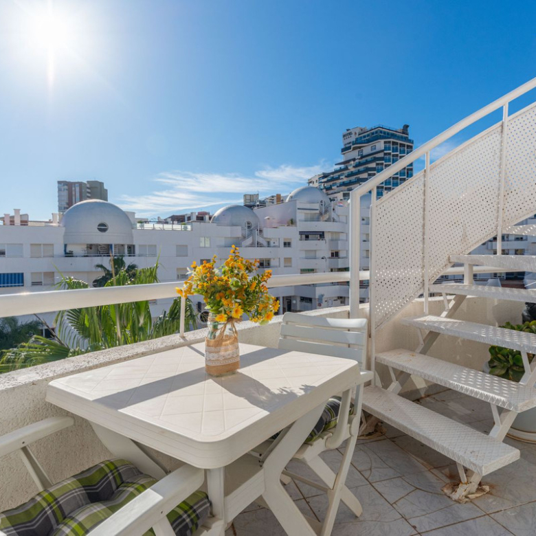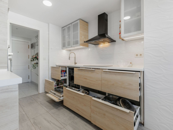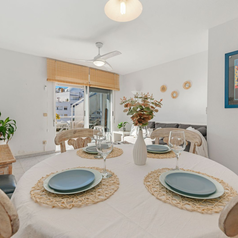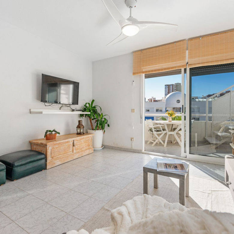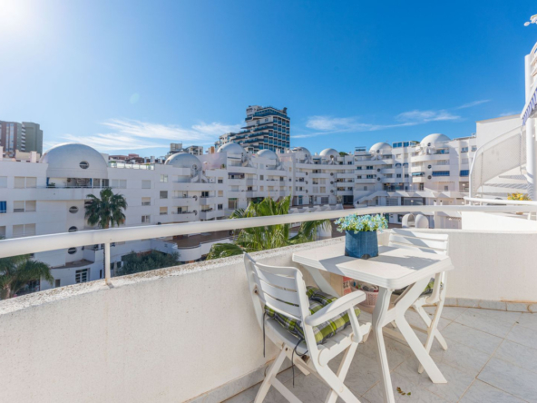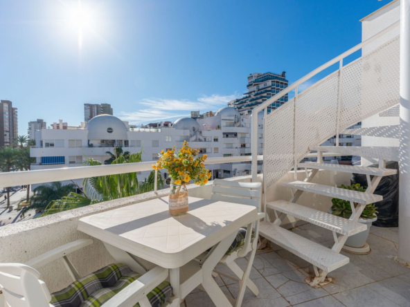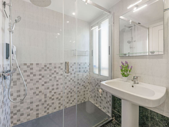 La propiedad, construida en 1994, cuenta con tres dormitorios dobles y dos baños, ambos equipados con duchas renovadas. La cocina ha sido reformada con un diseño moderno y funcional, que ofrece un amplio espacio y una mesa de desayuno. El salón-comedor, luminoso y espacioso, da acceso directo a una terraza exterior con una escalera que sube a la terraza superior. La terraza de esquina privada tiene 86 m² e incluye un gran trastero. Su orientación sur proporciona abundante luz natural y una agradable sensación de amplitud.