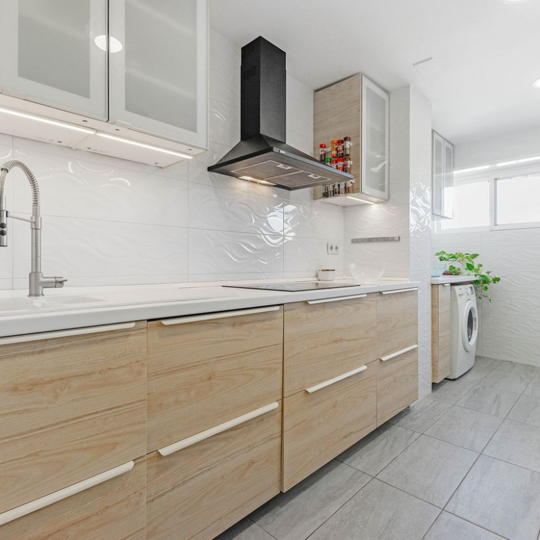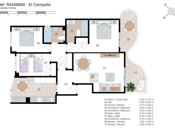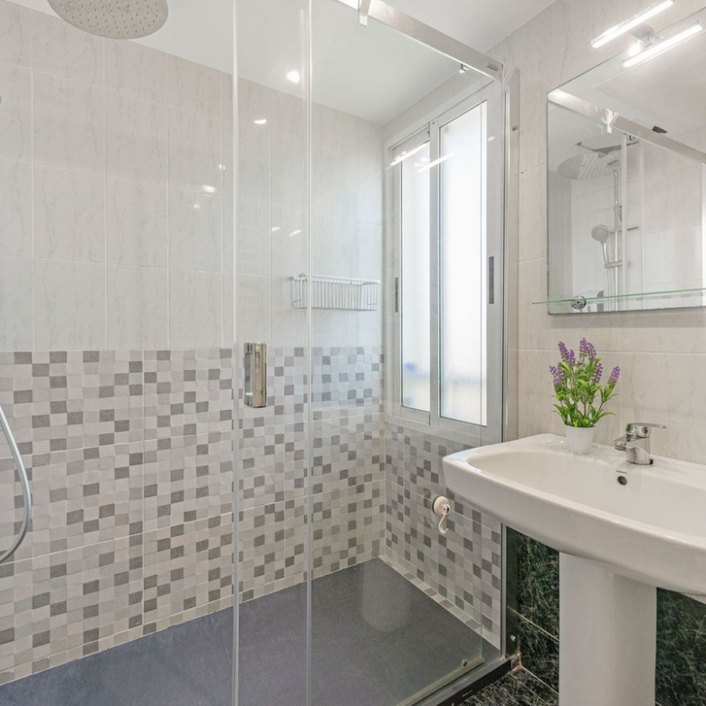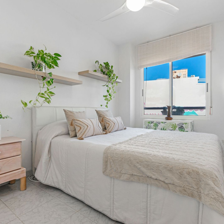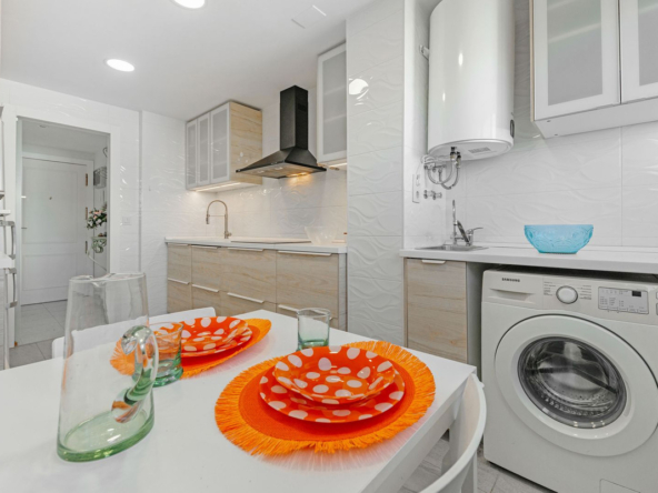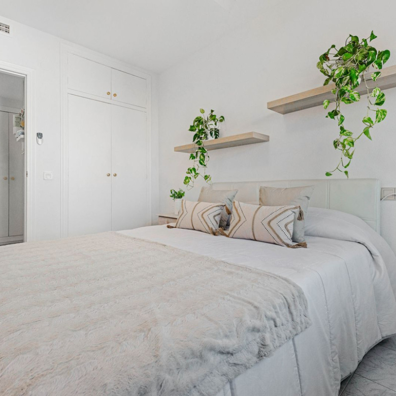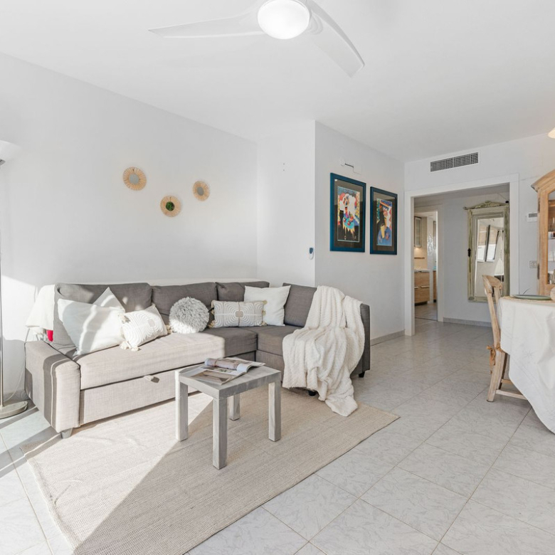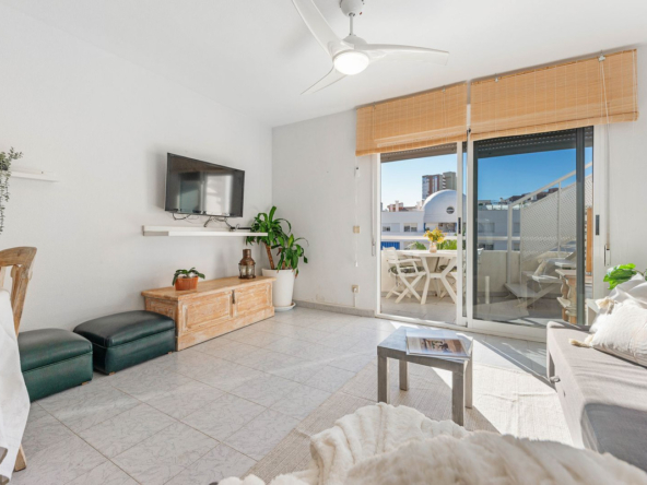 La propiedad, construida en 1994, cuenta con tres dormitorios dobles y dos baños, ambos equipados con duchas renovadas. La cocina ha sido reformada con un diseño moderno y funcional, que ofrece un amplio espacio y una mesa de desayuno. El salón-comedor, luminoso y espacioso, da acceso directo a una terraza exterior con una escalera que sube a la terraza superior. La terraza de esquina privada tiene 86 m² e incluye un gran trastero. Su orientación sur proporciona abundante luz natural y una agradable sensación de amplitud.
